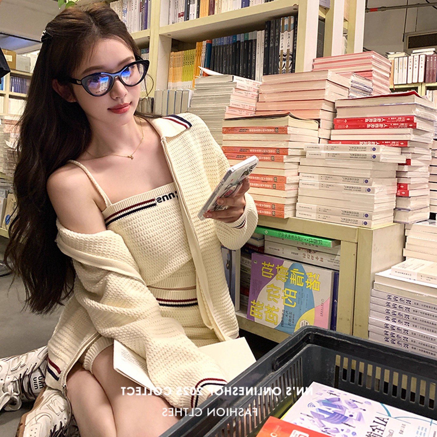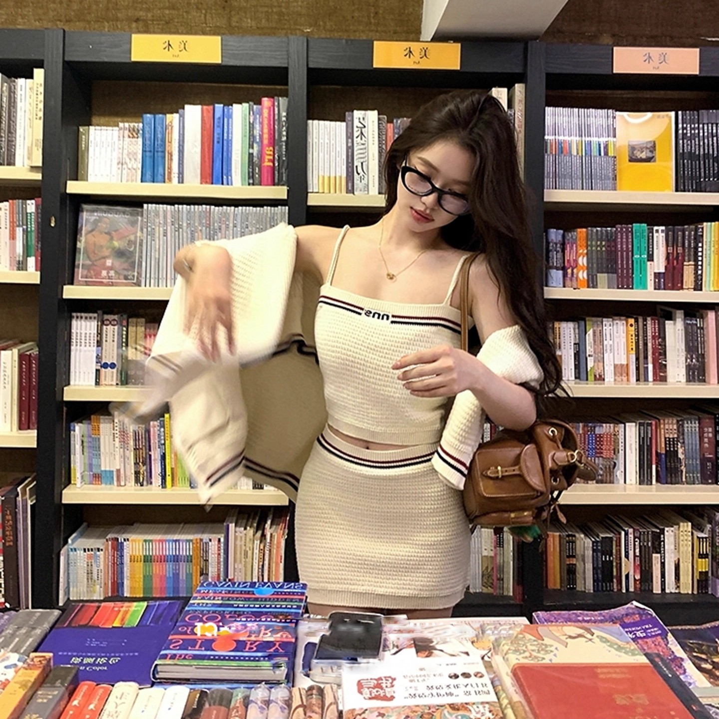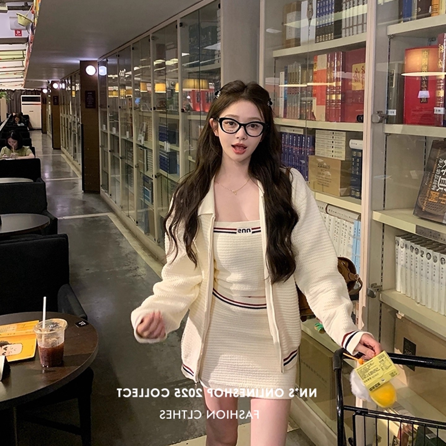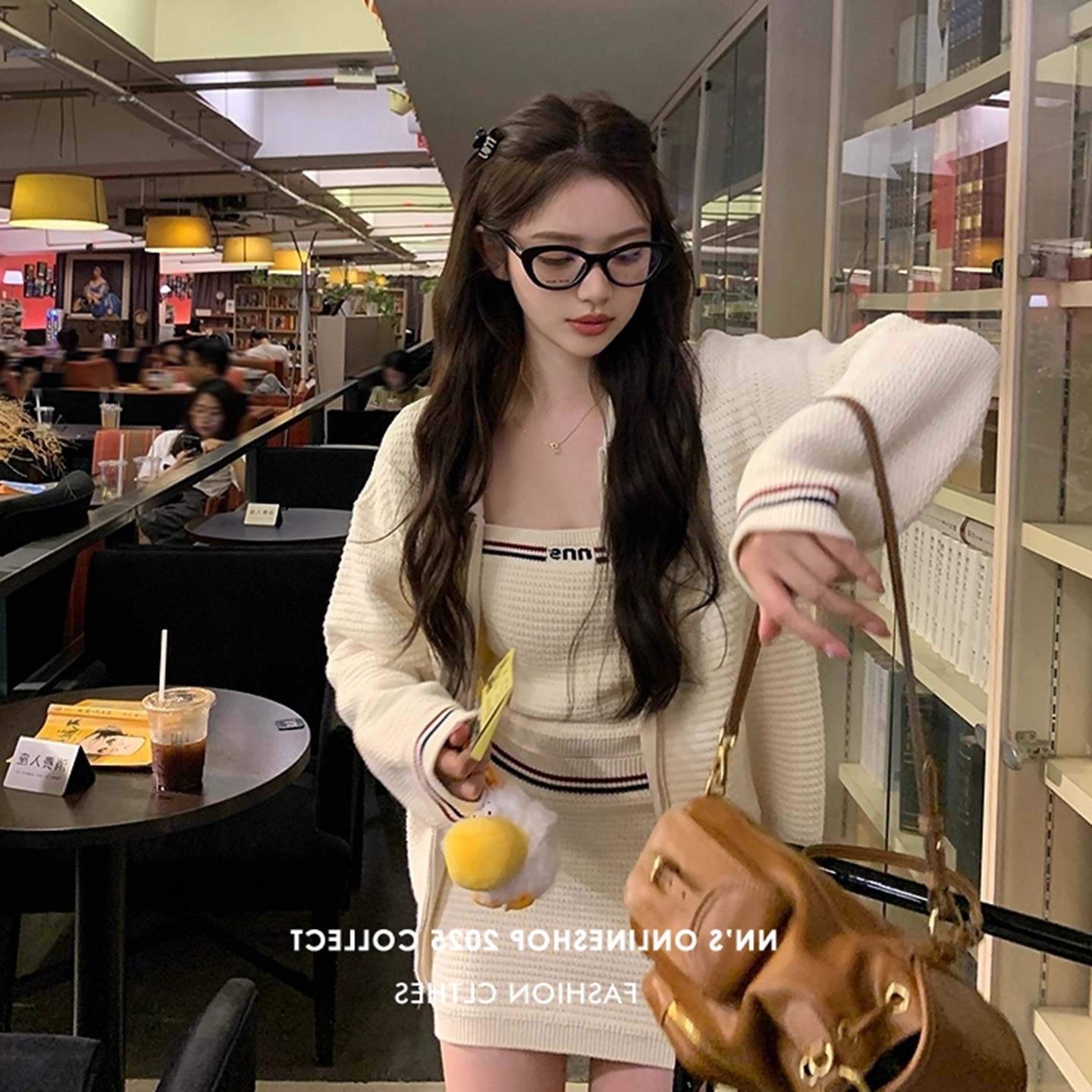 穿搭小香风针织开衫女2026春秋新款辣妹气质吊带包臂半裙三件套