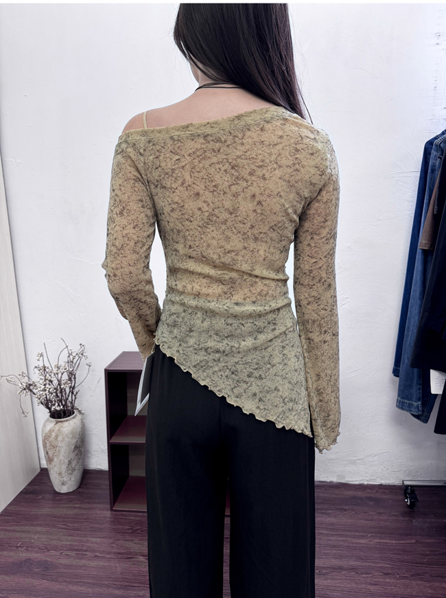韩银秋季新款法式复古晕染斜领不规则下摆上衣长袖网纱小衫