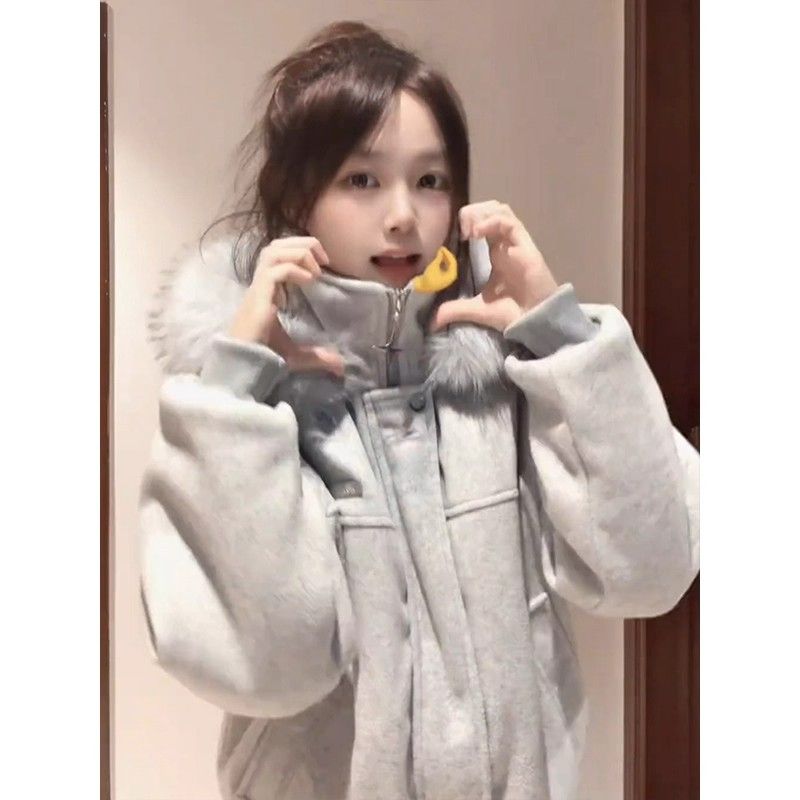 灰色大毛领连帽棉服男女款冬季美式复古毛呢保暖立领外套短款棉衣