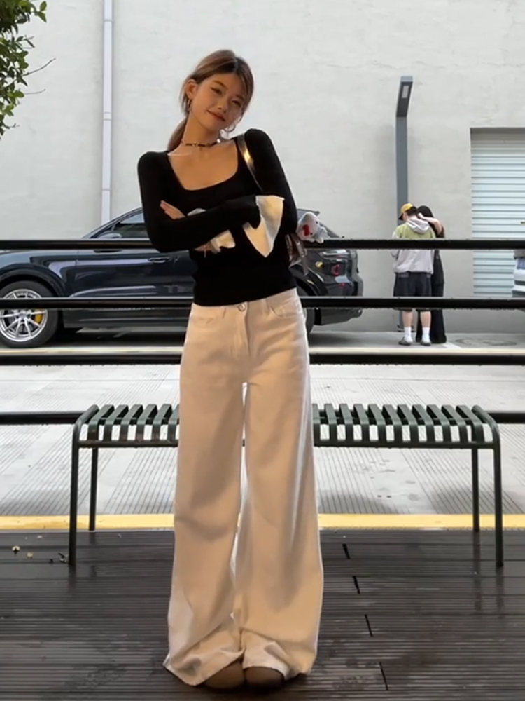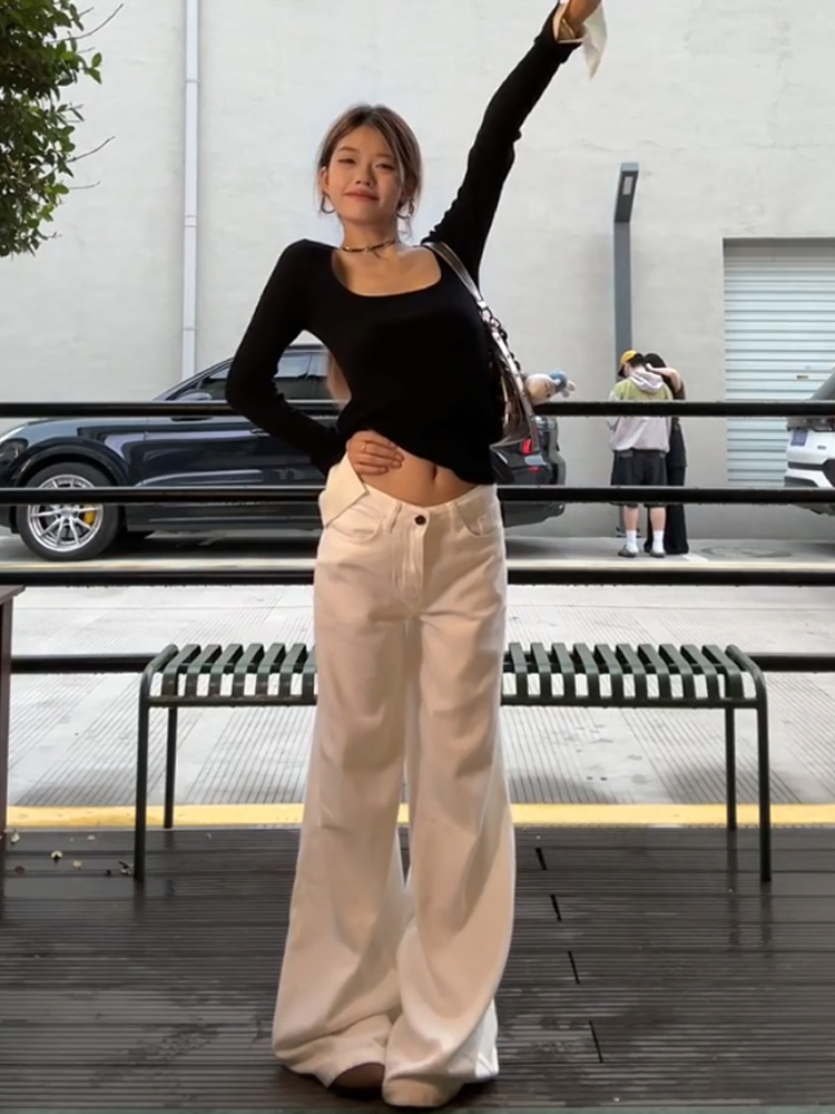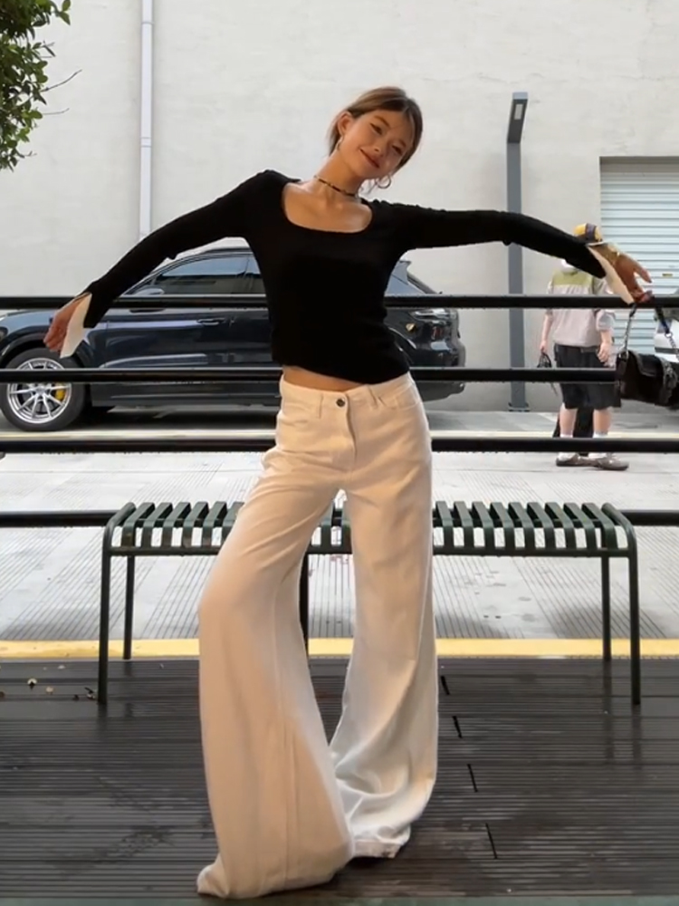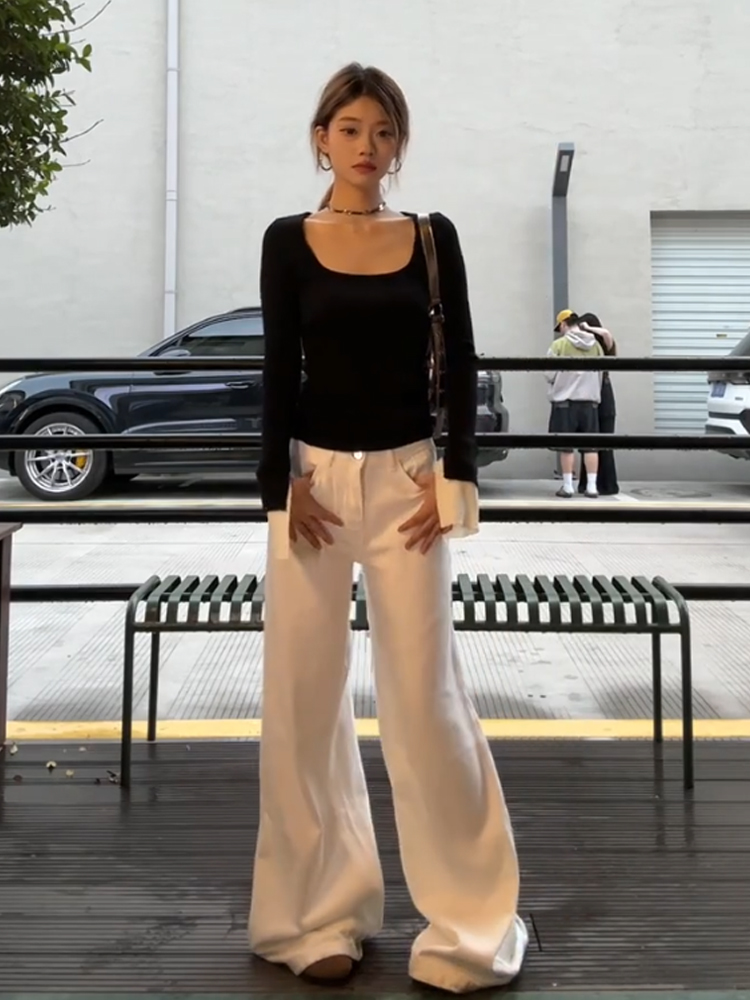 秋冬韩版设计感气质修身显瘦百搭方领长袖针织T恤上衣女