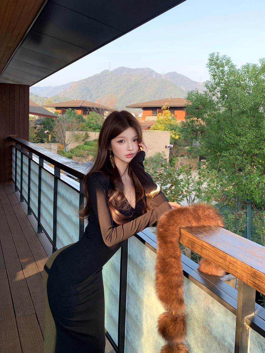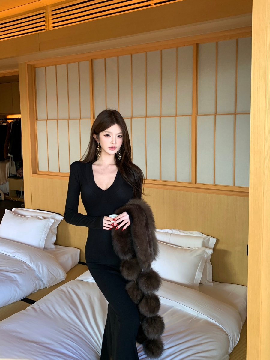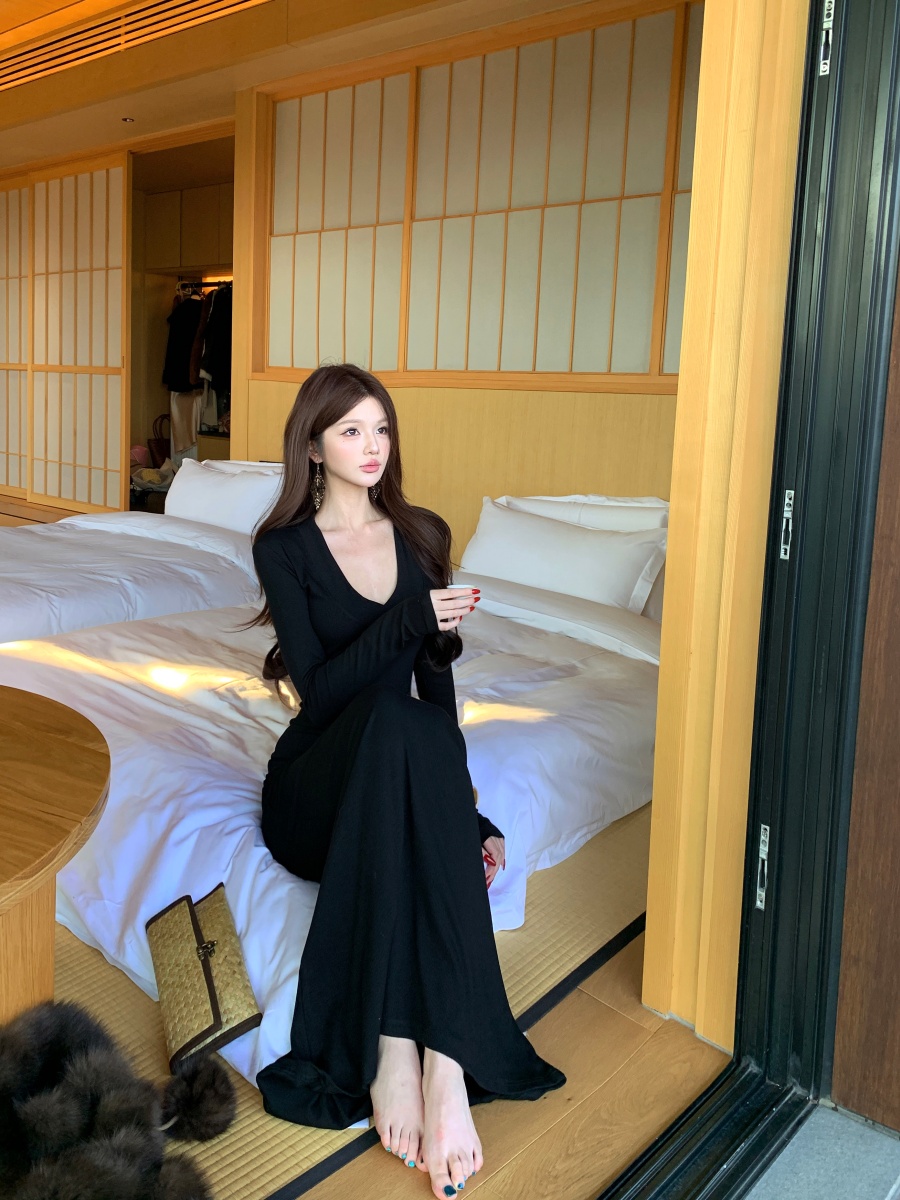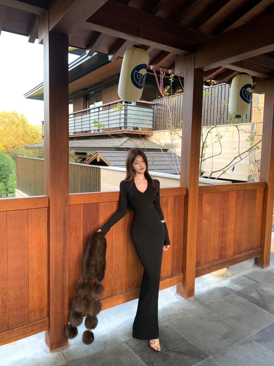 实价实拍 V领精致修身内搭裙长袖长裙显身材