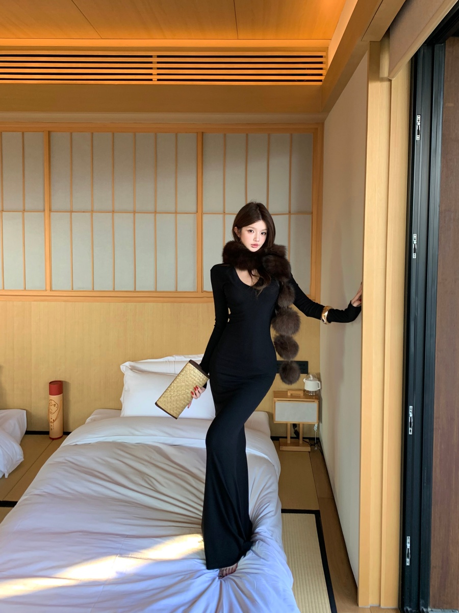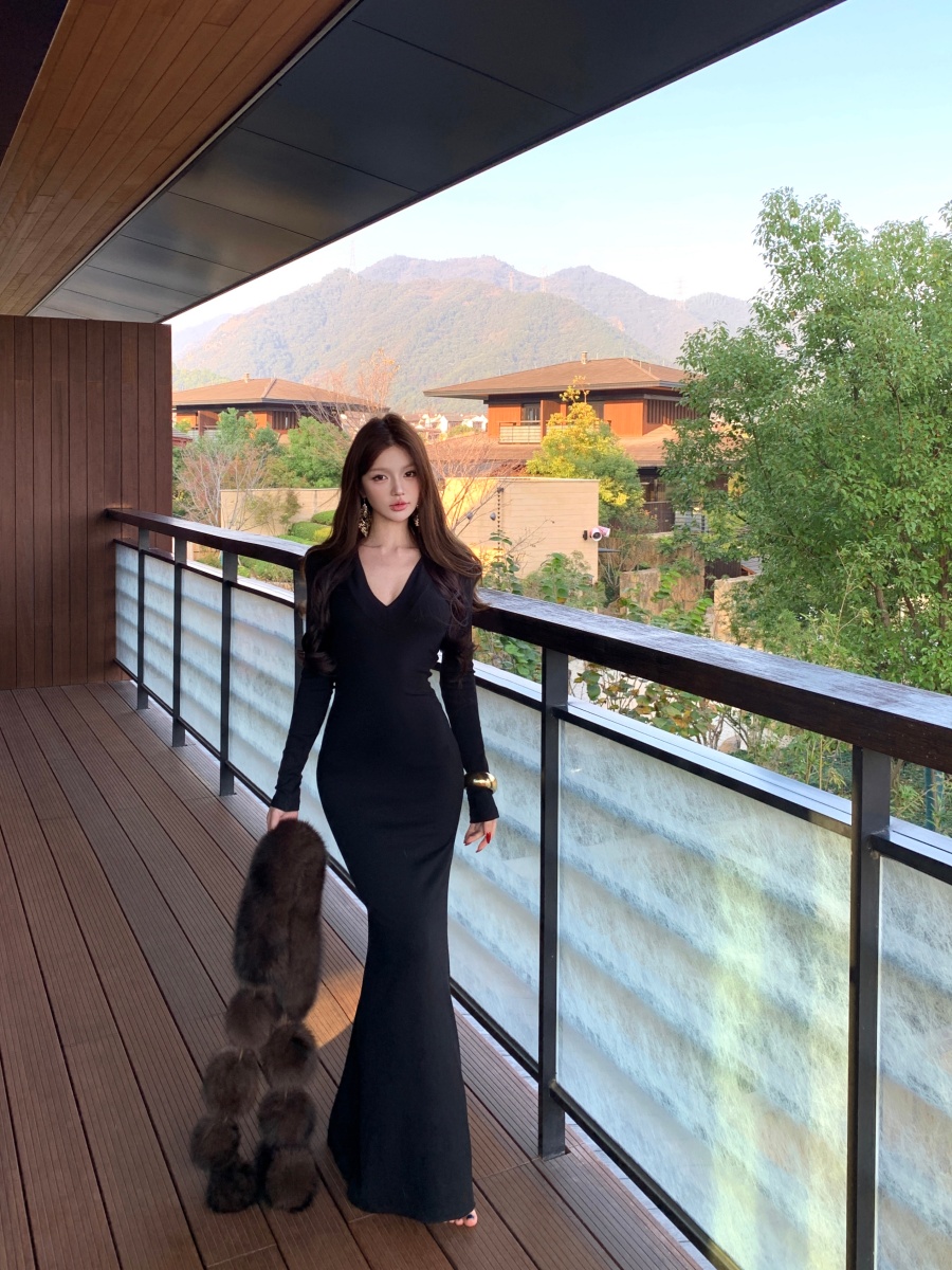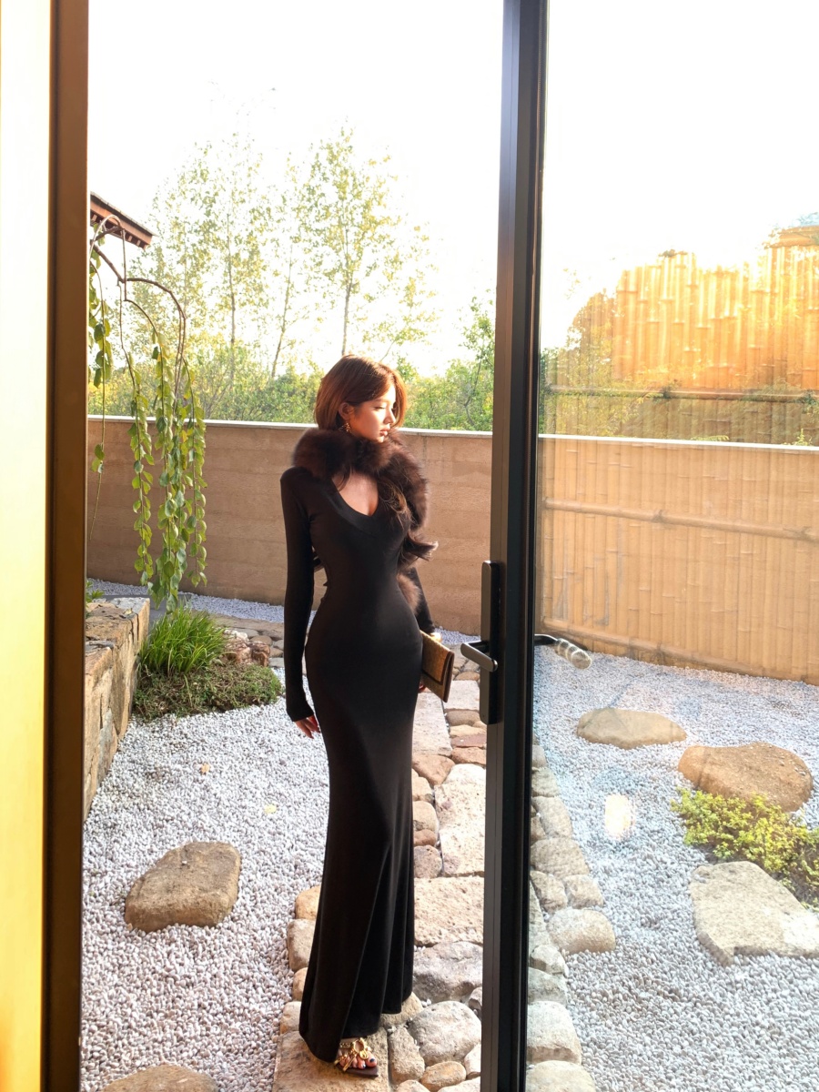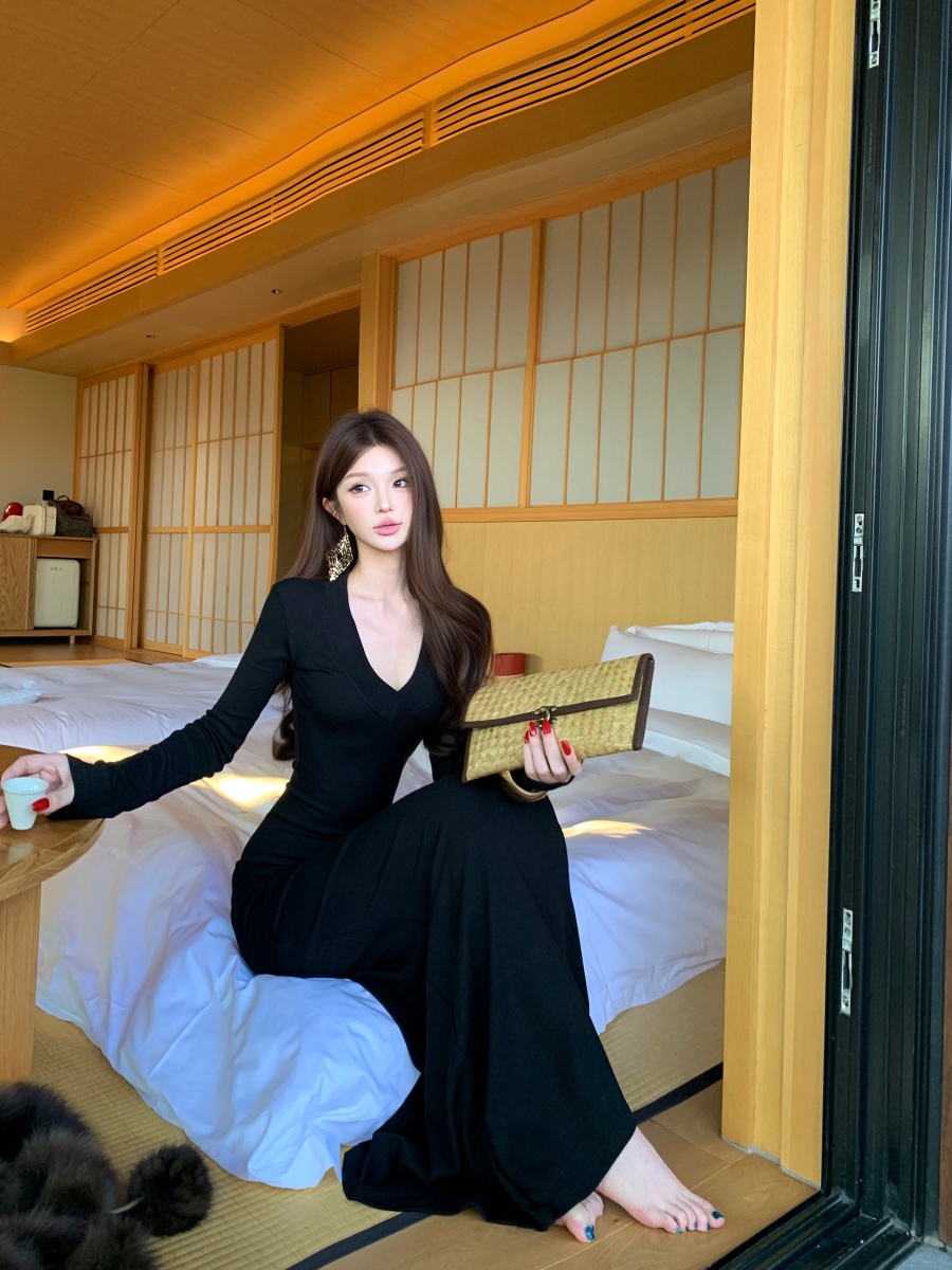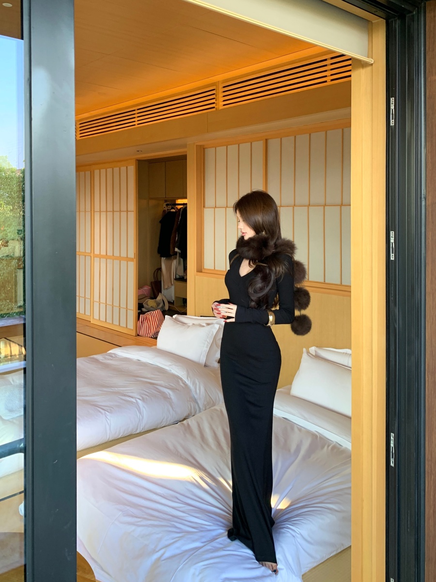 实价实拍 V领精致修身内搭裙长袖长裙显身材