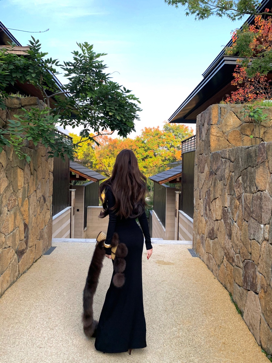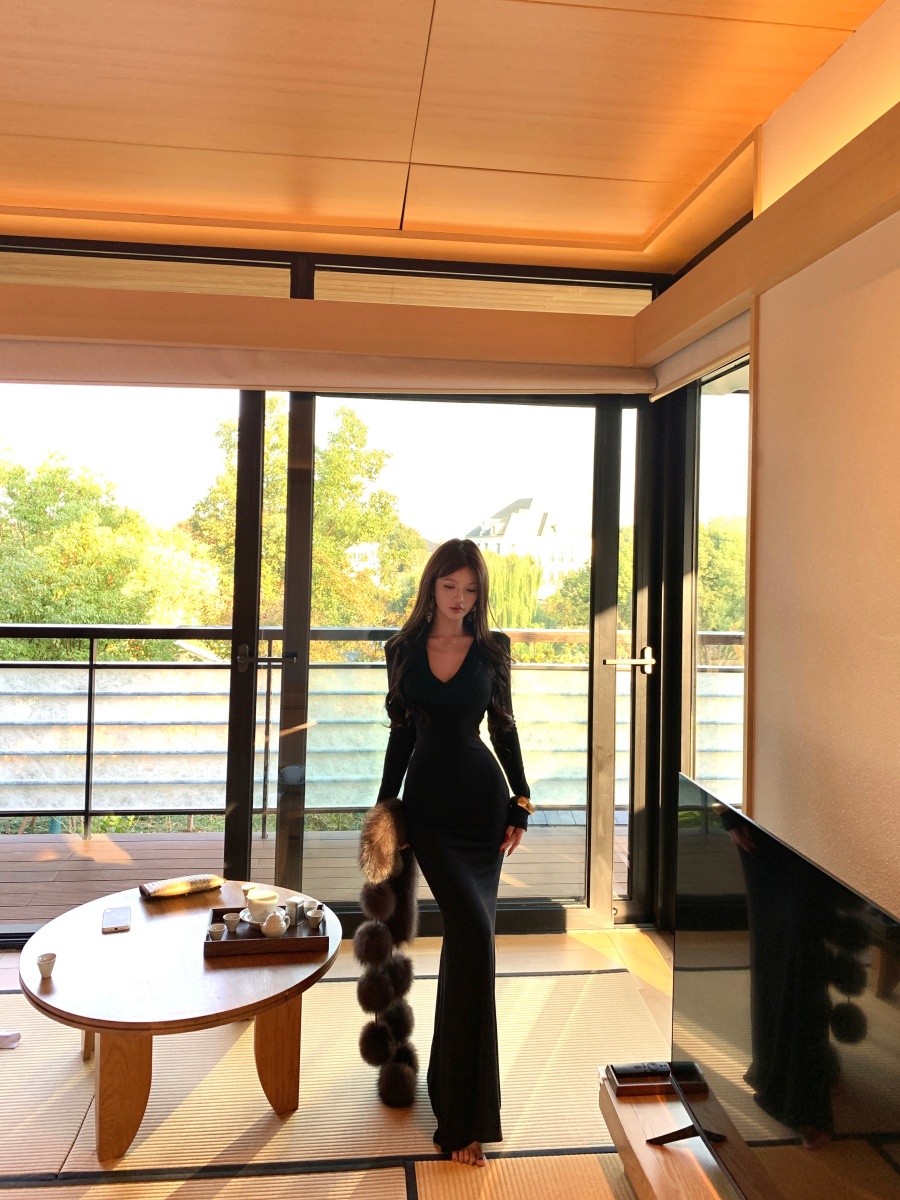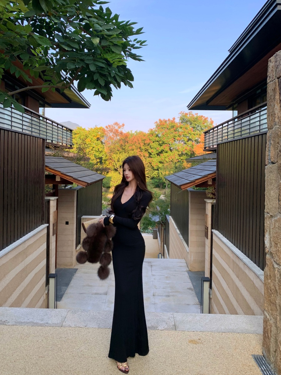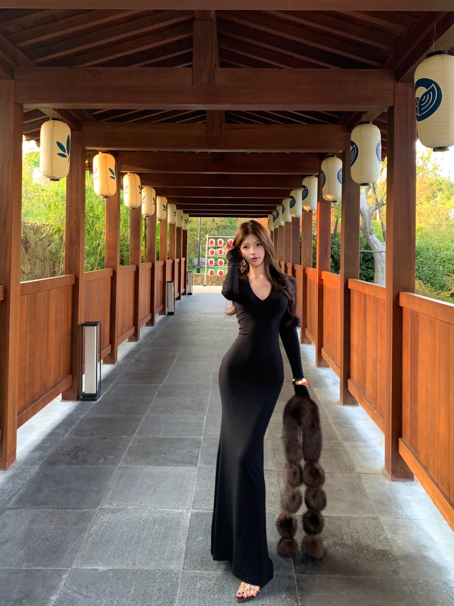 实价实拍 V领精致修身内搭裙长袖长裙显身材