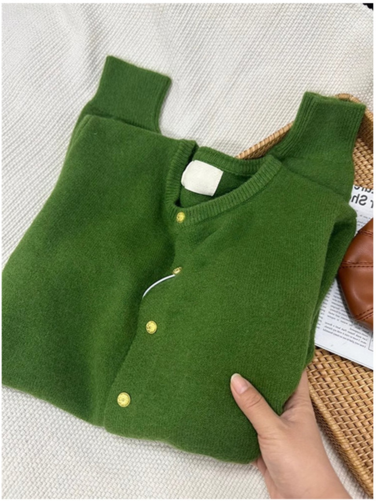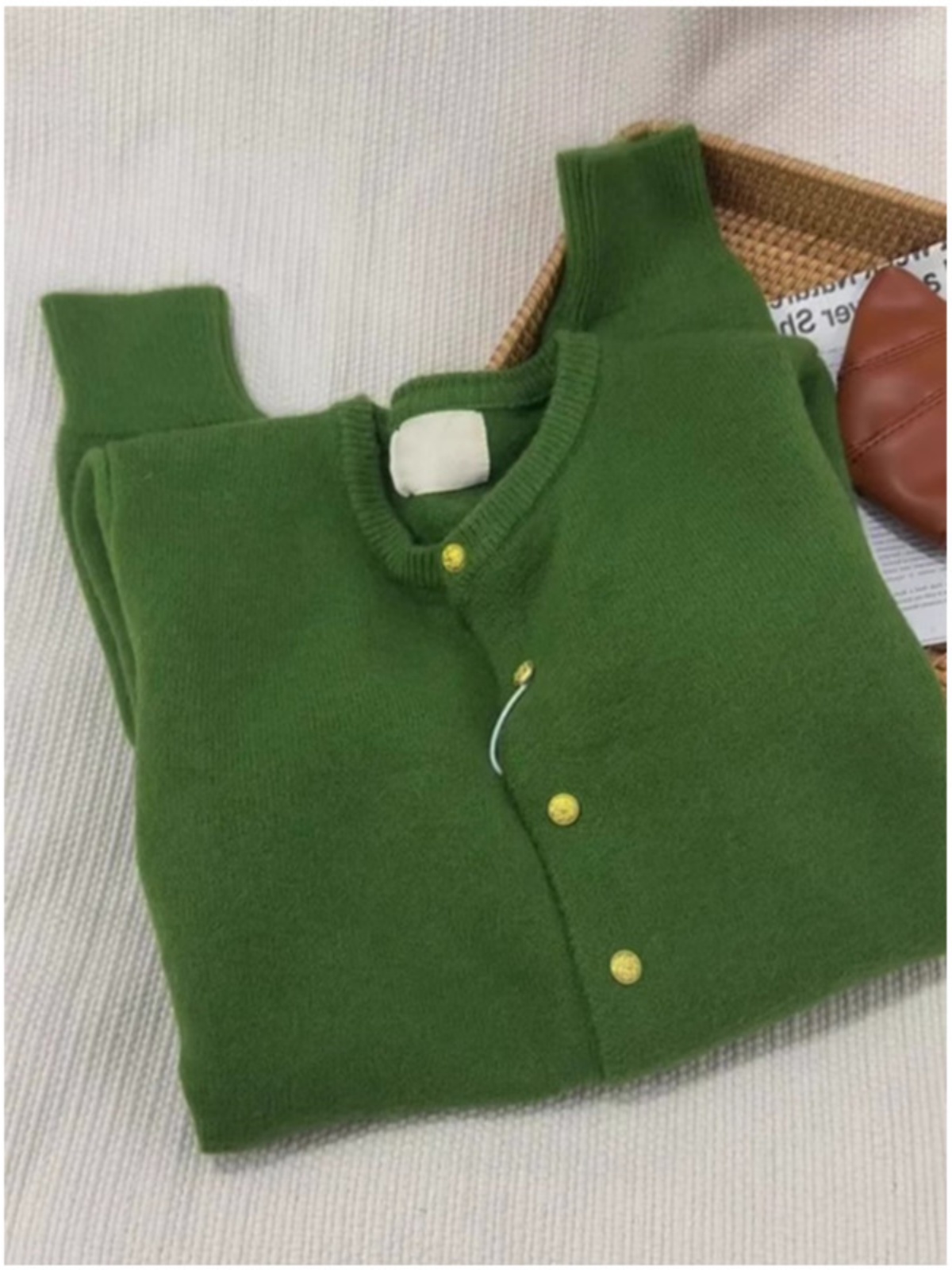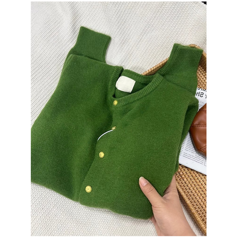 杭州四季青女装桐乡濮院绿色小金扣圆领针织开衫秋冬慵懒毛衣外套