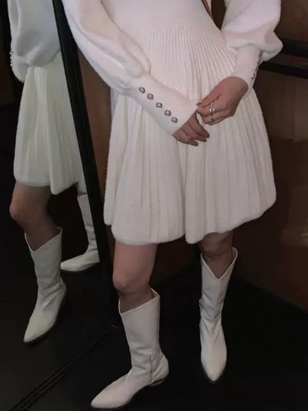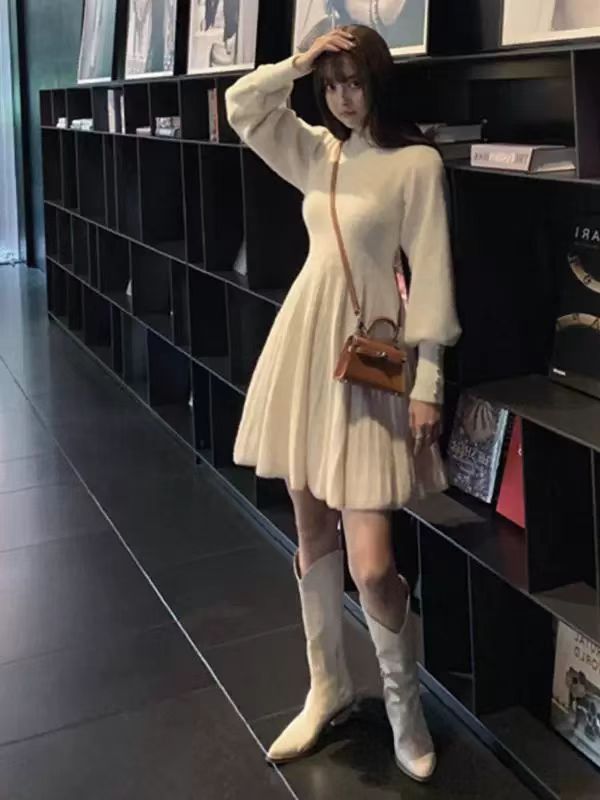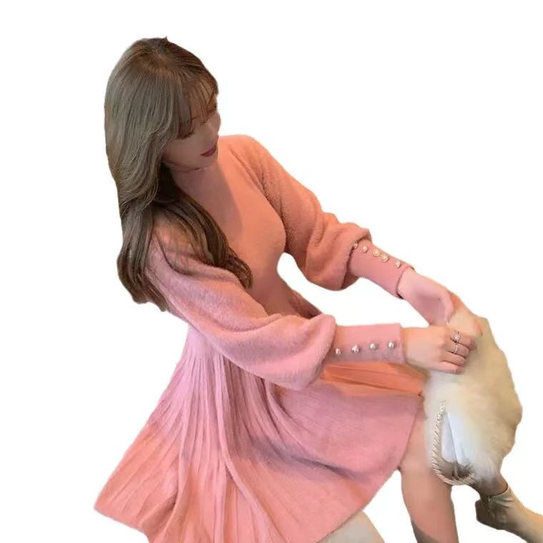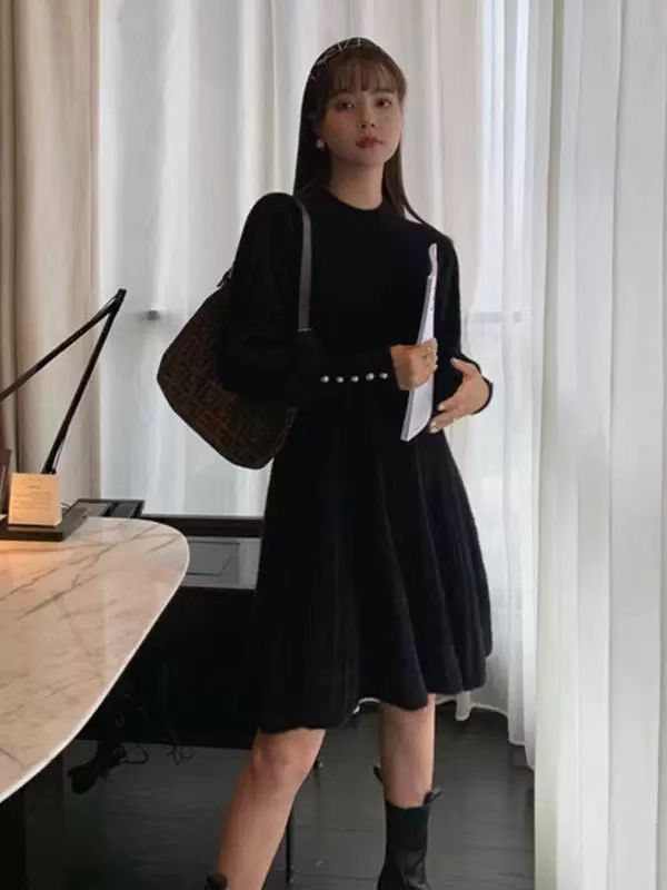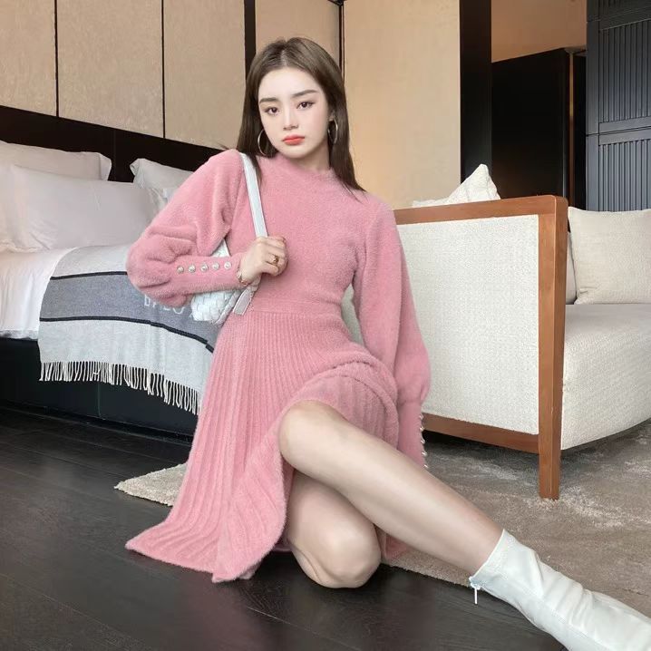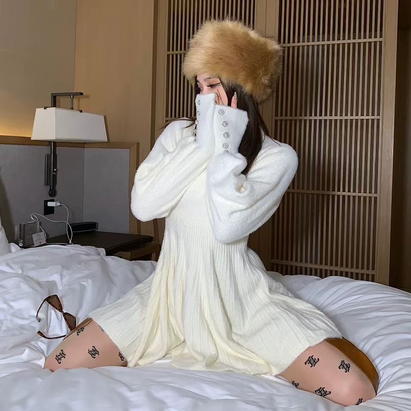 韩国仿貂毛高级感小个子显高针织连衣裙收腰显瘦OL打底毛衣裙