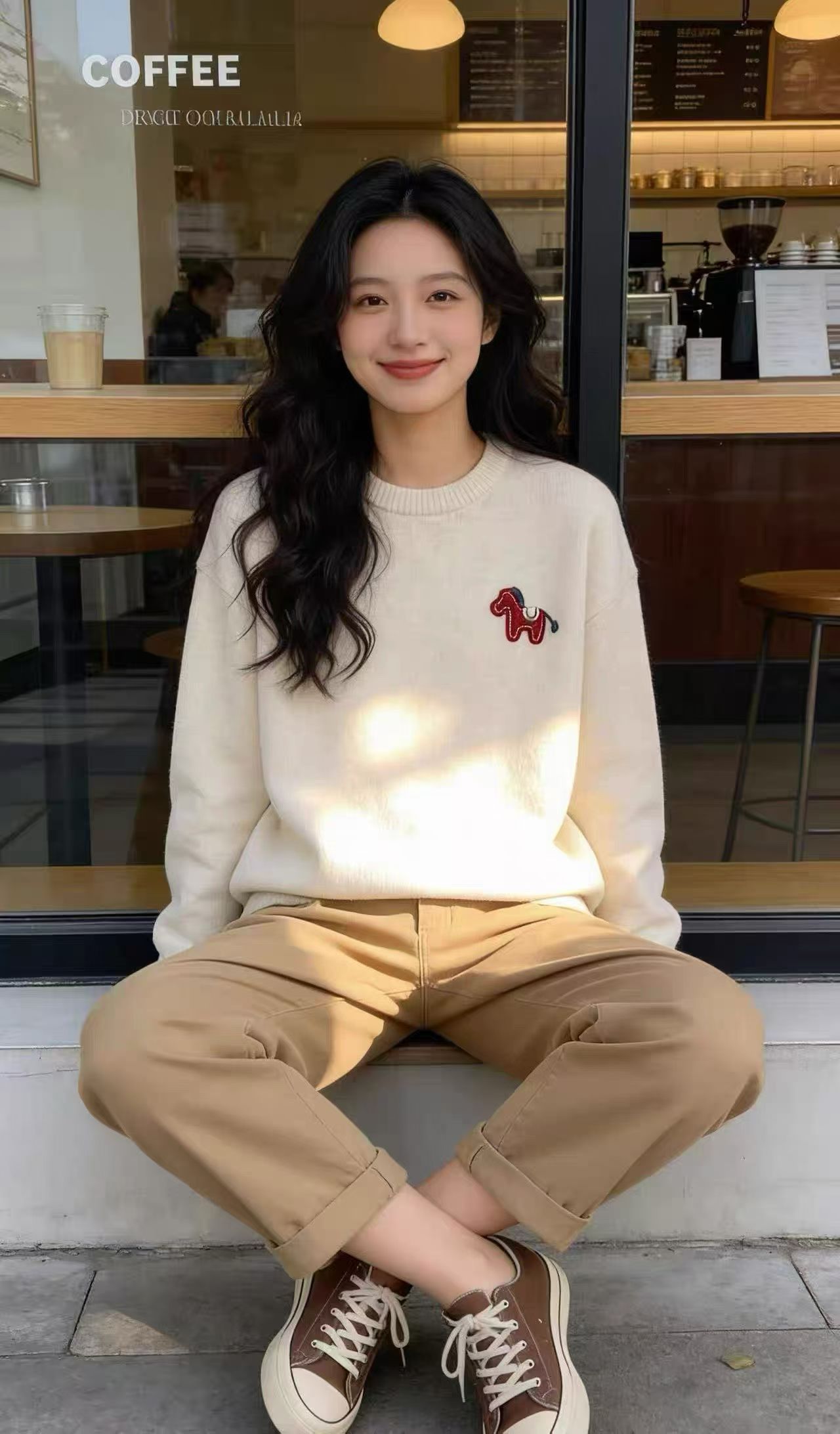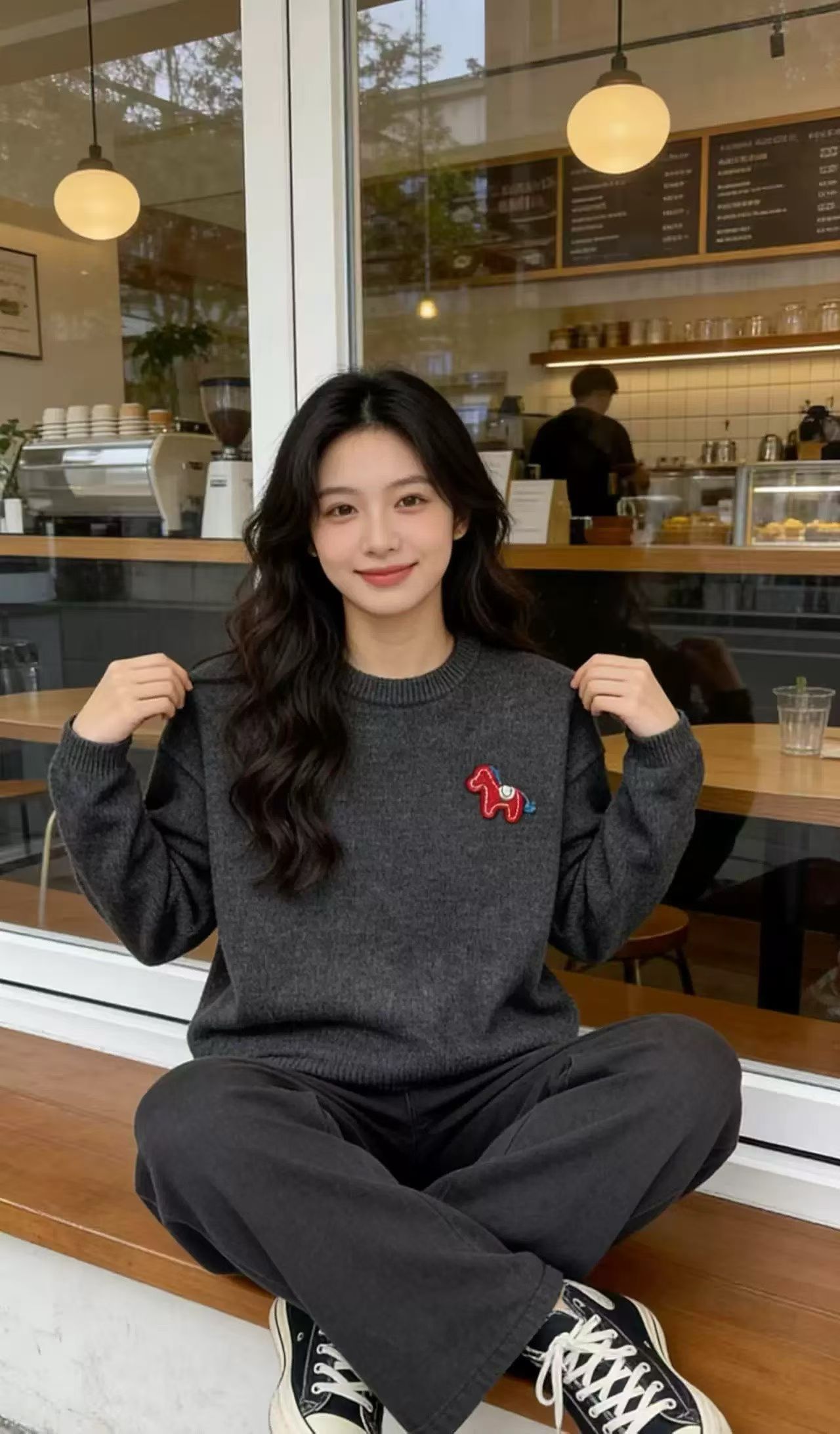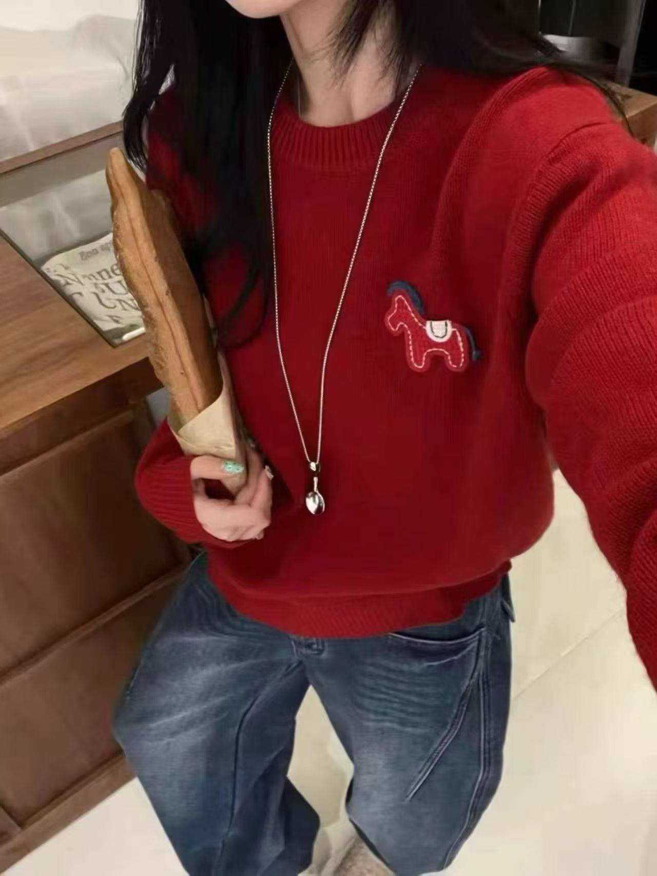 2025冬装新款多巴胺圆领刺绣小马针织衫女宽松显瘦毛衣上衣
