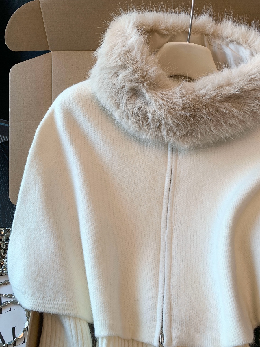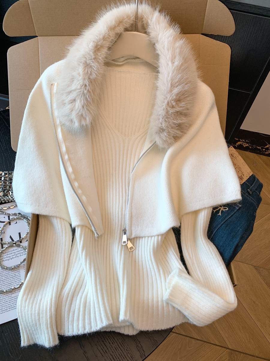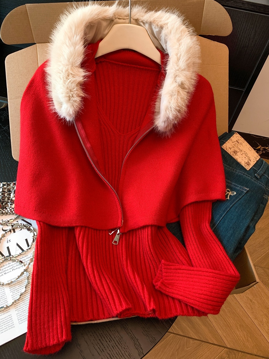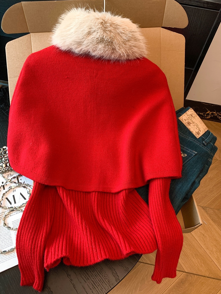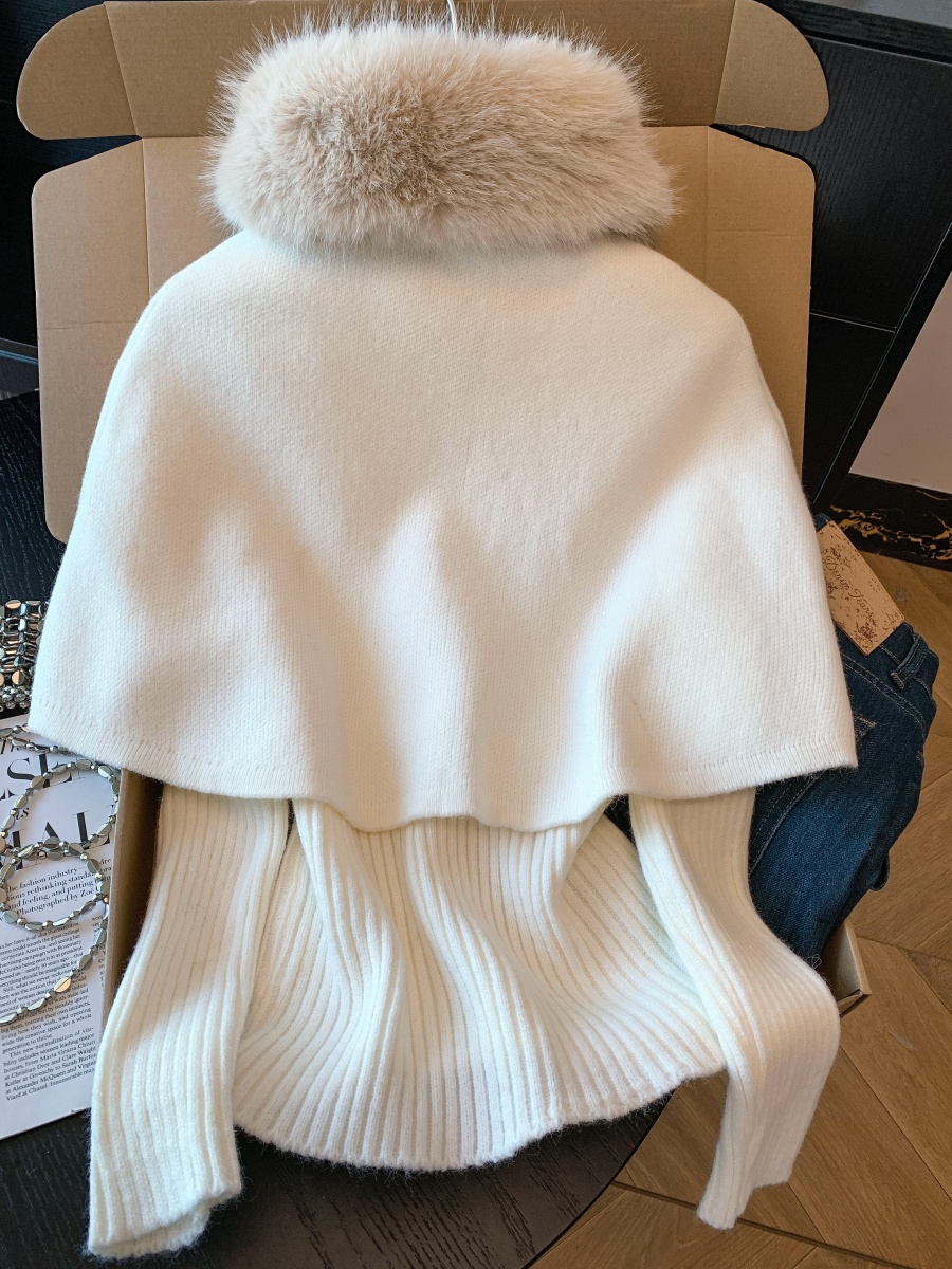 实拍法式温柔斗篷可拆卸毛领三件套毛衣套装秋冬氛围感针织衫上衣