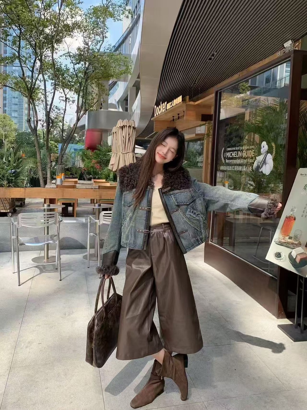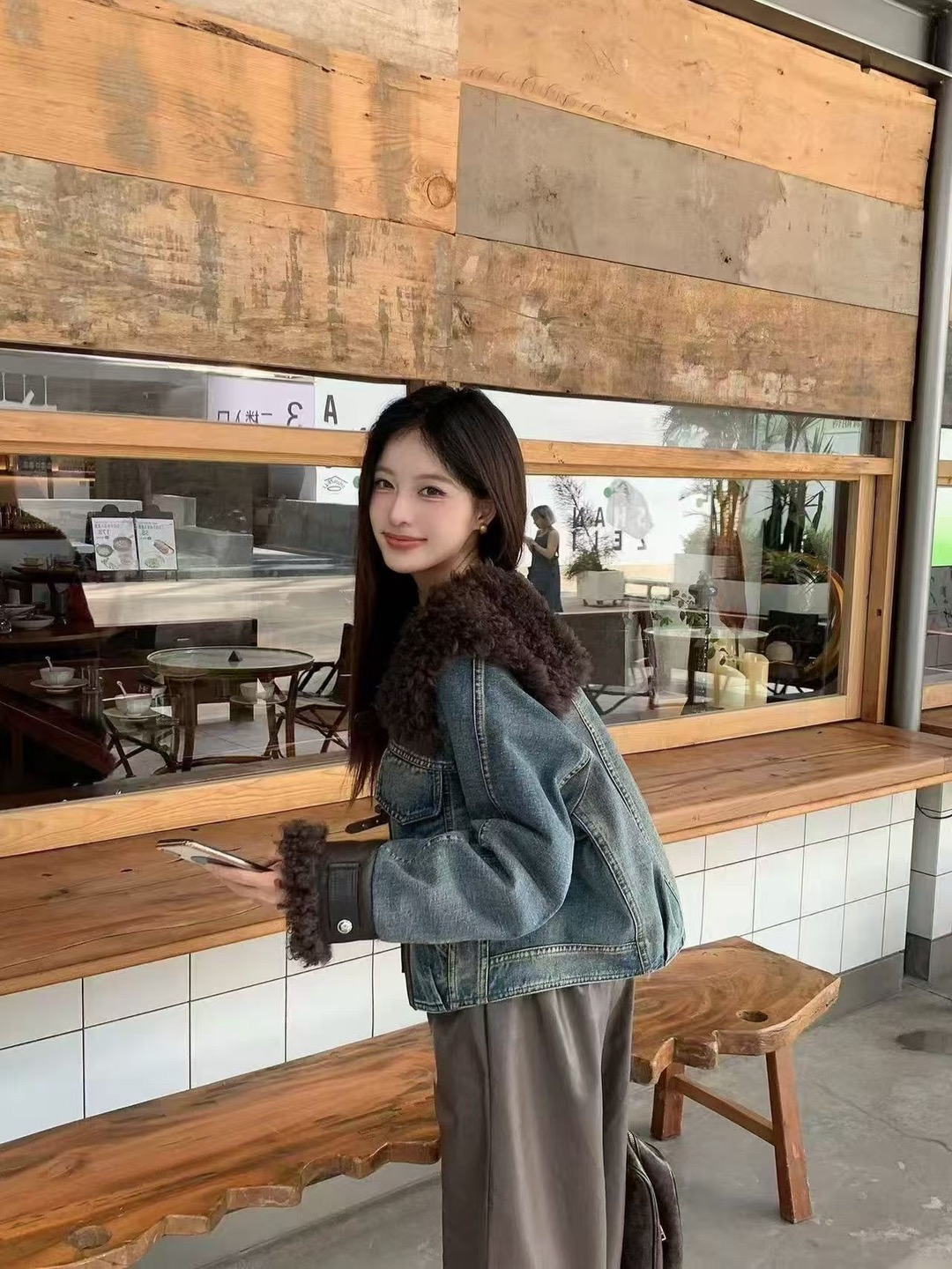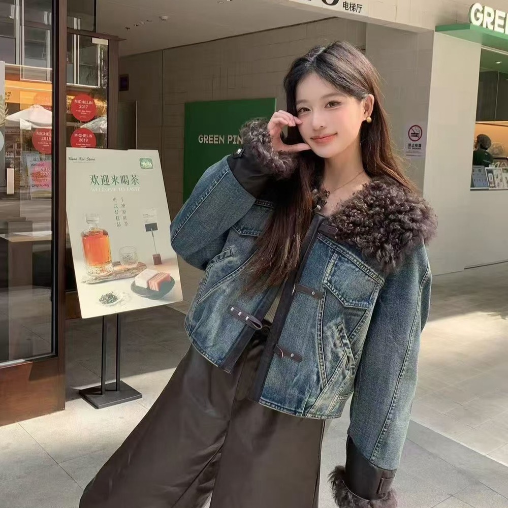 已出货皮毛一体牛仔外套女秋冬时尚复古羊卷毛羽绒内胆皮草上衣