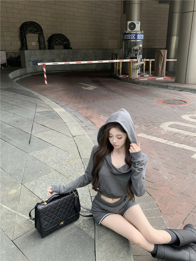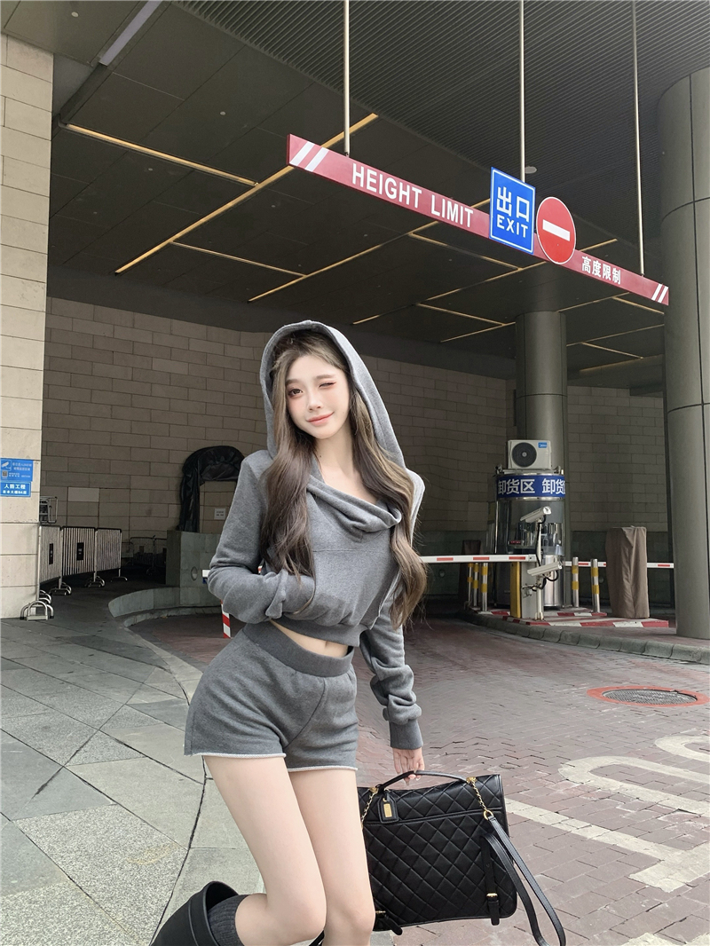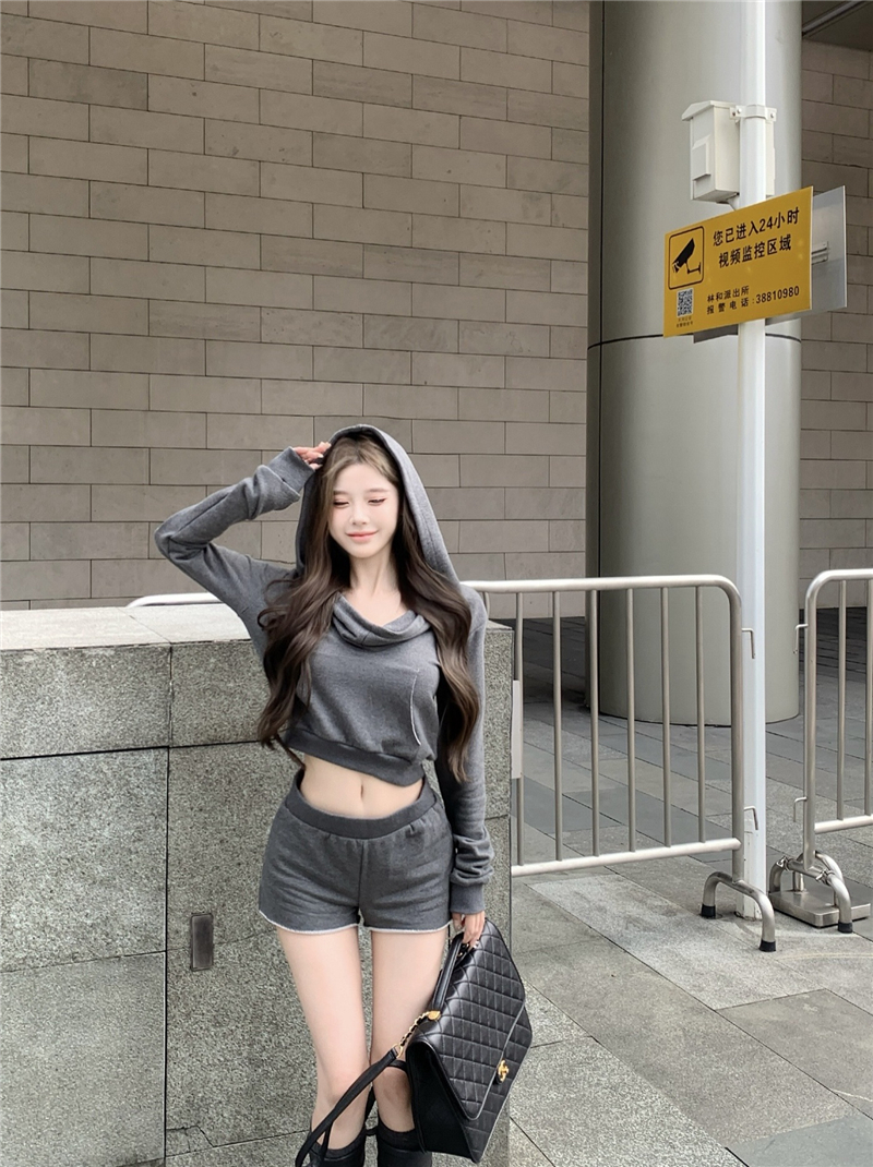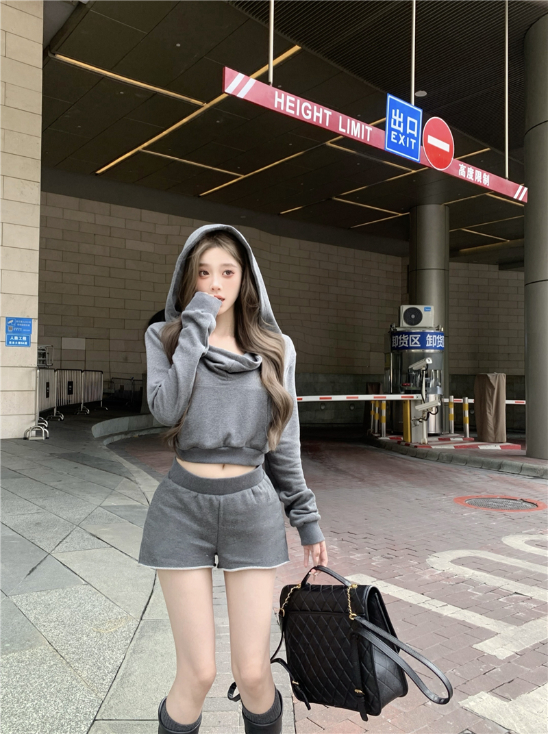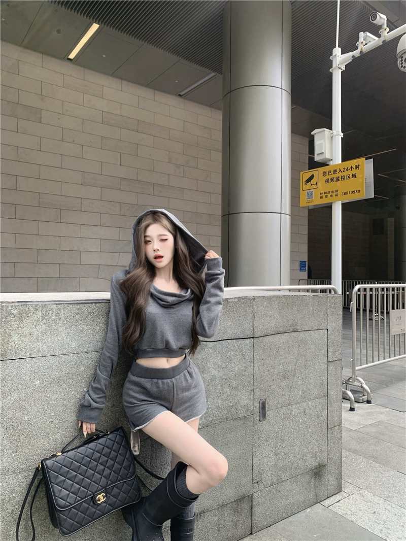 实价实拍套装女春季连帽荡领卫衣灰色短款两件套