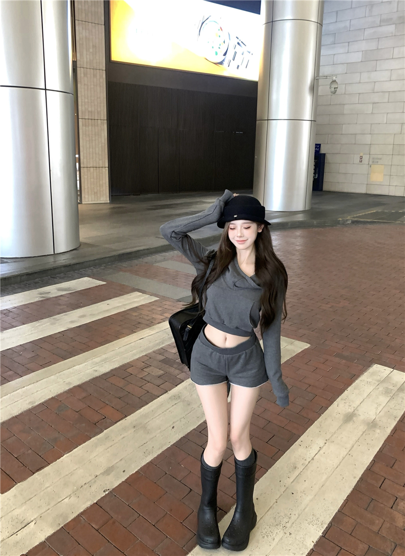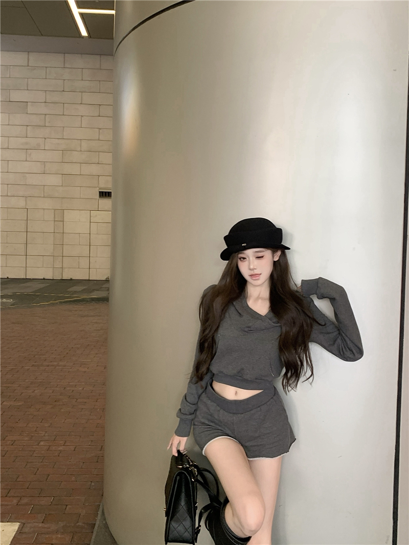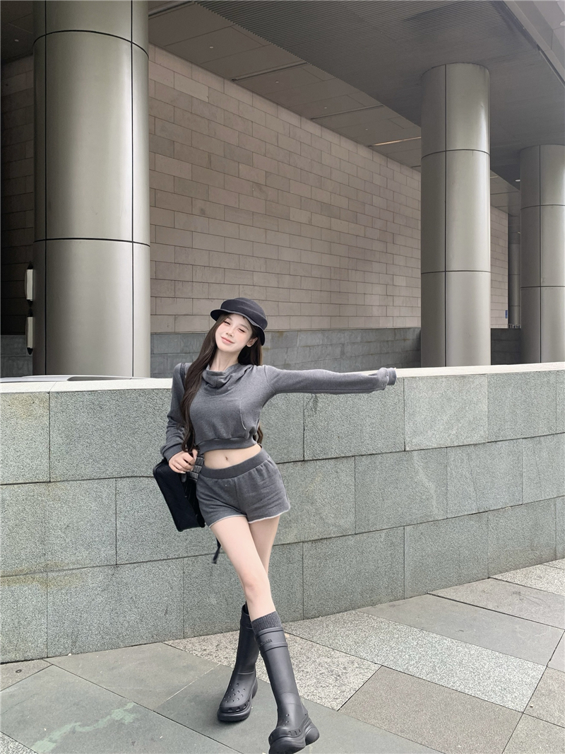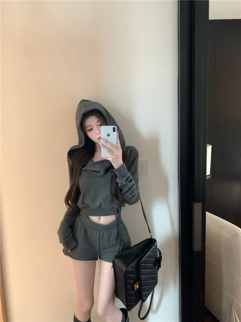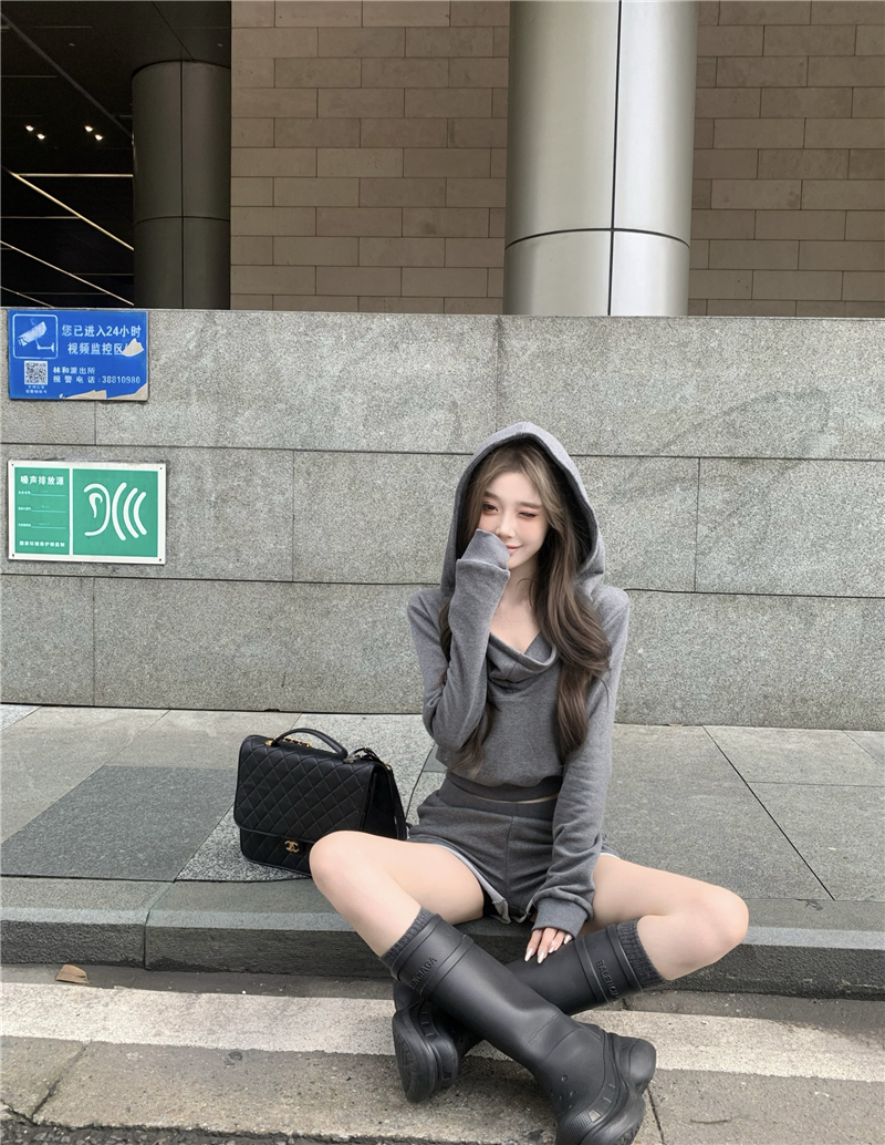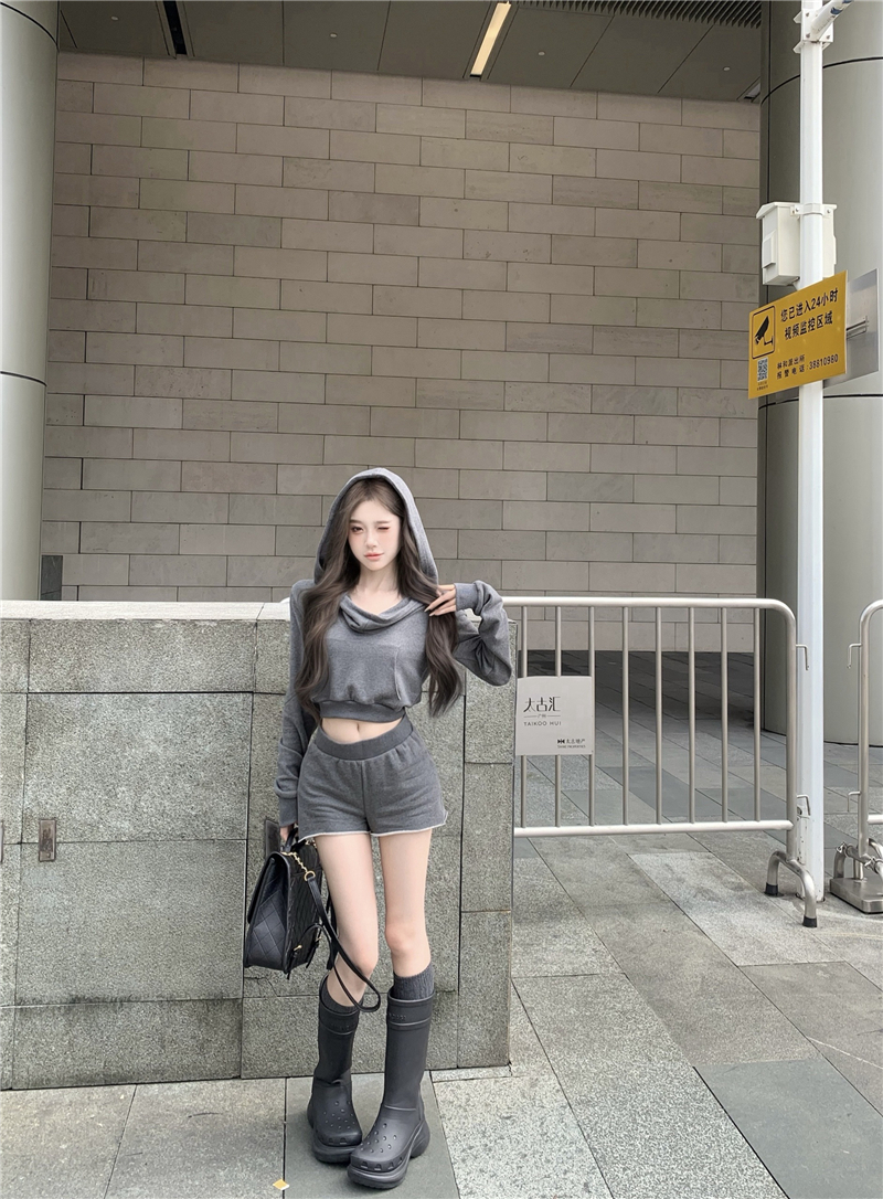 实价实拍套装女春季连帽荡领卫衣灰色短款两件套