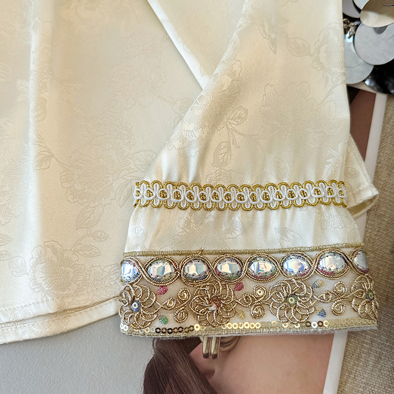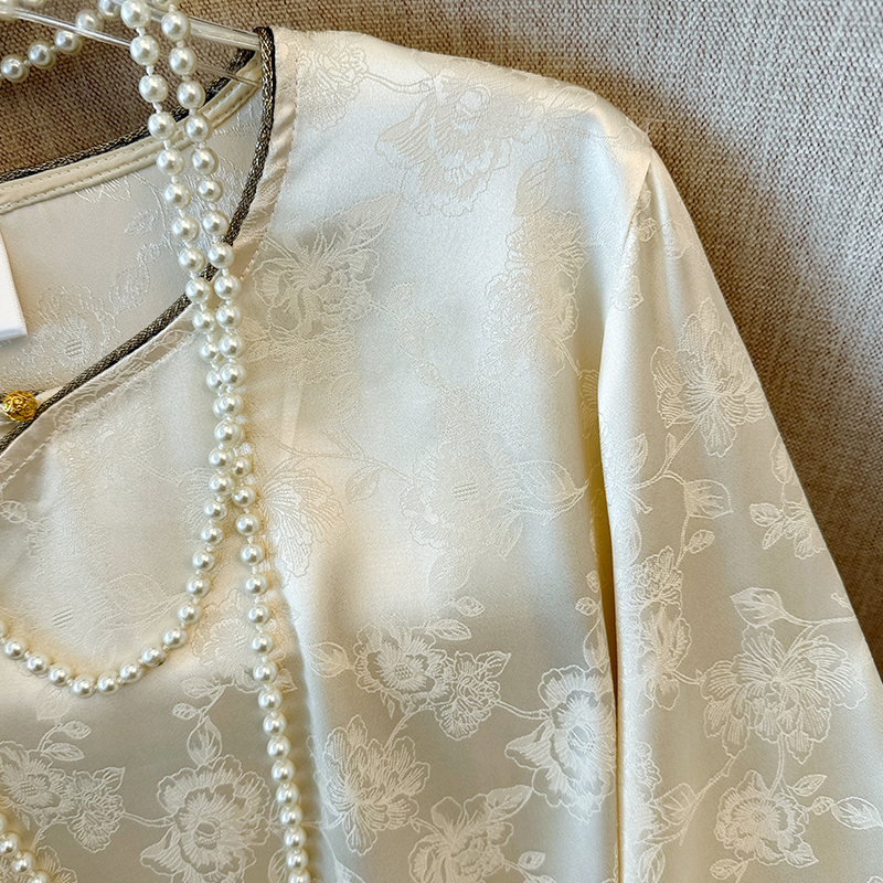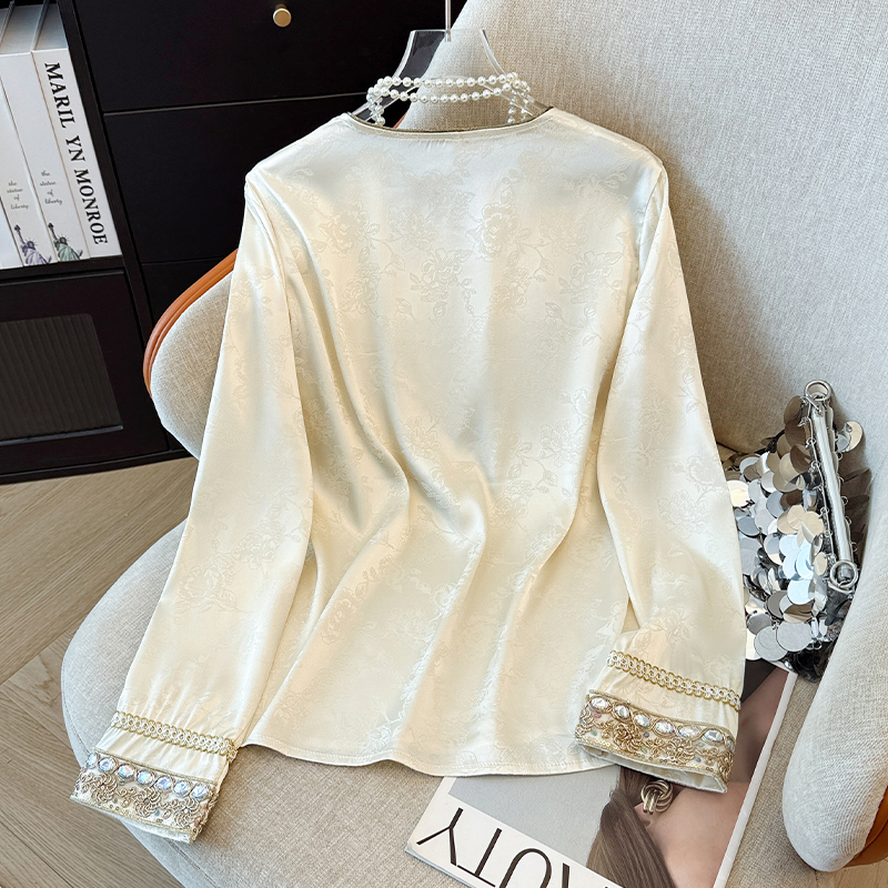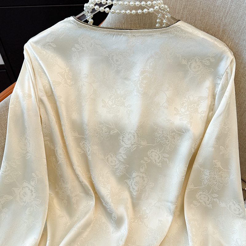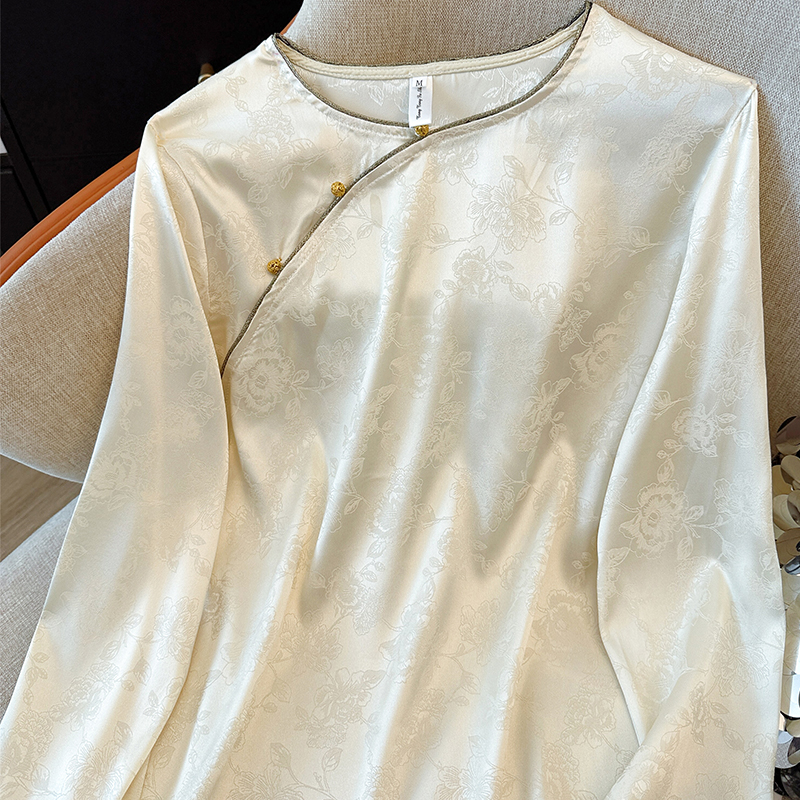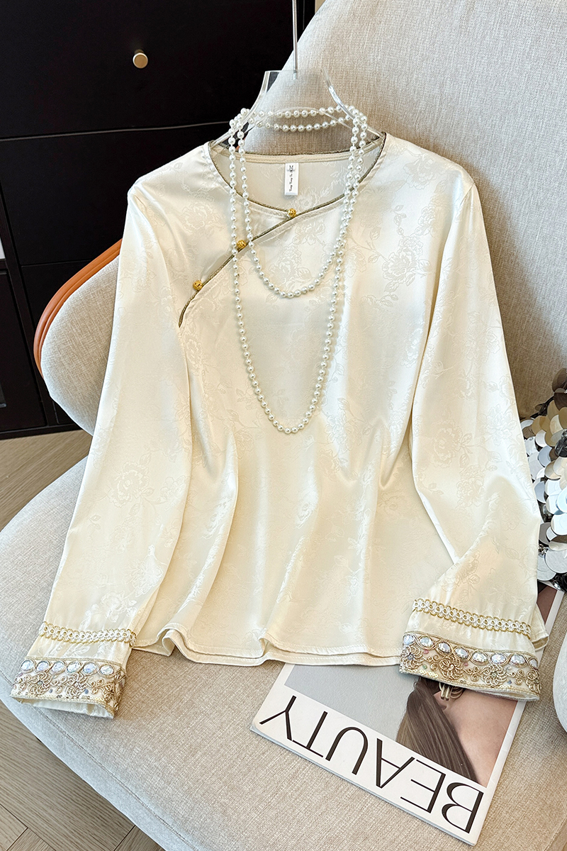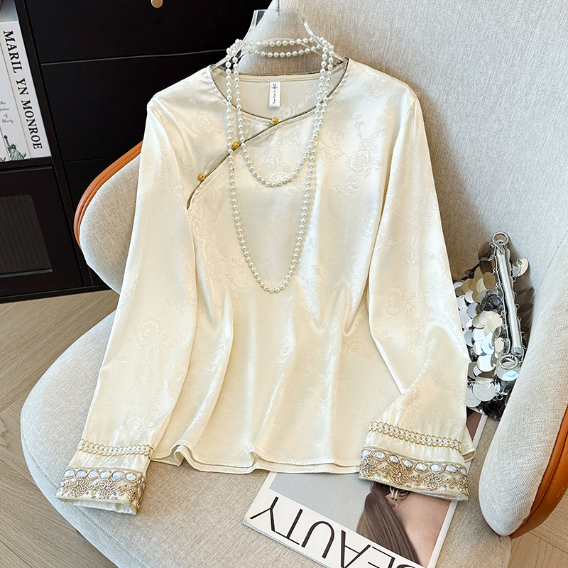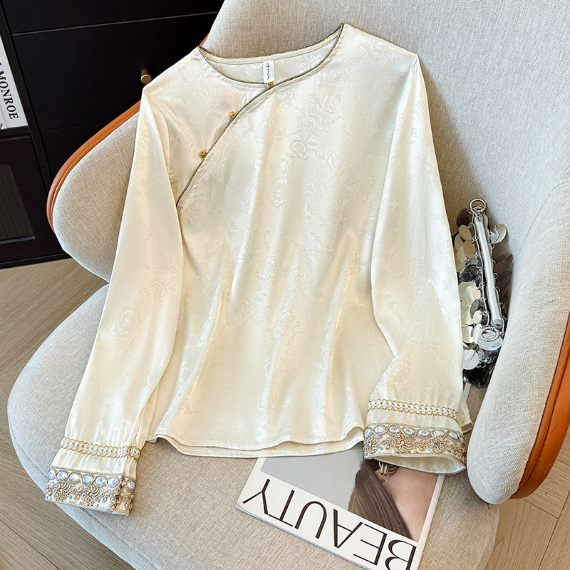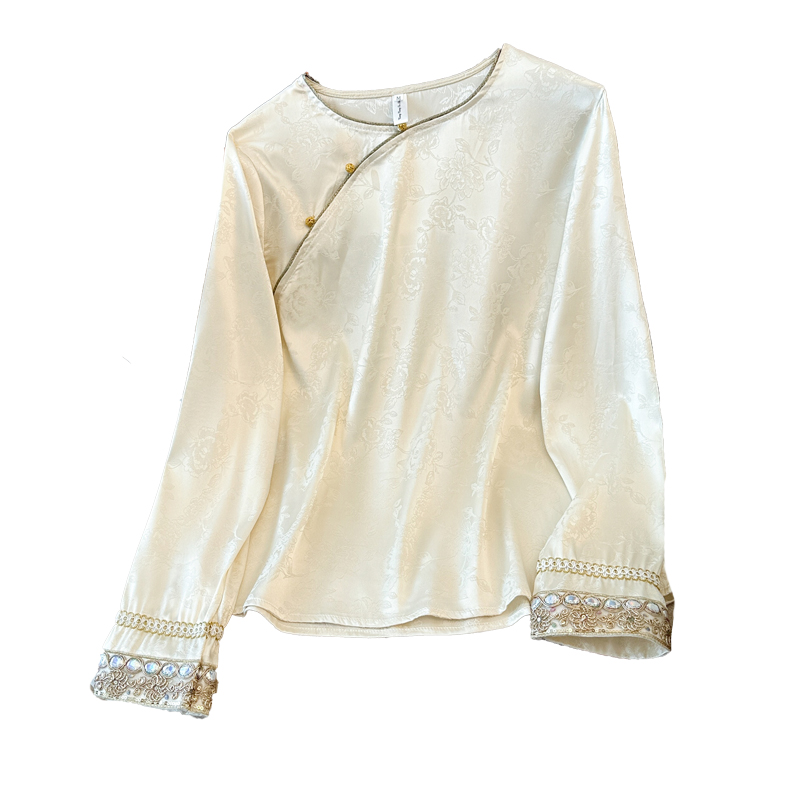 新中式缎面提花斜襟刺绣衬衫女2026早秋新款气质国风时髦内搭上衣