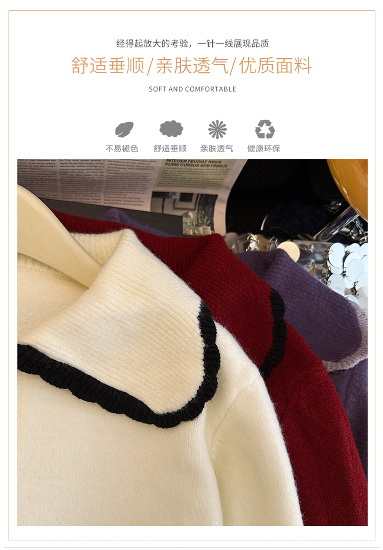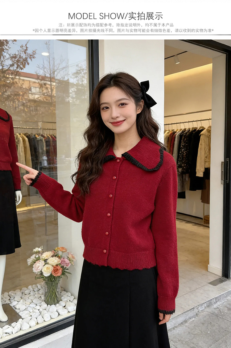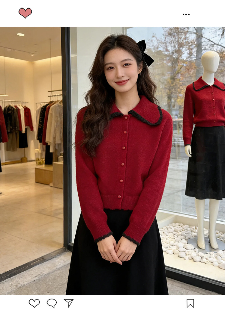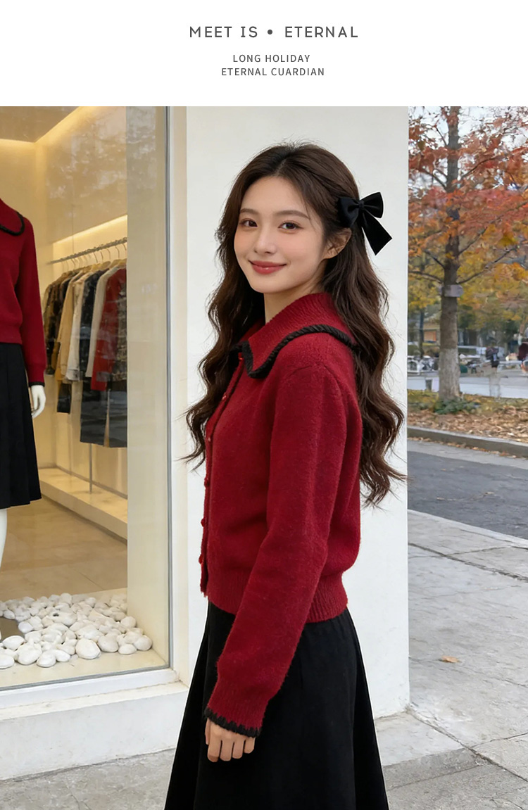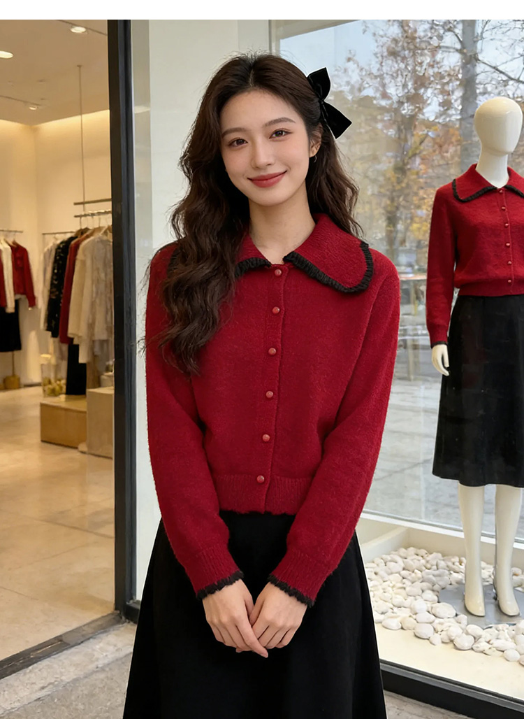 小香风新年红色翻领毛衣外套2025秋冬新款上衣甜美小个子针织开衫