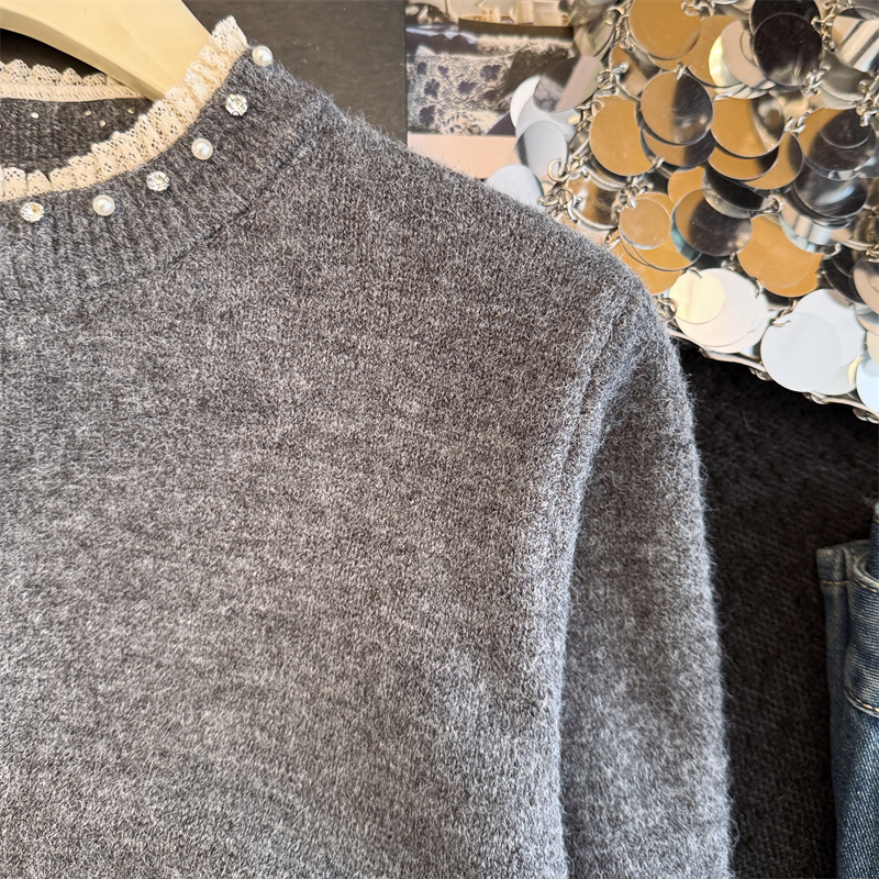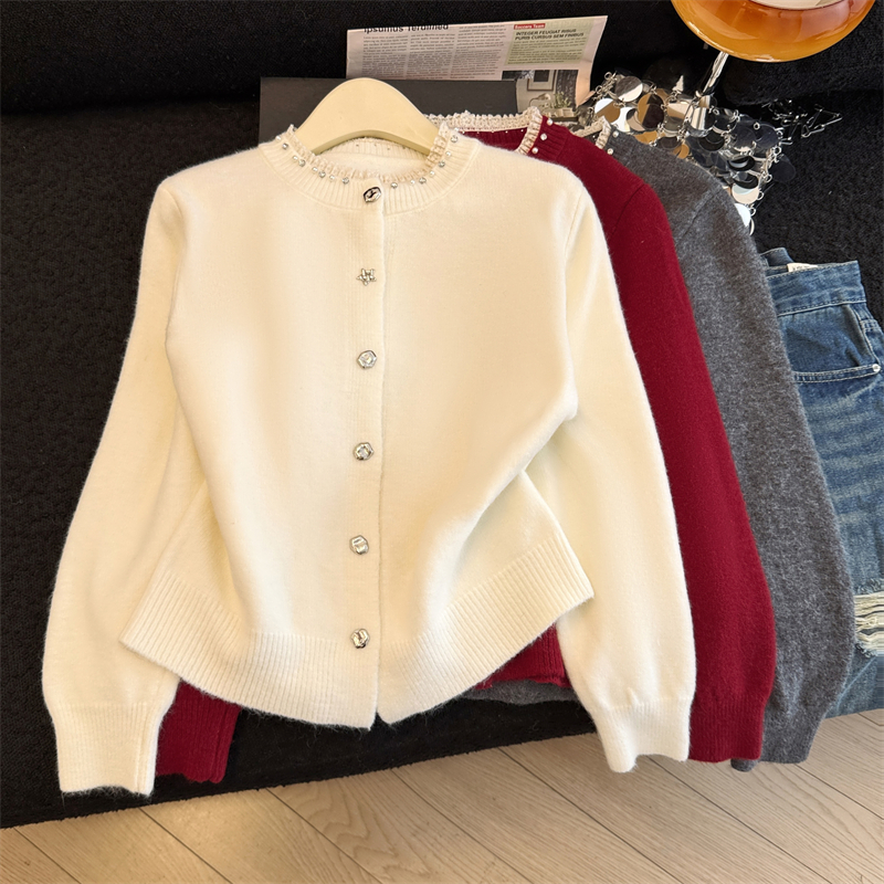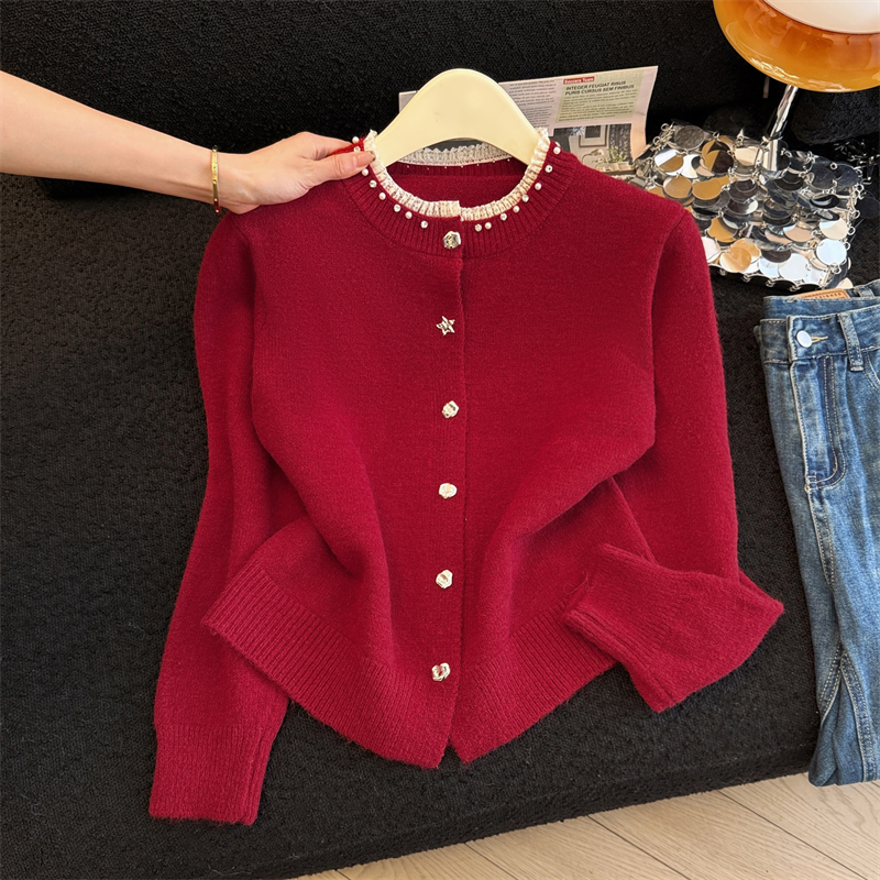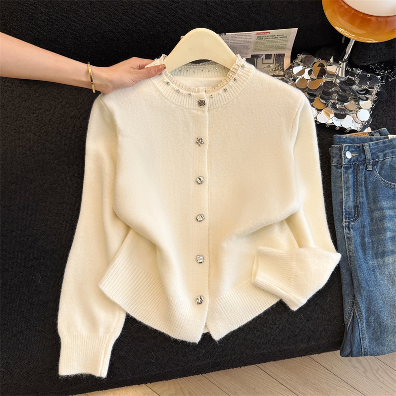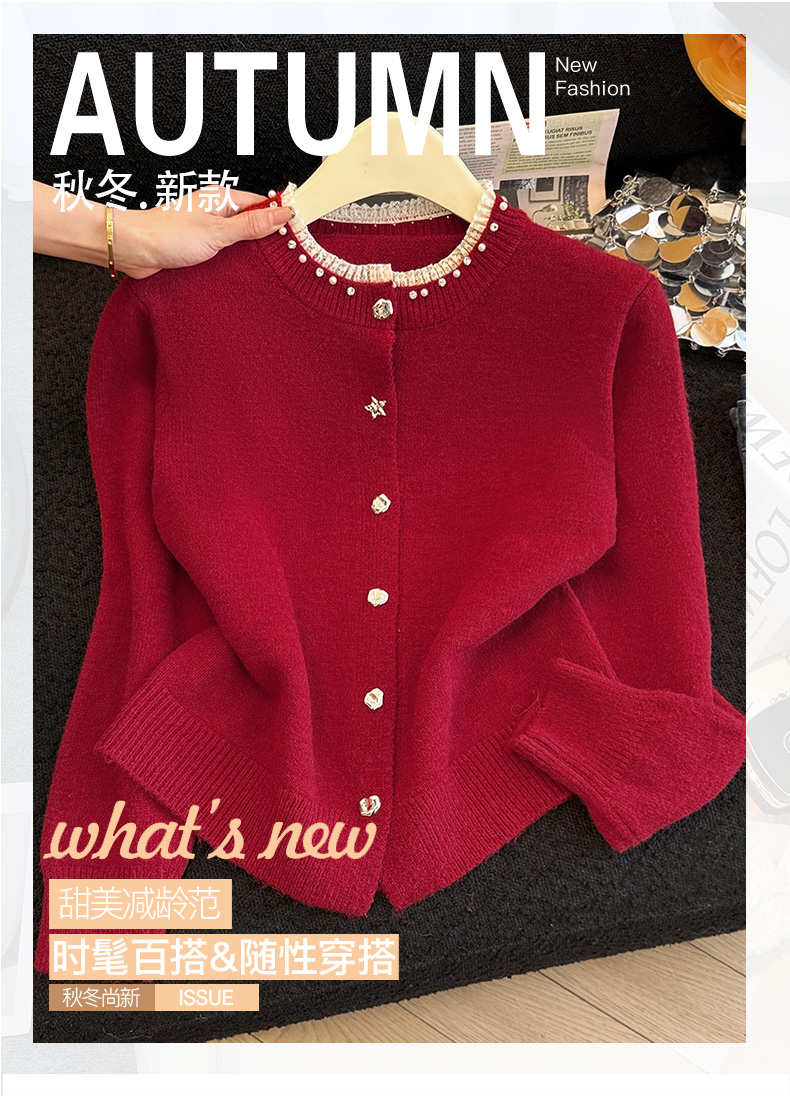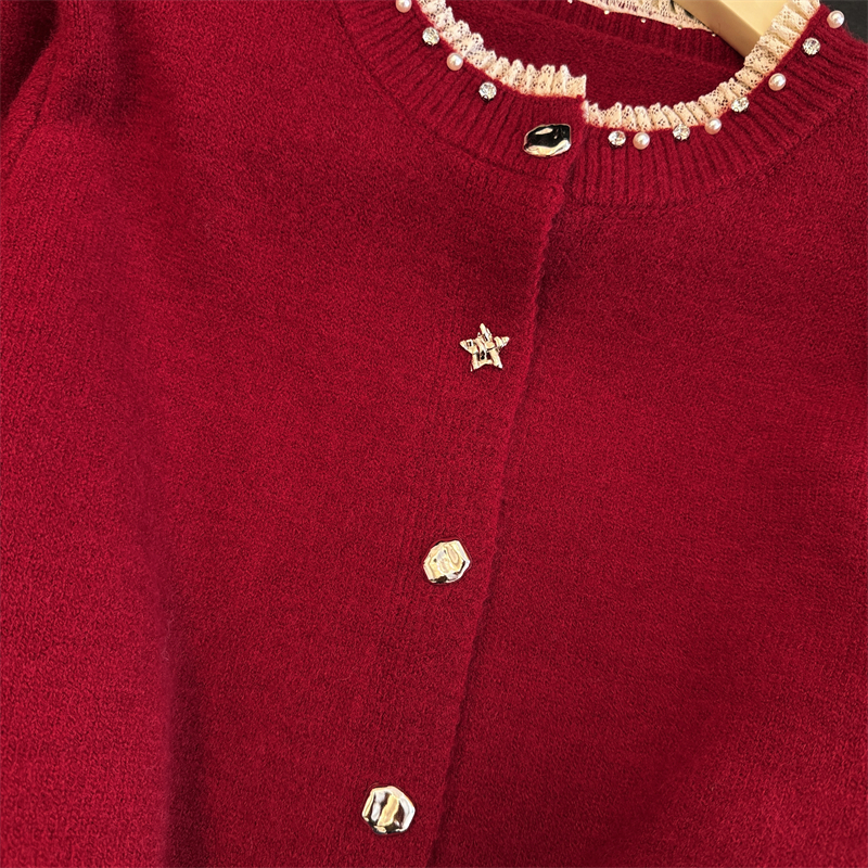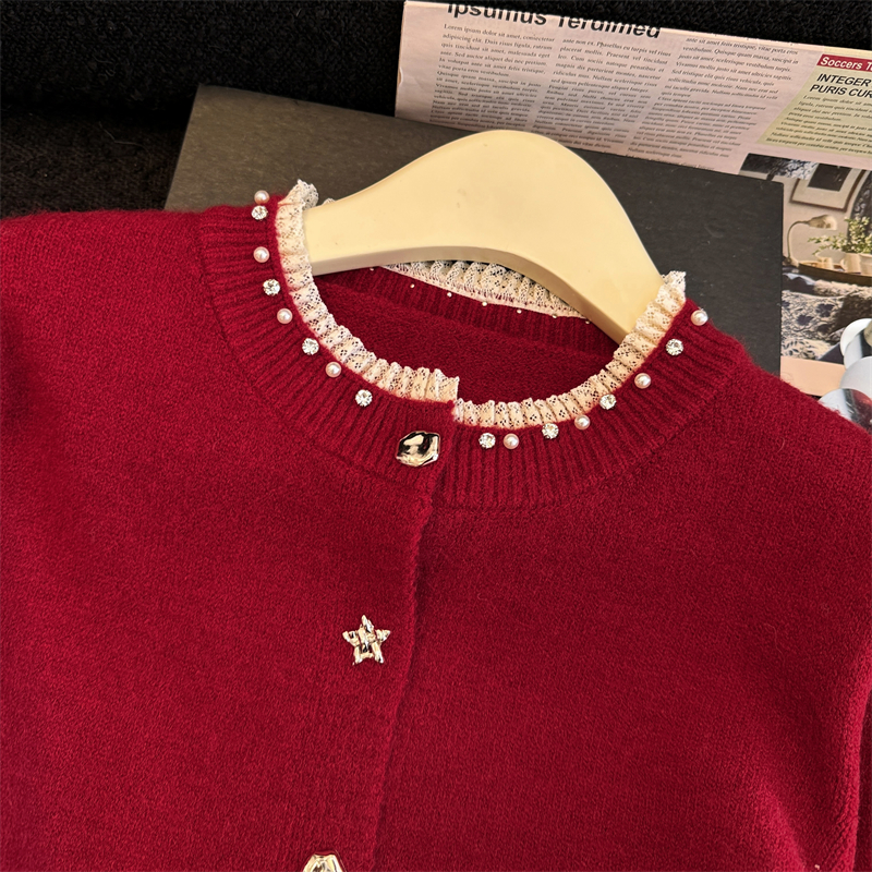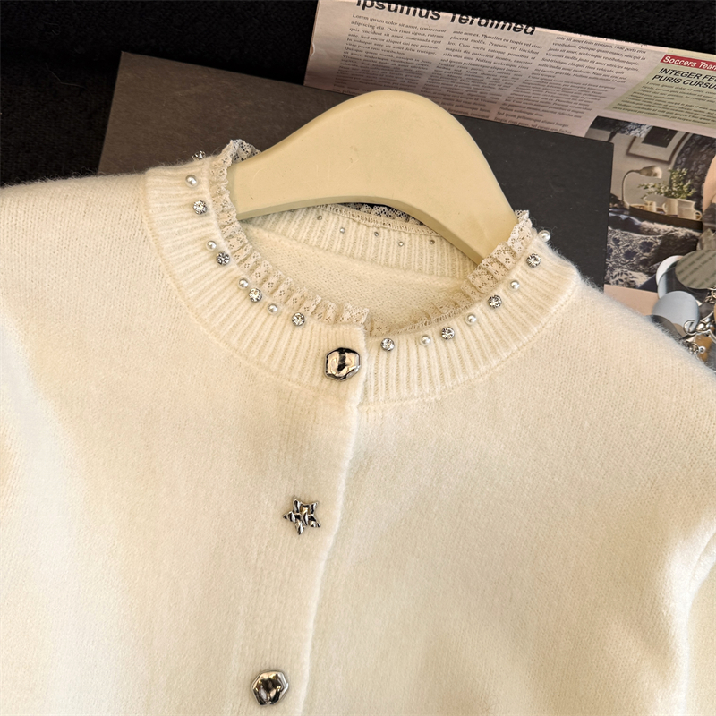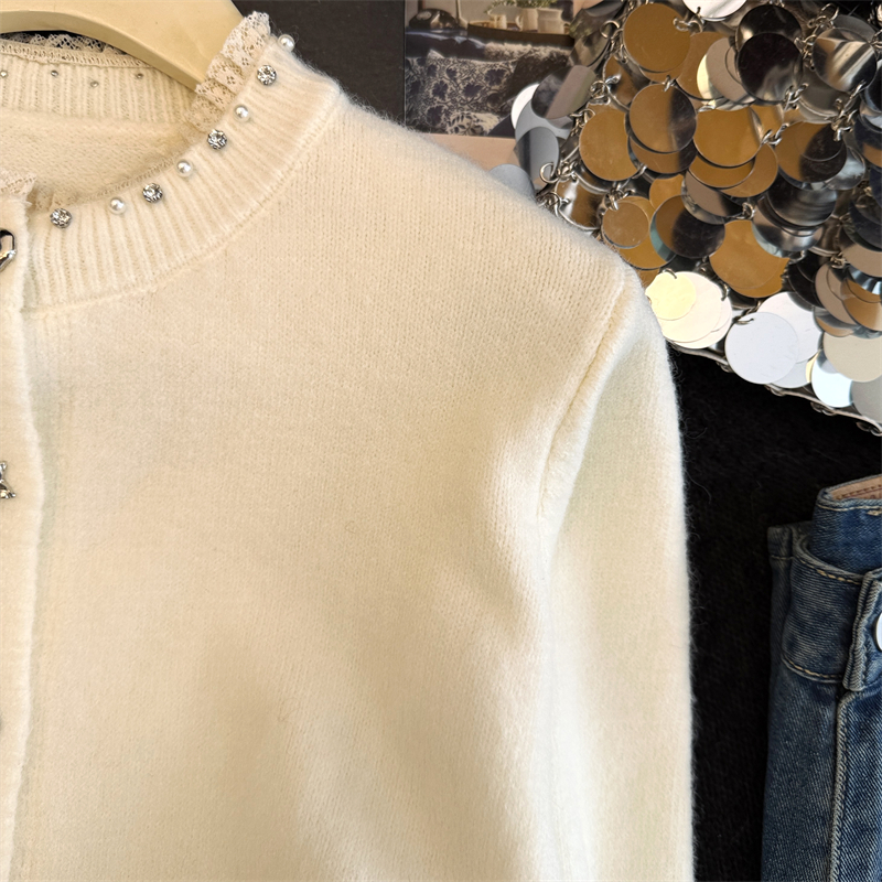 实拍重工钉珠拼接蕾丝毛衣外套2025秋冬新款甜美减龄显瘦针织开衫