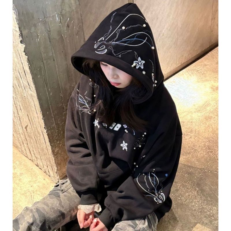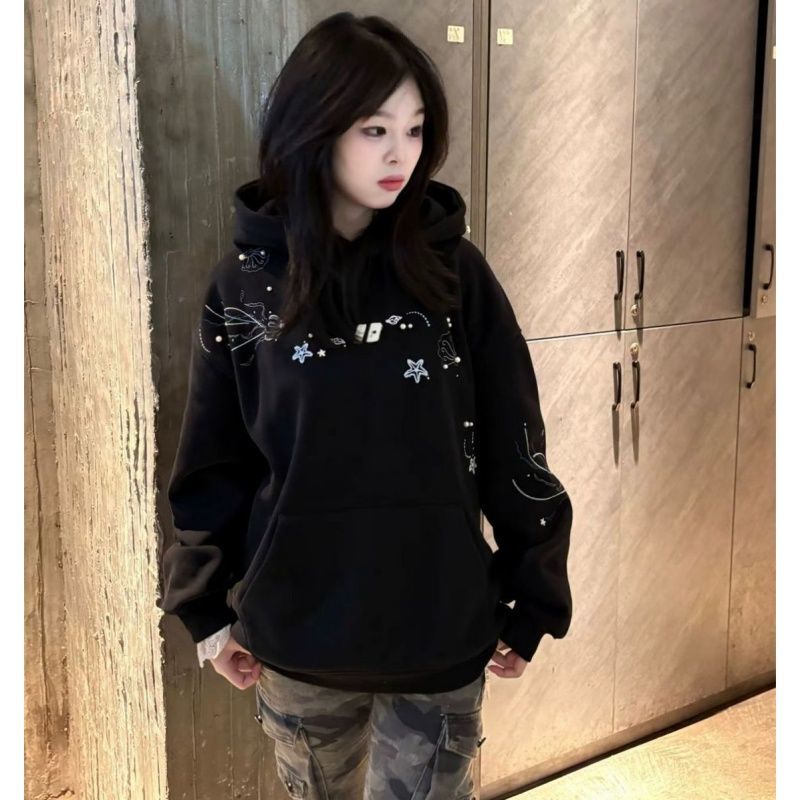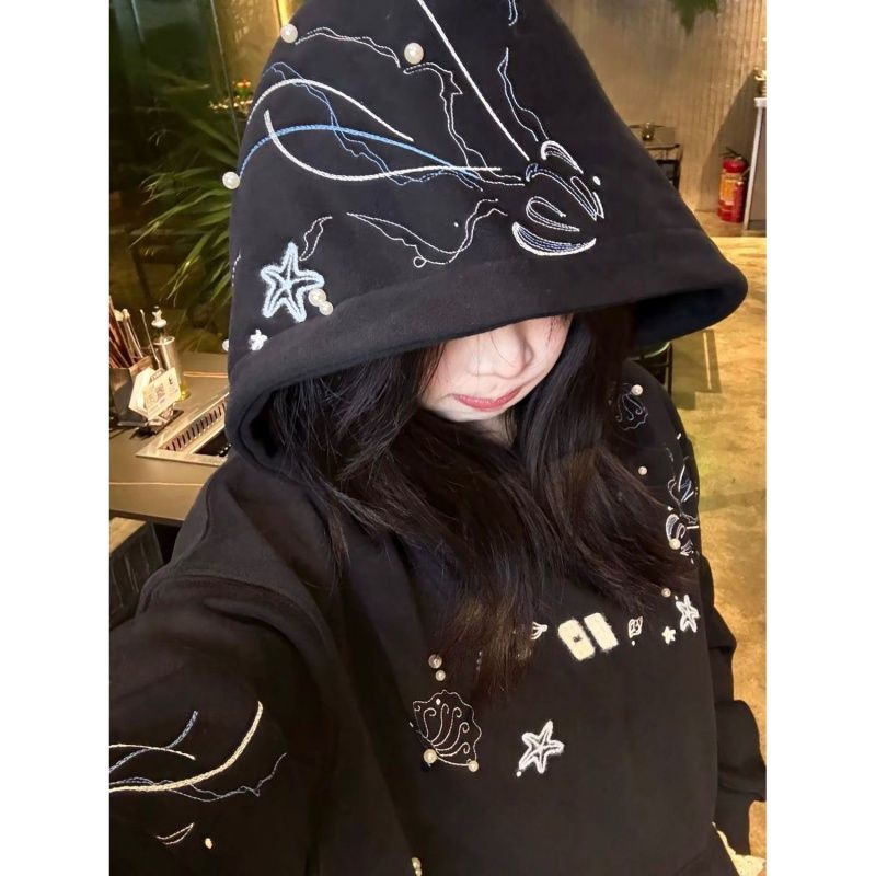 纯棉华棉复银狐绒 包肩领 原版刺绣+钉珠 设计感钉珠加绒连帽卫衣