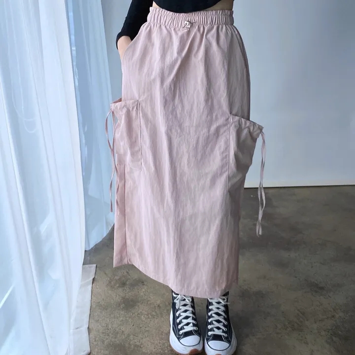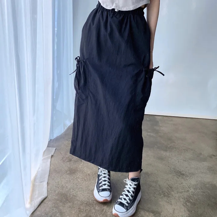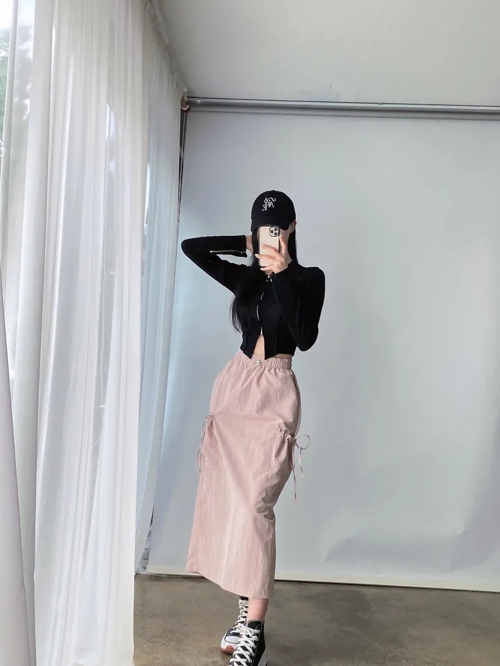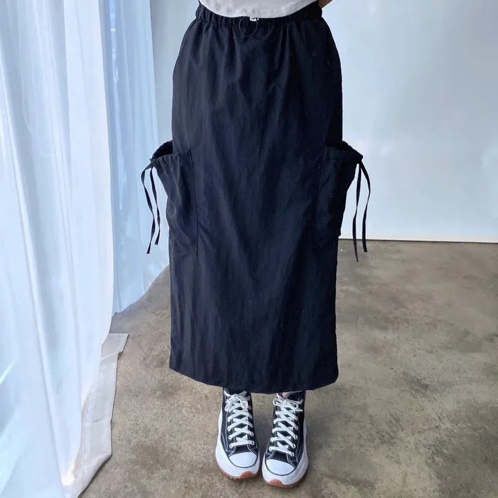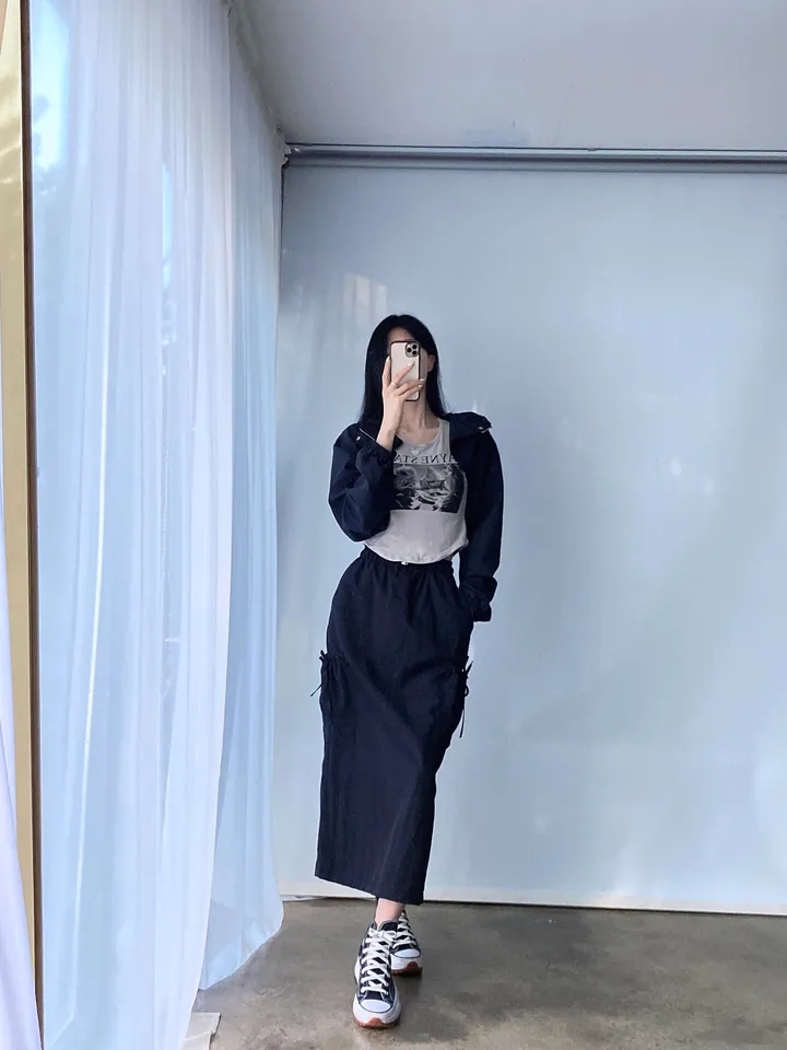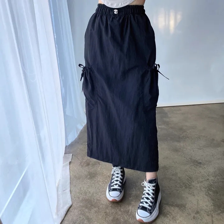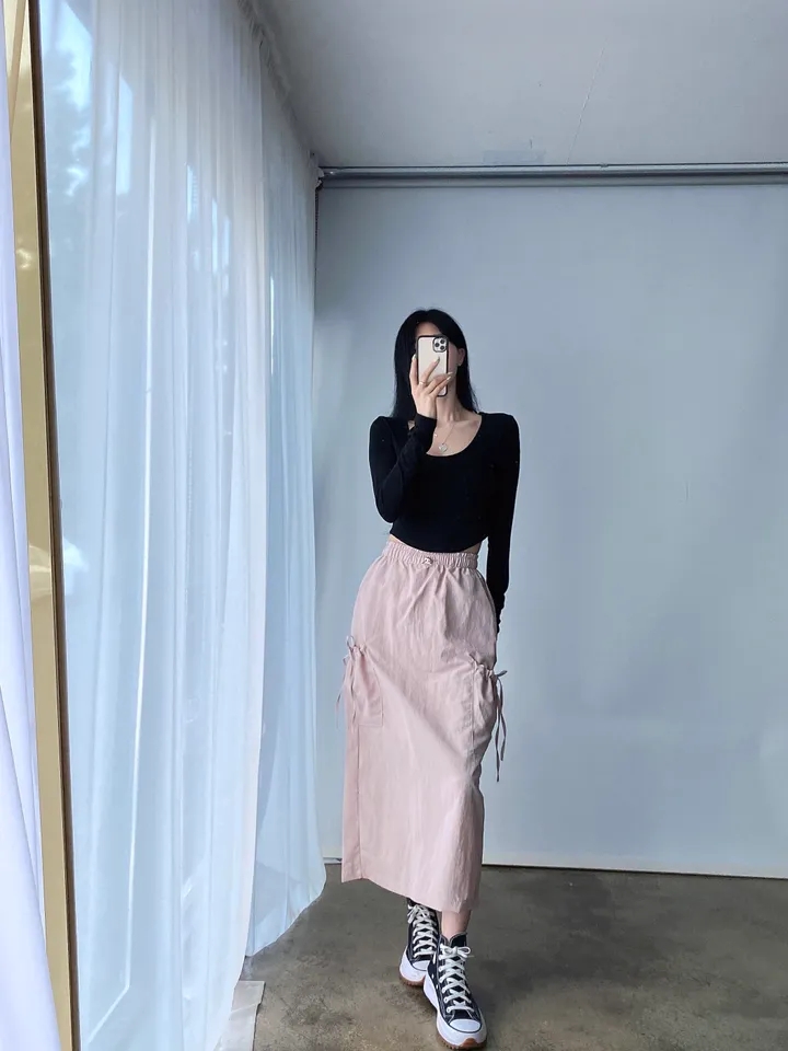 ins韩国春季复古休闲简约抽绳松紧腰后开叉口袋工装A字半身裙