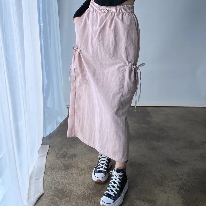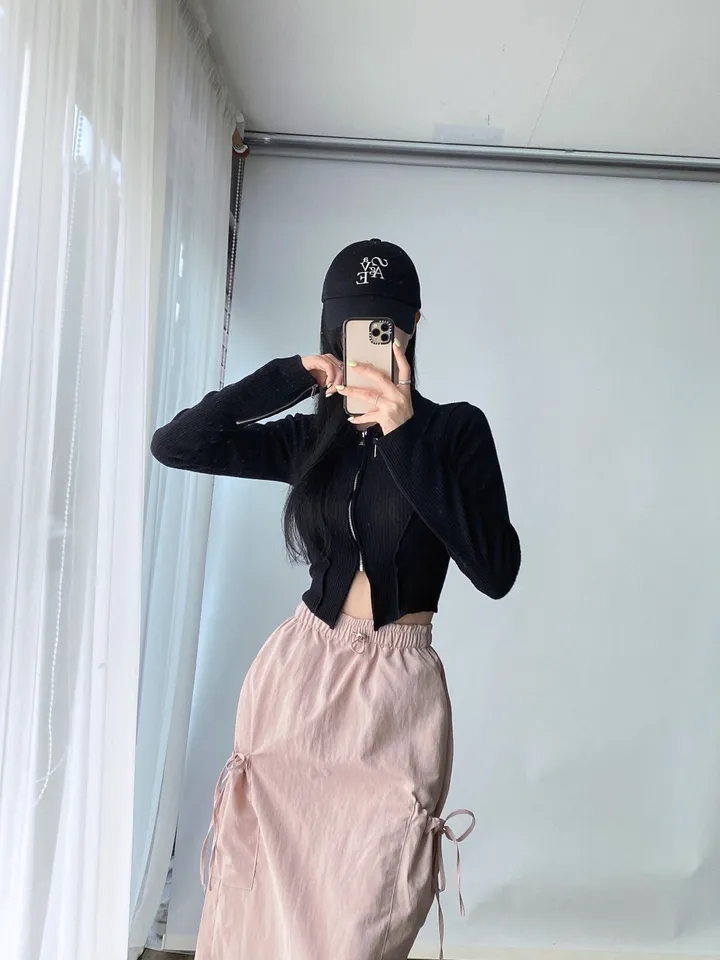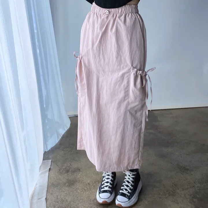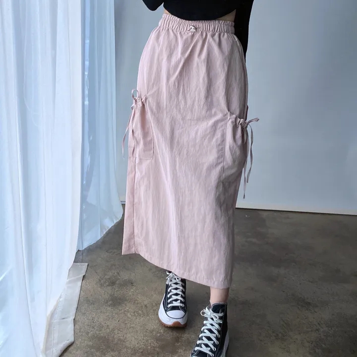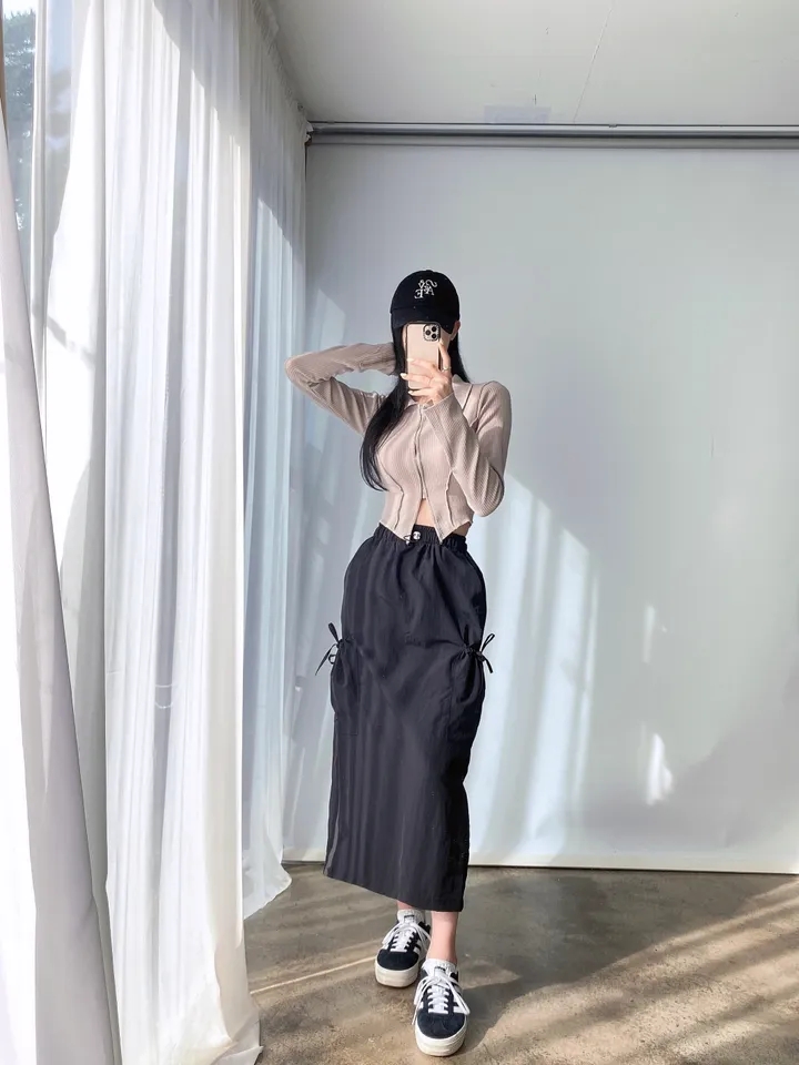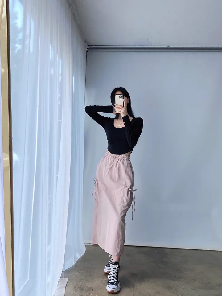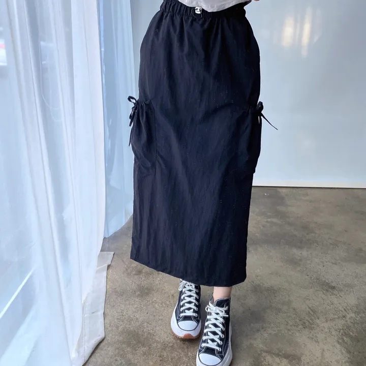 ins韩国春季复古休闲简约抽绳松紧腰后开叉口袋工装A字半身裙