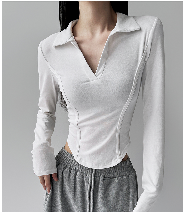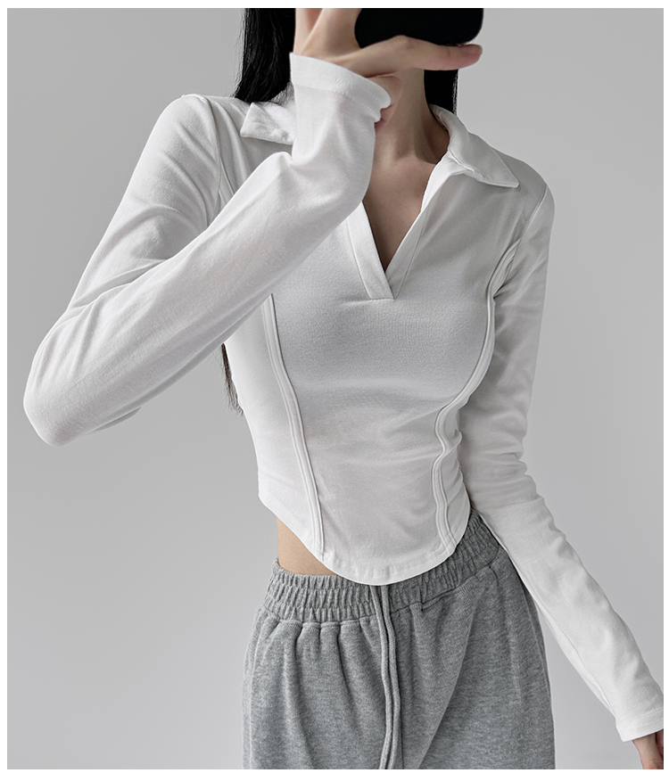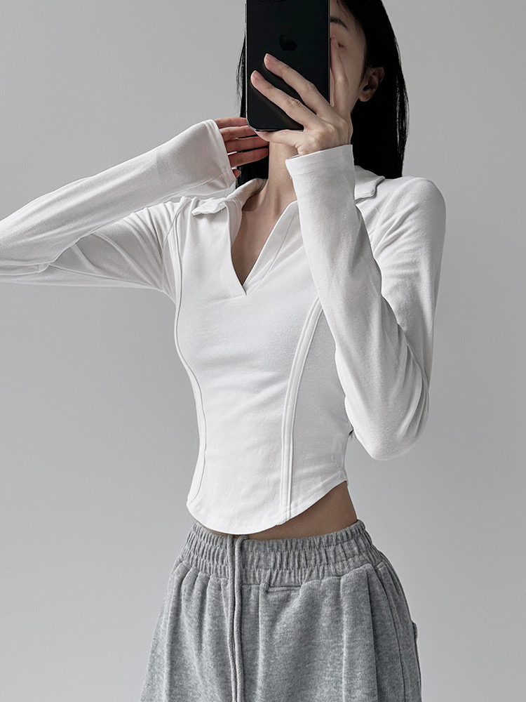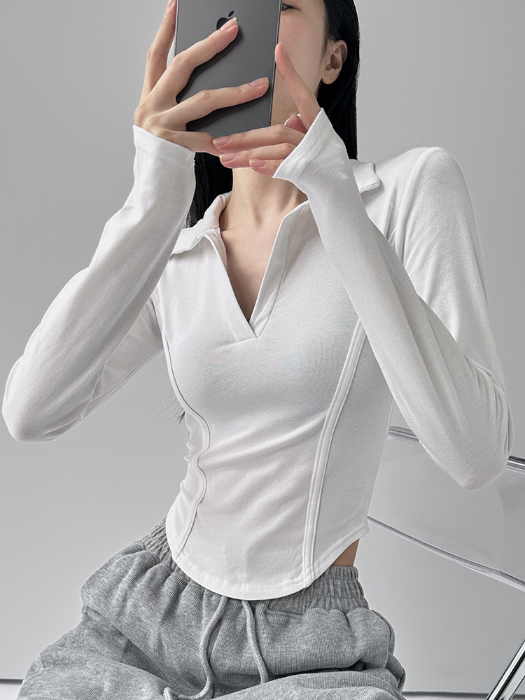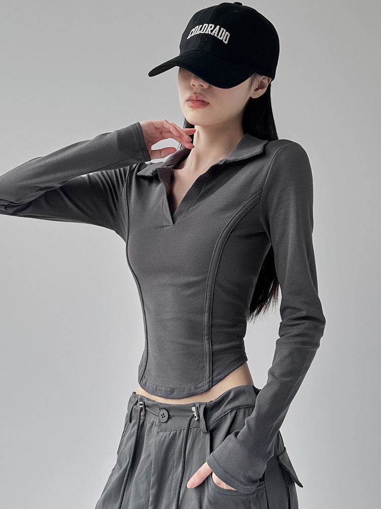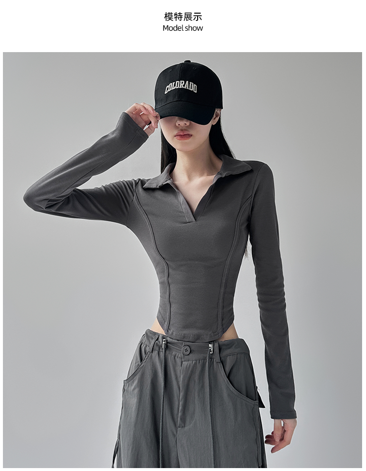 260克莫代尔人棉 辣妹风正肩长袖T恤女Polo翻领收腰鱼骨显瘦上衣