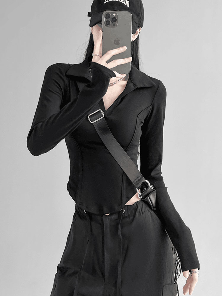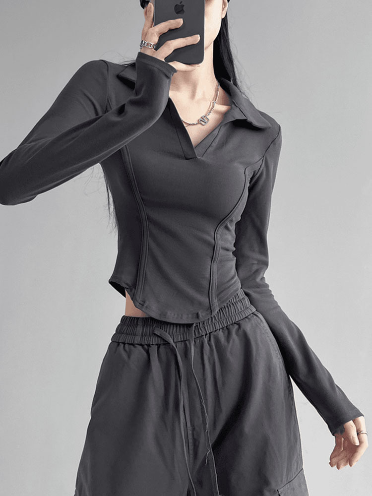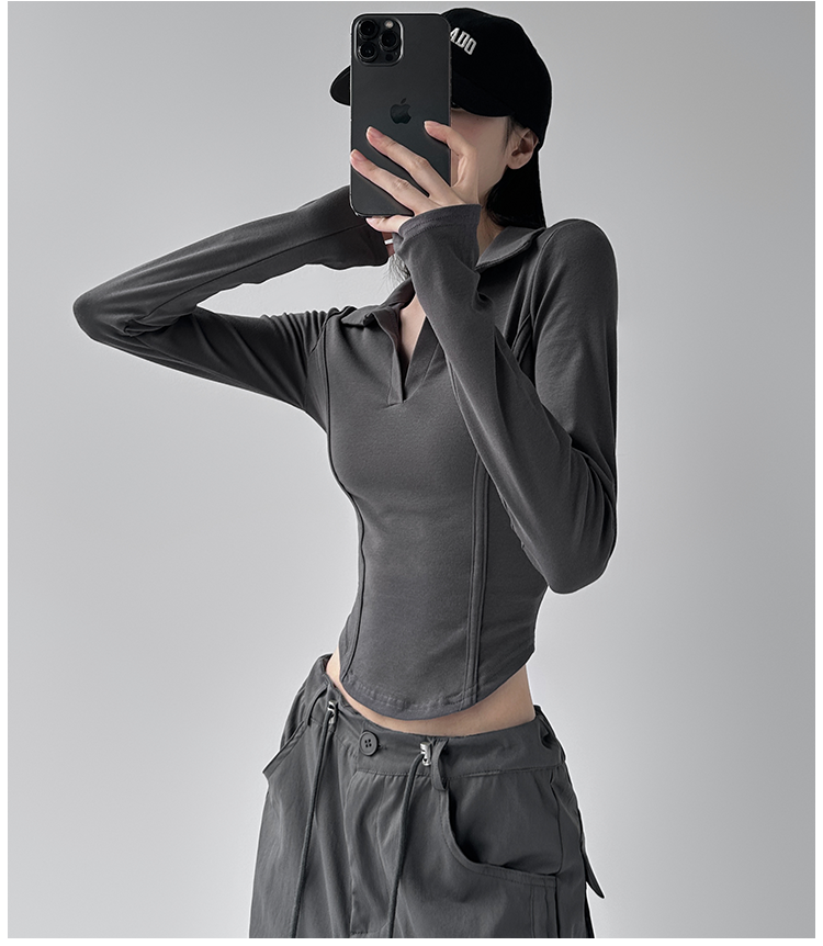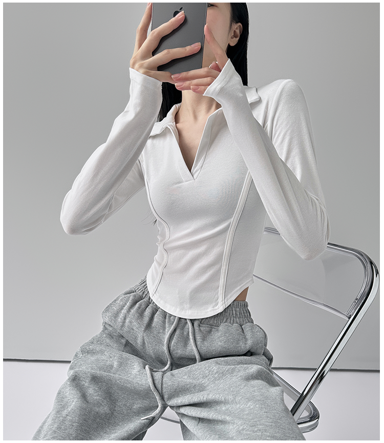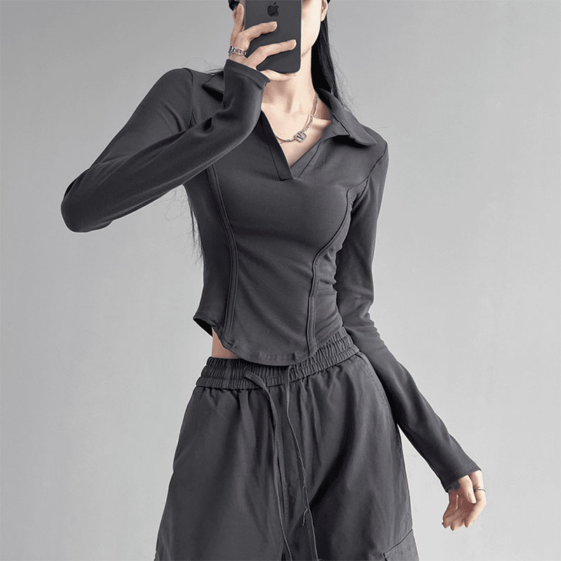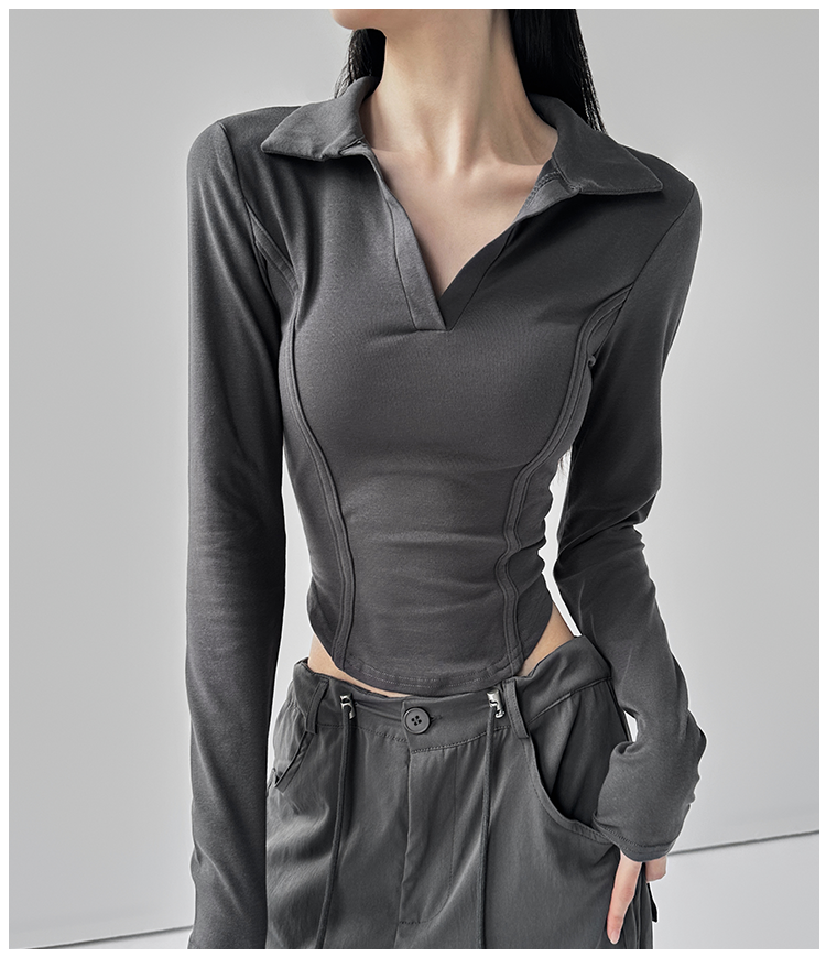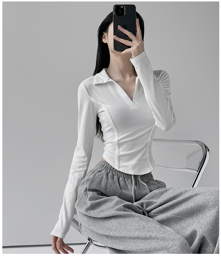 260克莫代尔人棉 辣妹风正肩长袖T恤女Polo翻领收腰鱼骨显瘦上衣