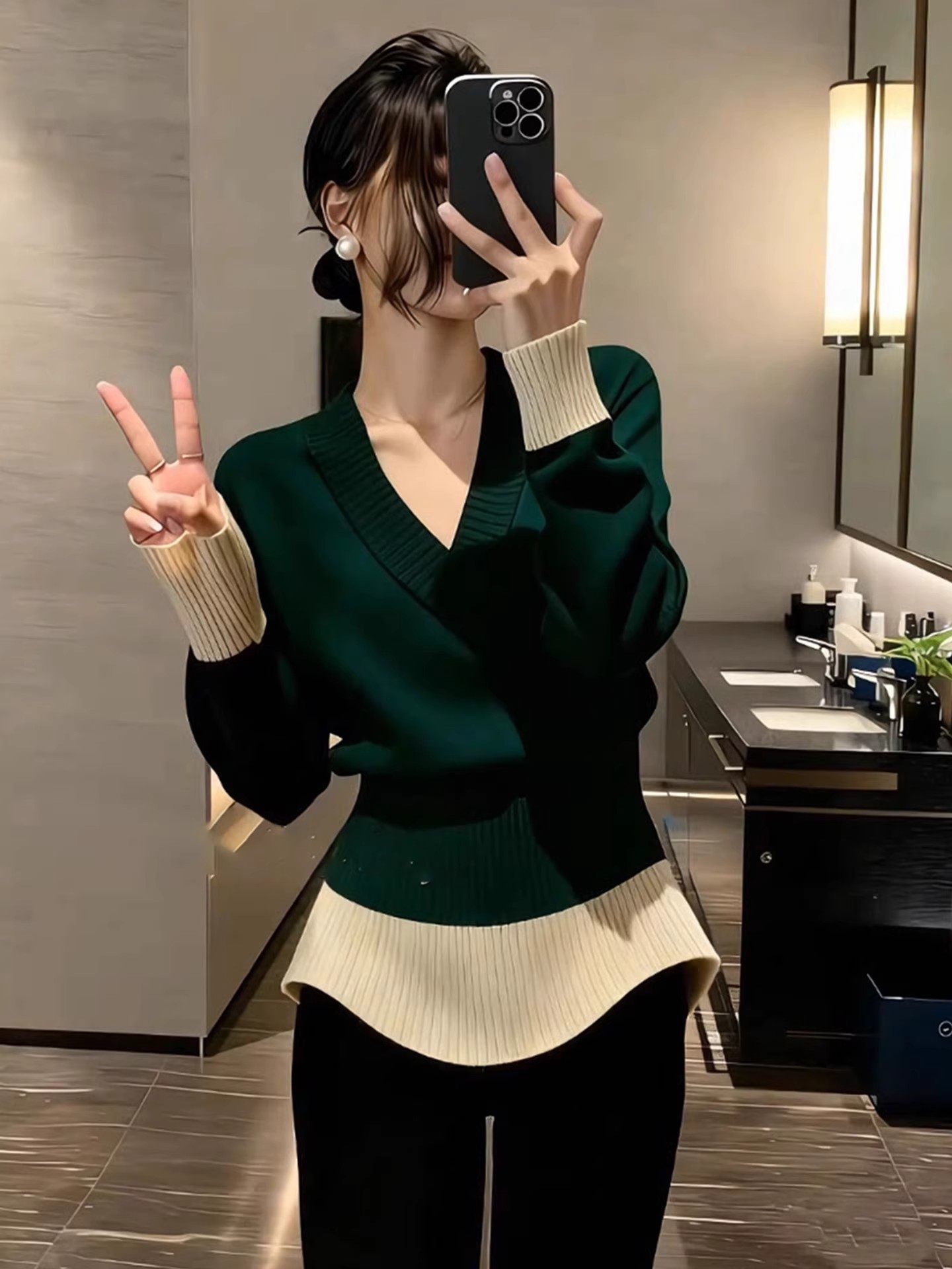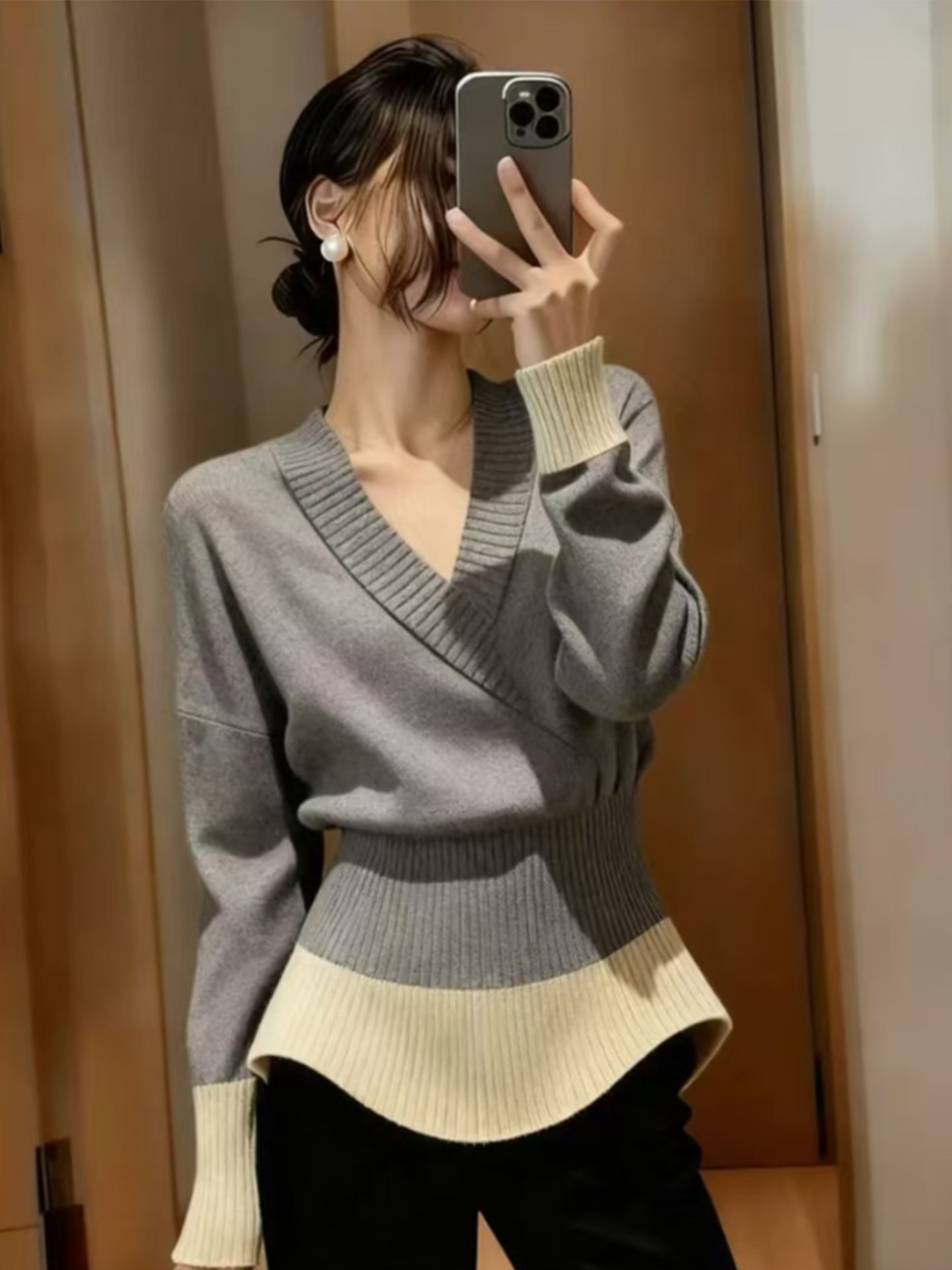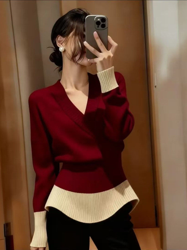 法式复古风撞色V领长袖针织衫女冬季新款高级感收腰显瘦套头上衣