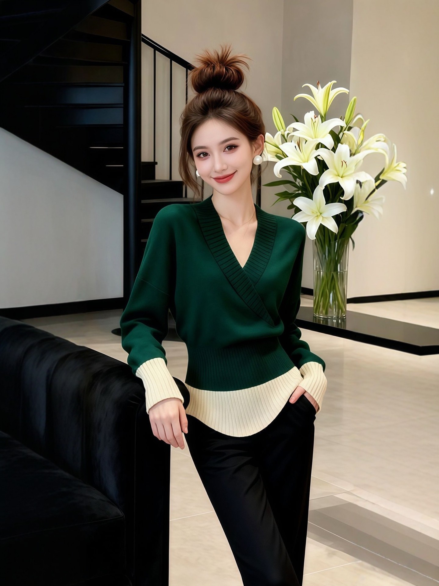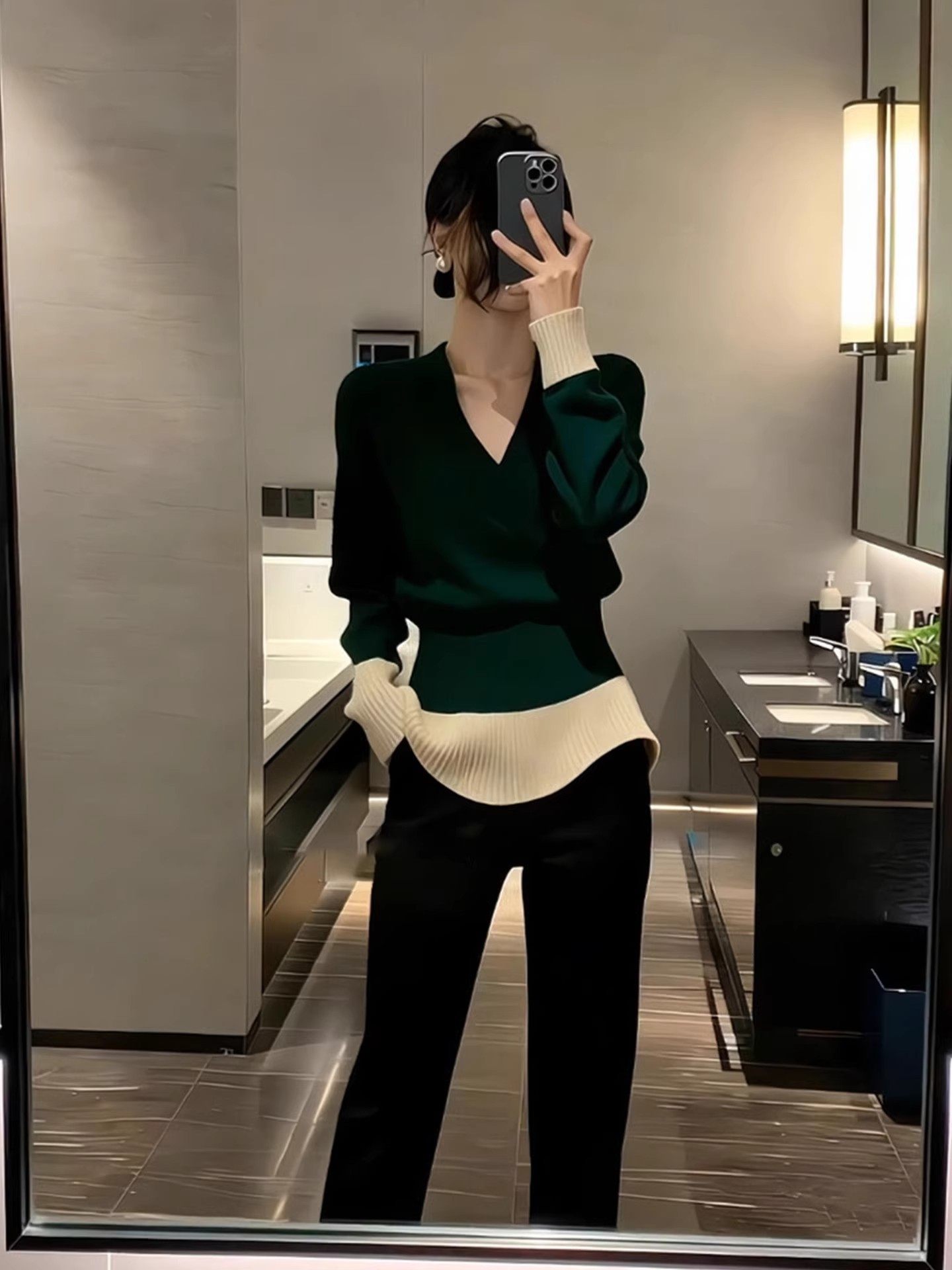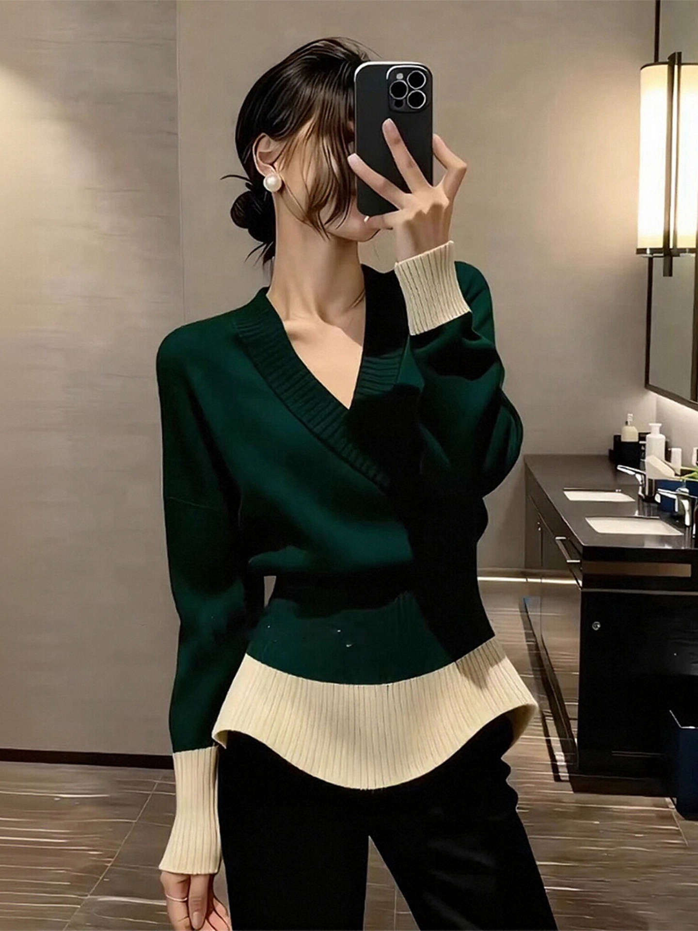 法式复古风撞色V领长袖针织衫女冬季新款高级感收腰显瘦套头上衣