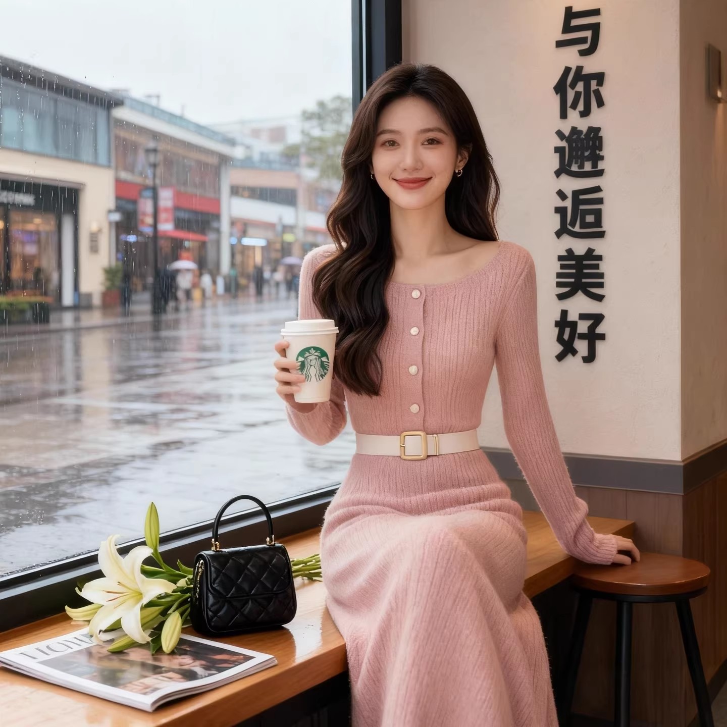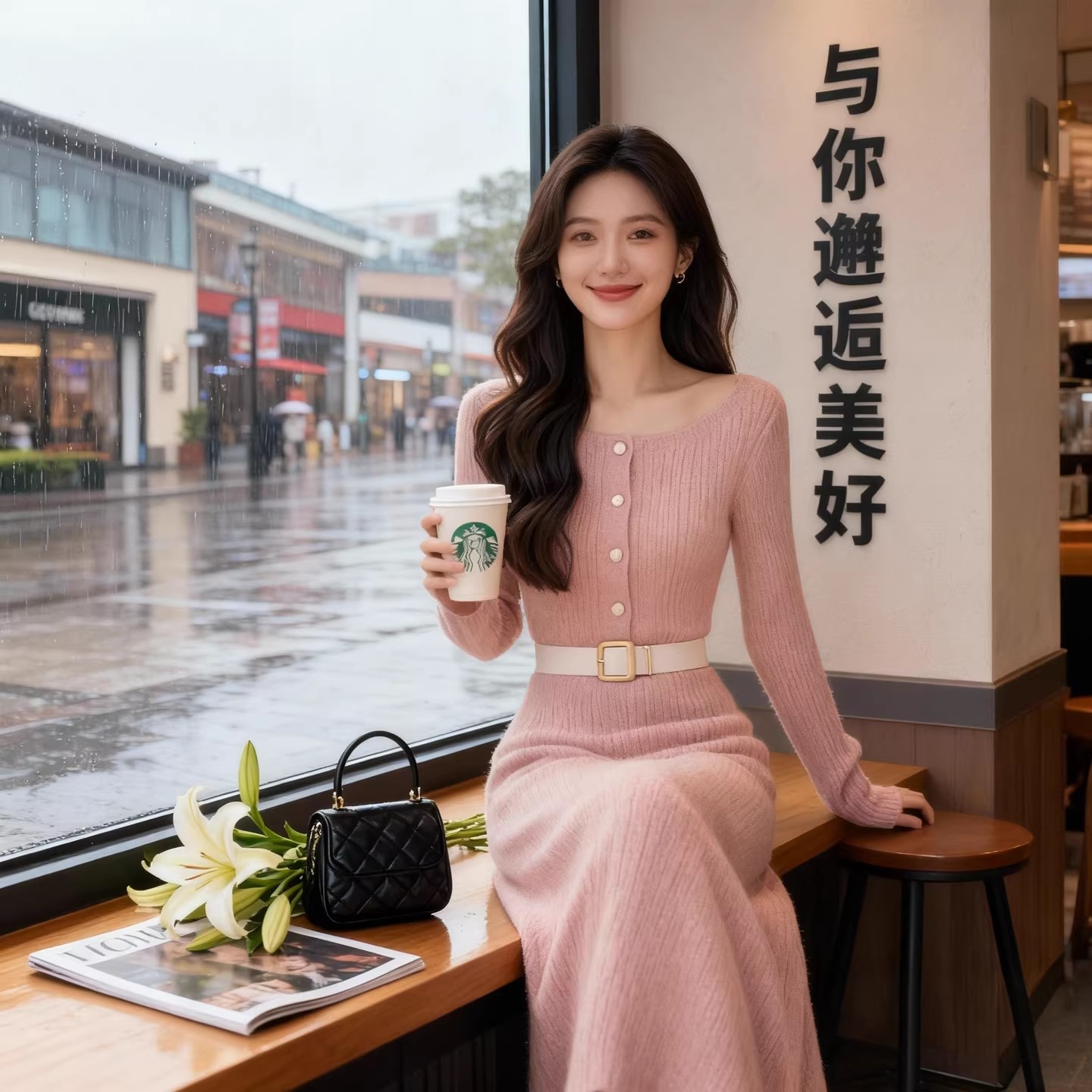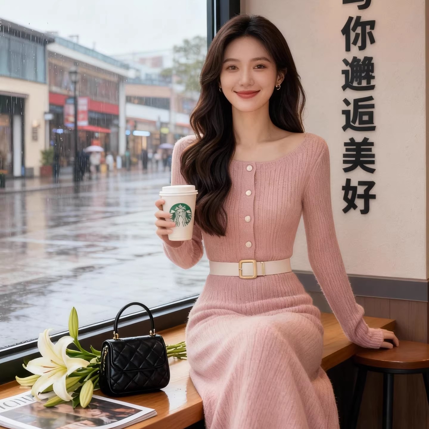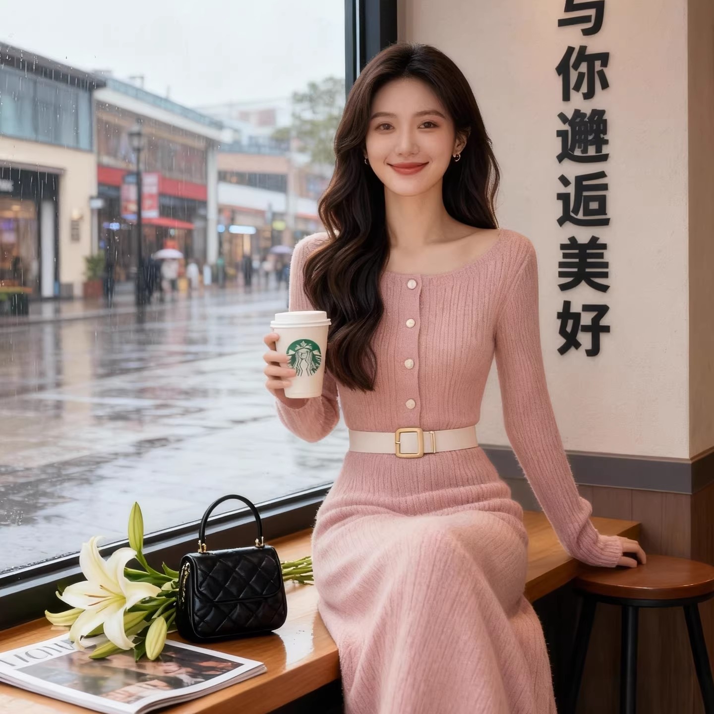 法式温柔风粉色针织连衣裙女2025秋冬收腰气质女神范高级感长裙子