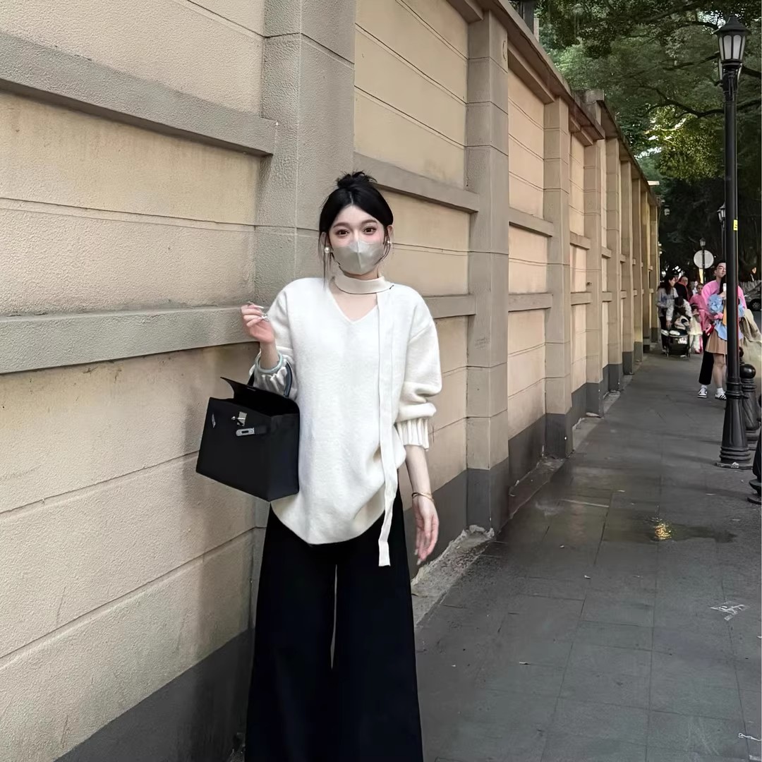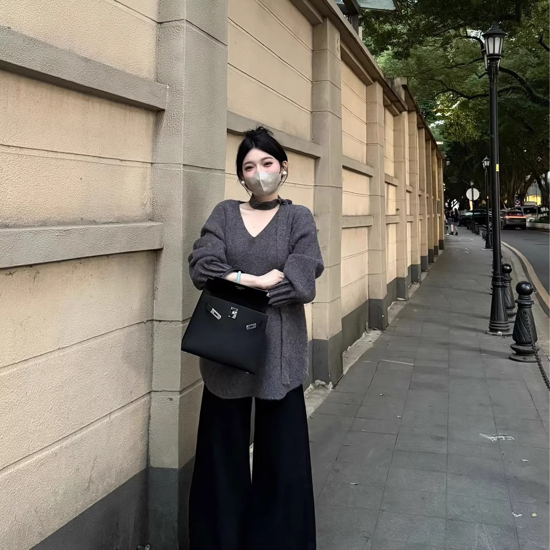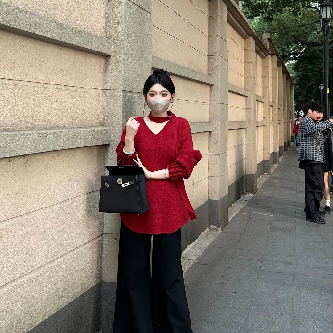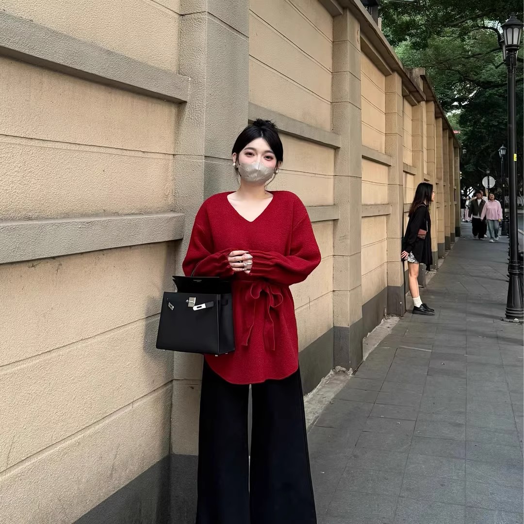 好质量孕妇装毛衣秋冬装新款围巾针织衫上衣宽松V领中长款红色