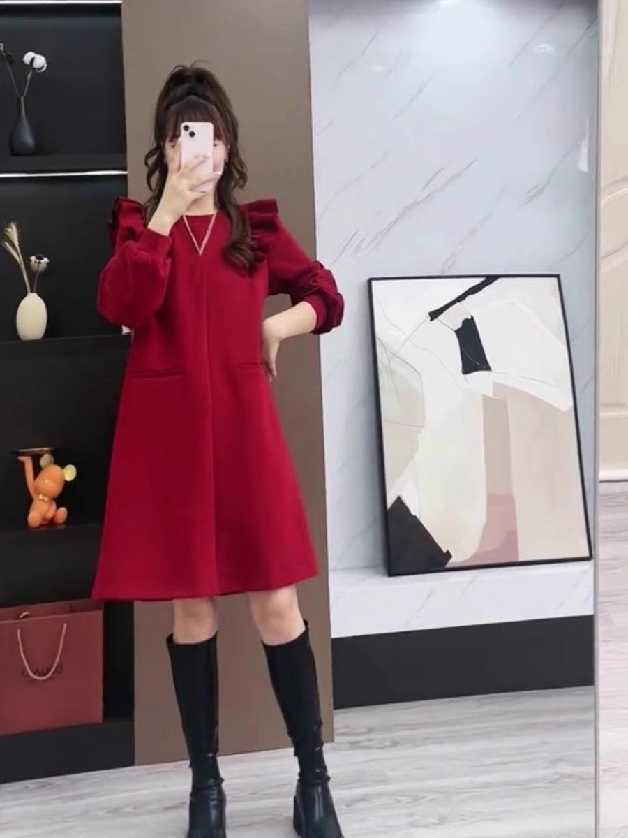 本命年新年红包心纱秋冬木耳边毛衣打底衫显瘦红色针织连衣裙