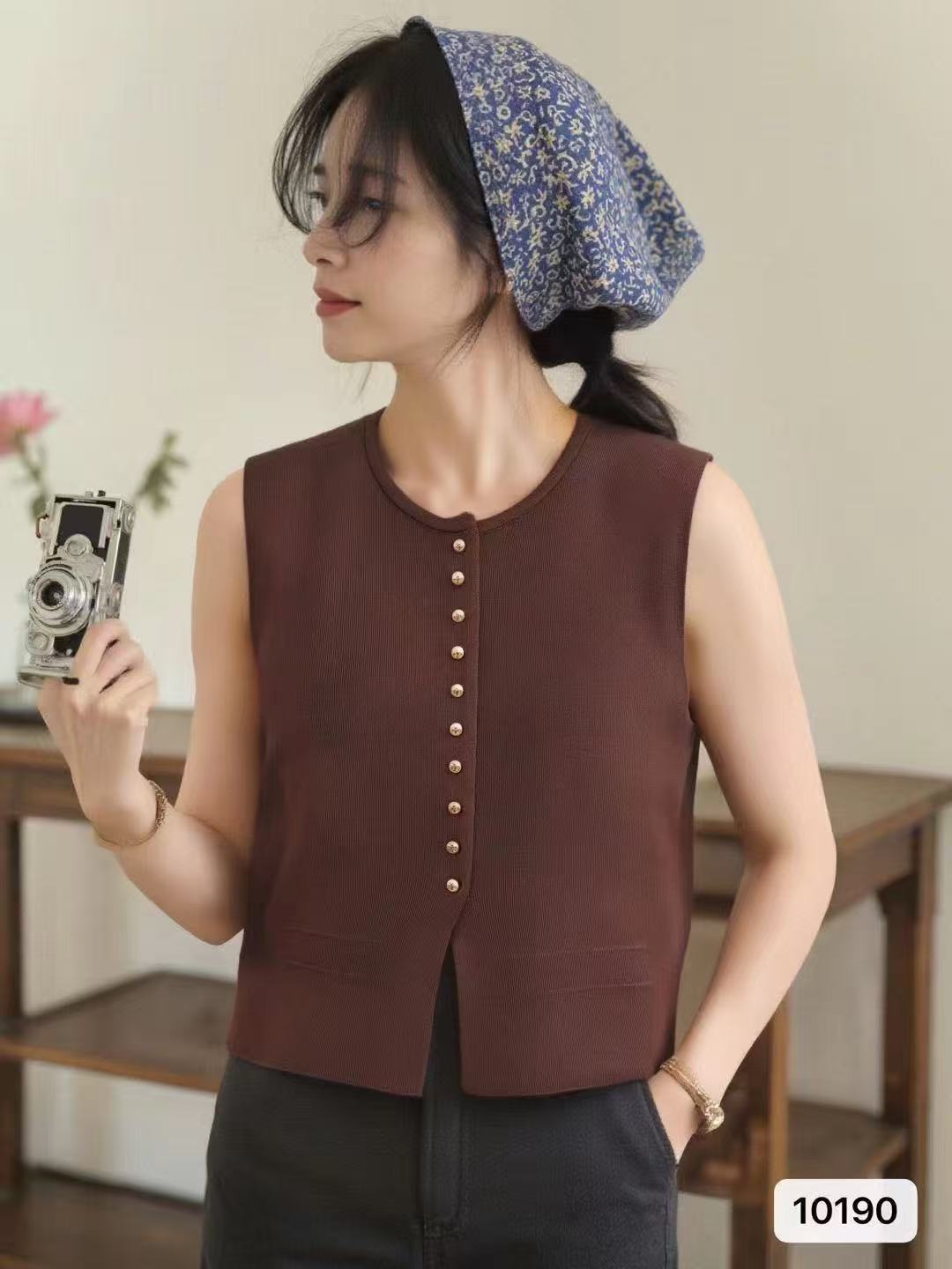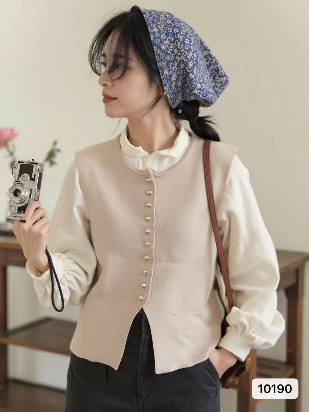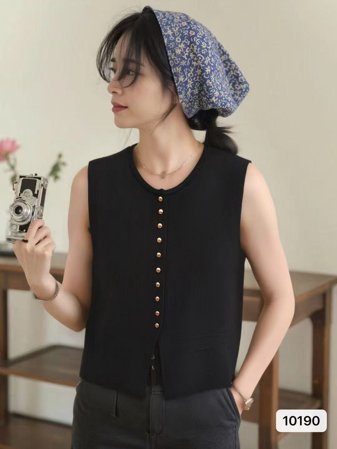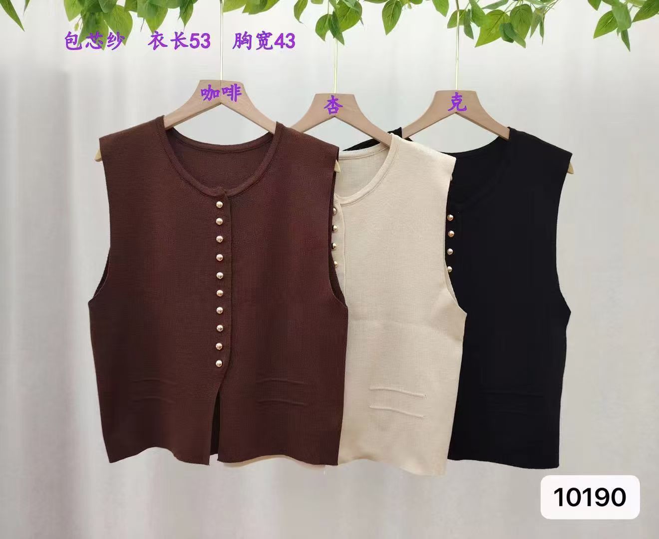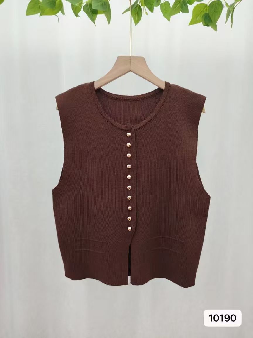 实价时尚圆领纯色金属扣设计开叉背心开衫上衣女