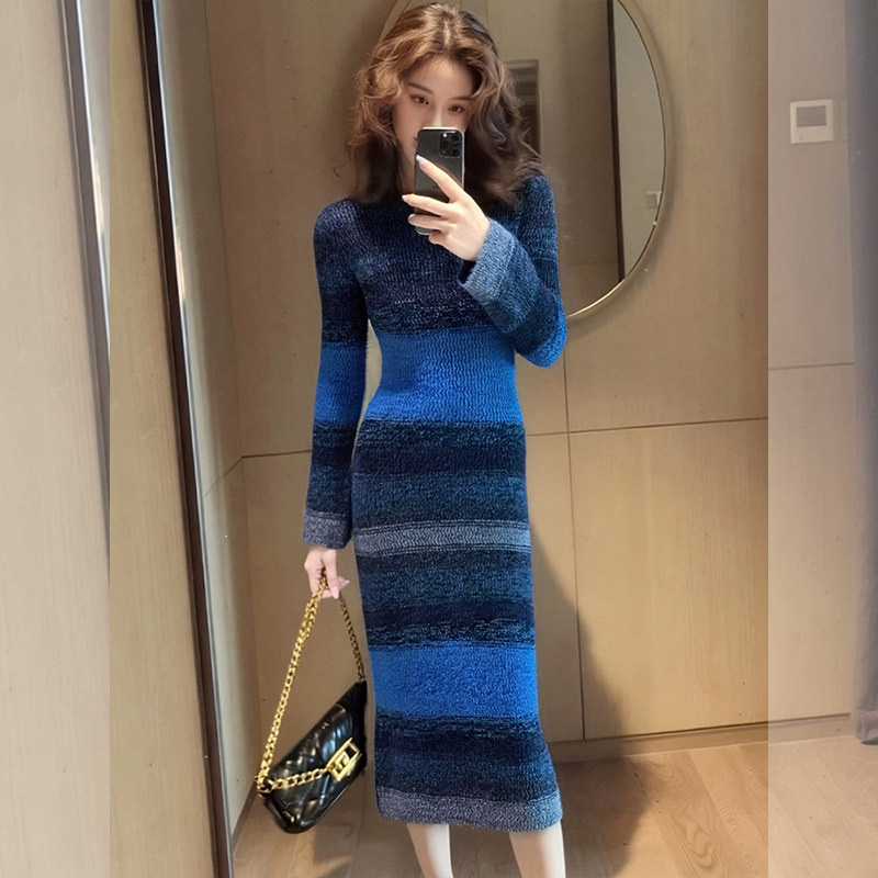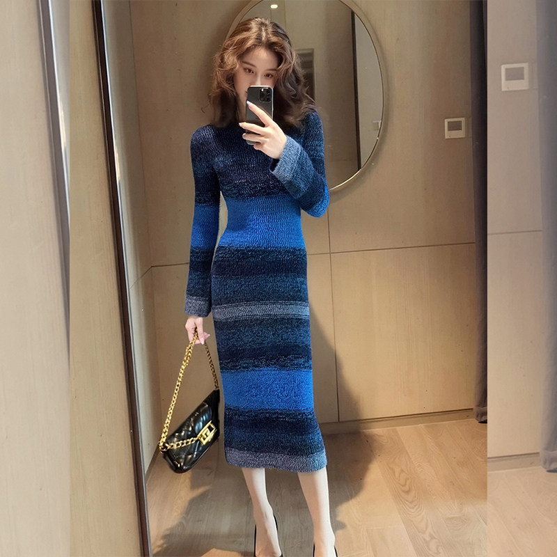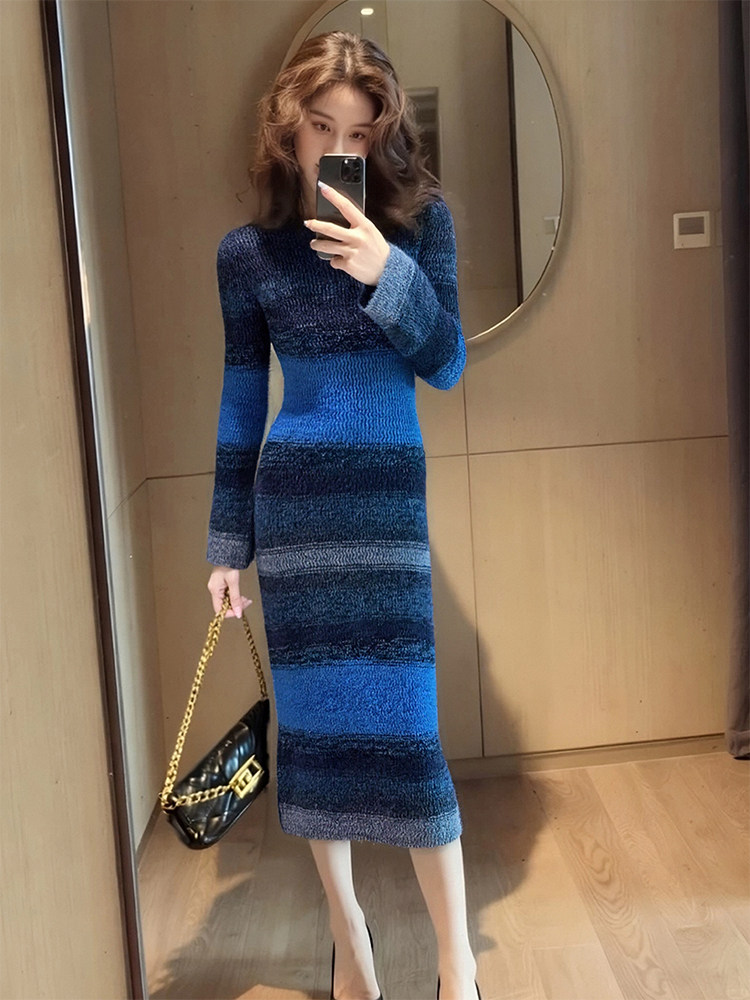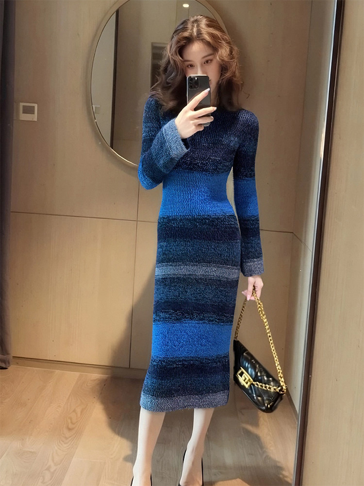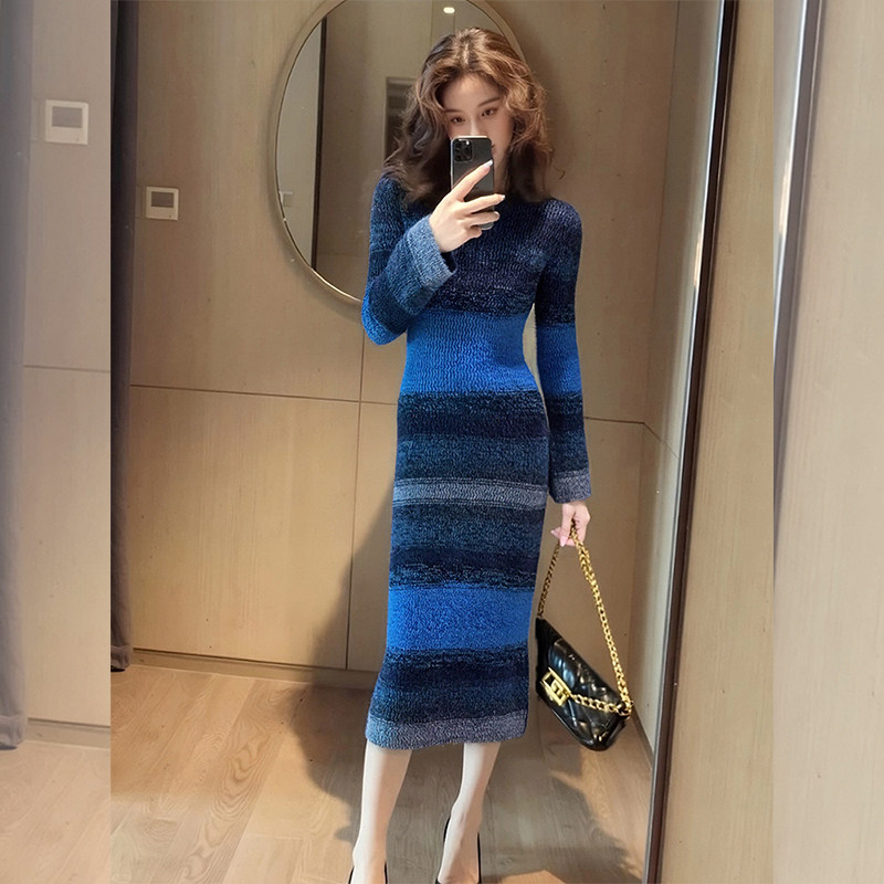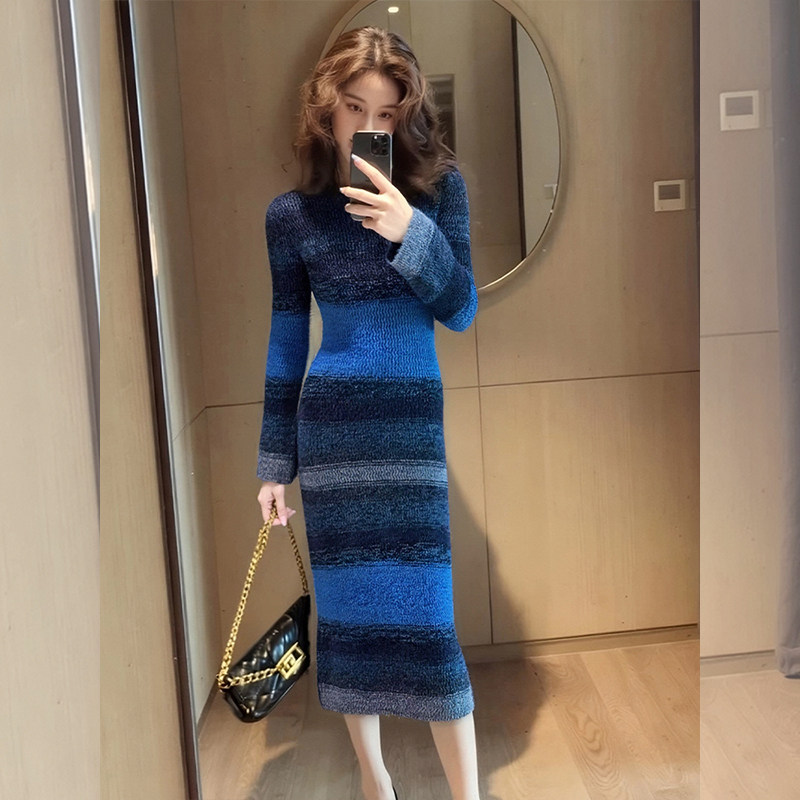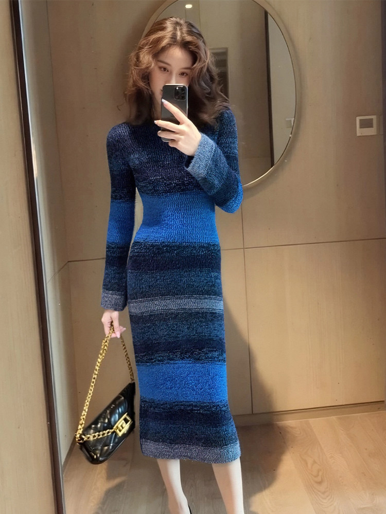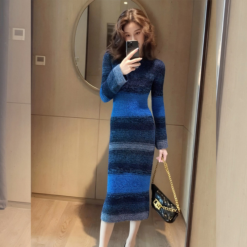 秋冬巨好看漂亮条纹针织连衣裙女法式修身显瘦长袖包臀a字长裙子