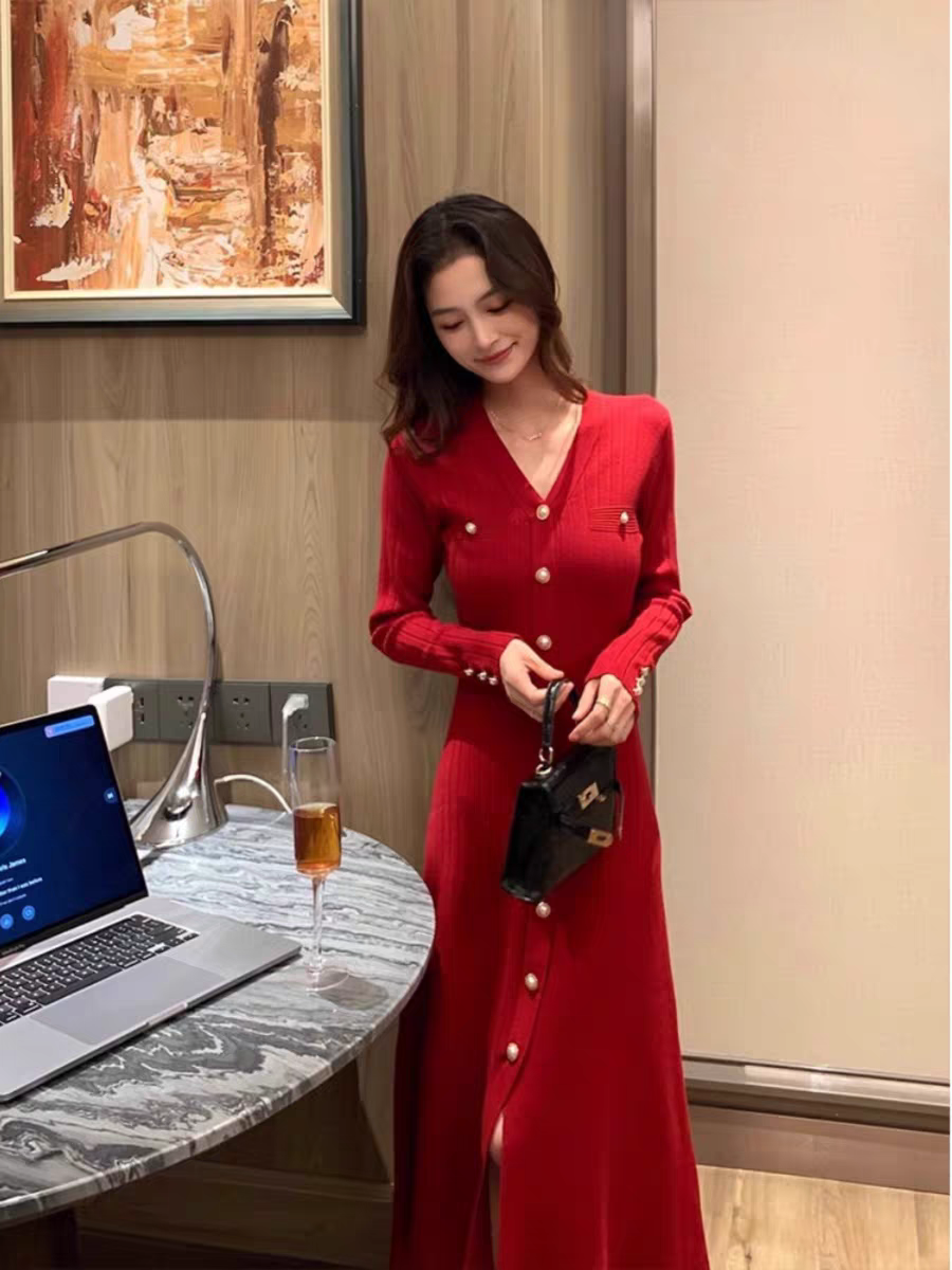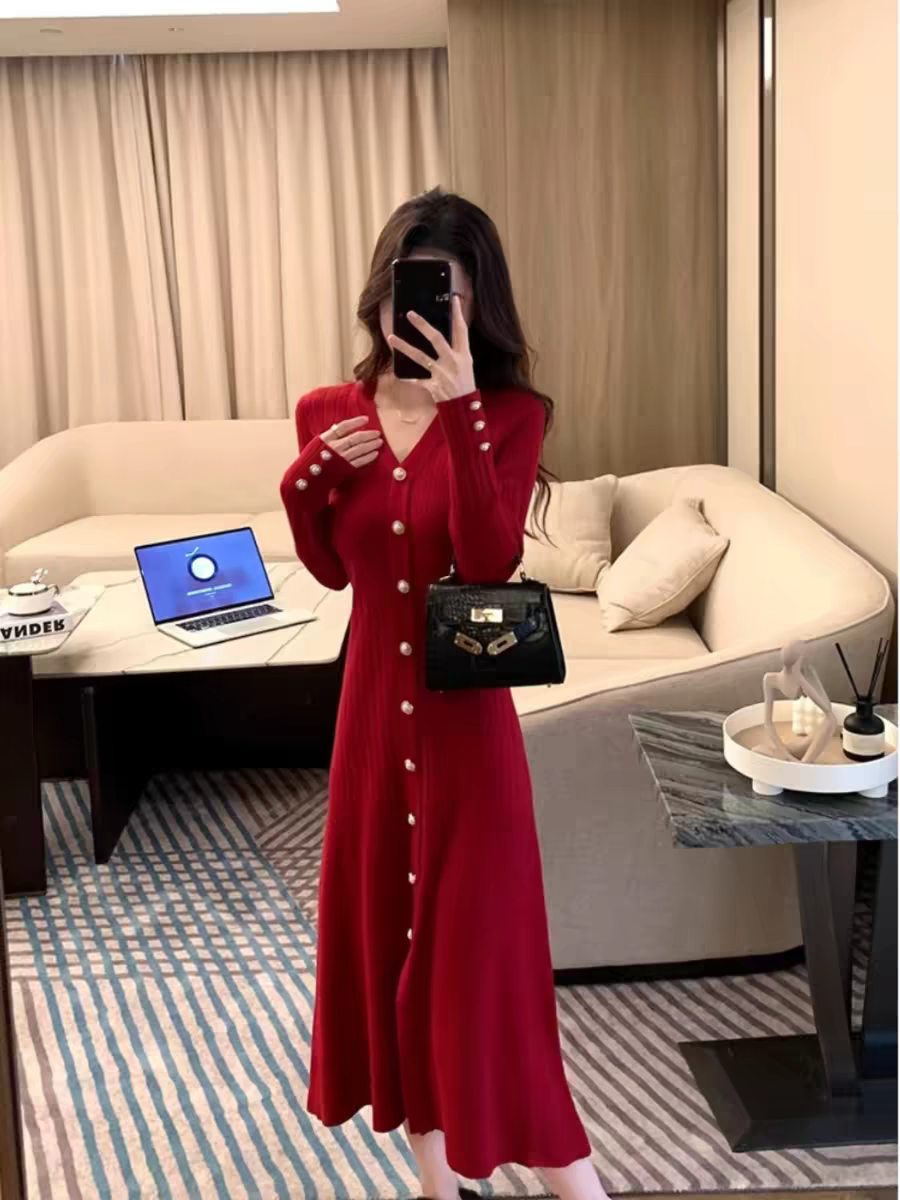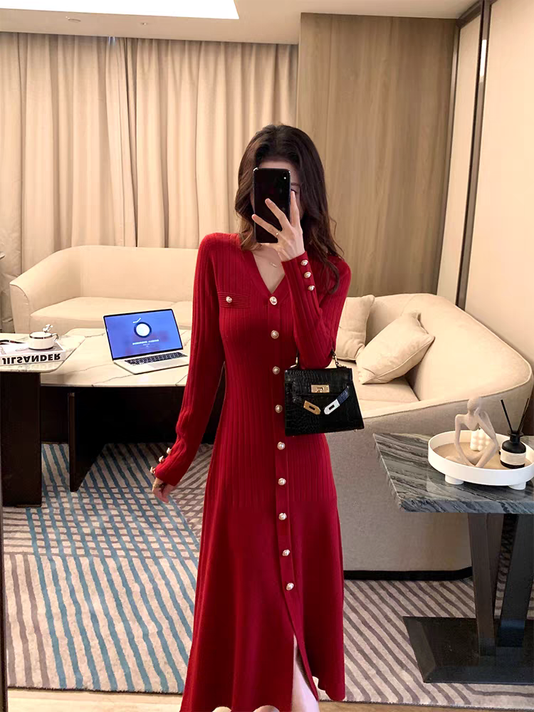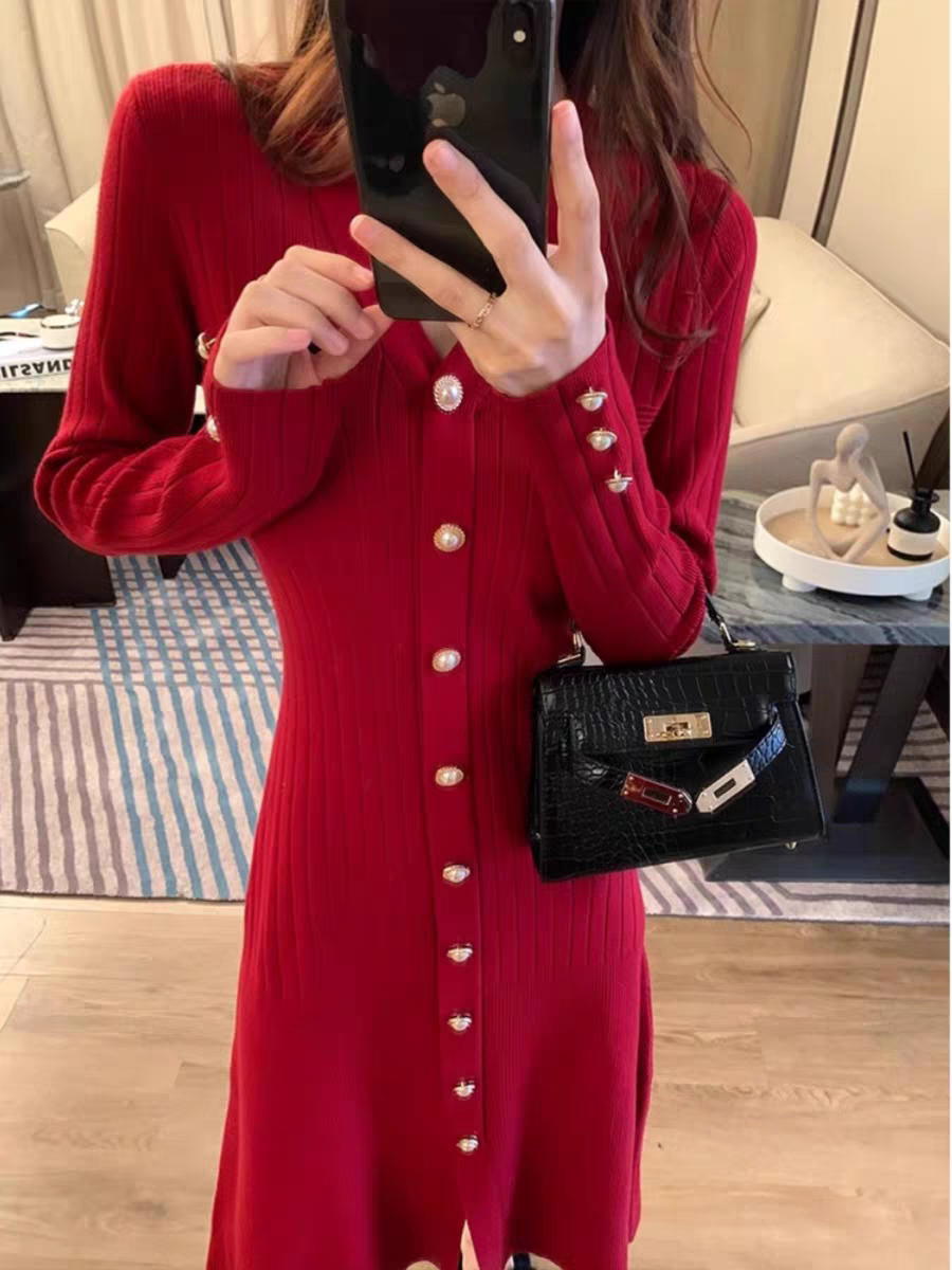林妍儿红色V领针织连衣裙女秋冬打底新款收腰气质单排扣毛衣裙子