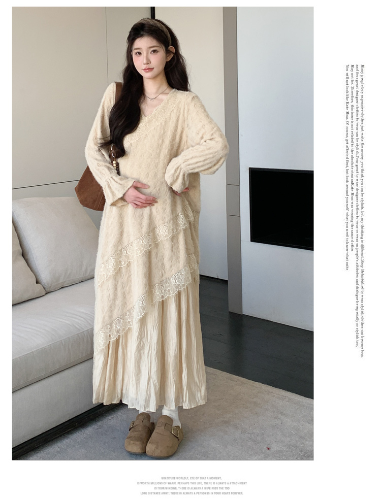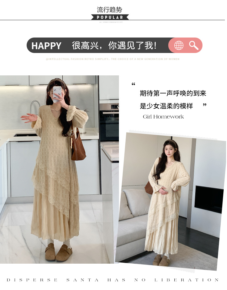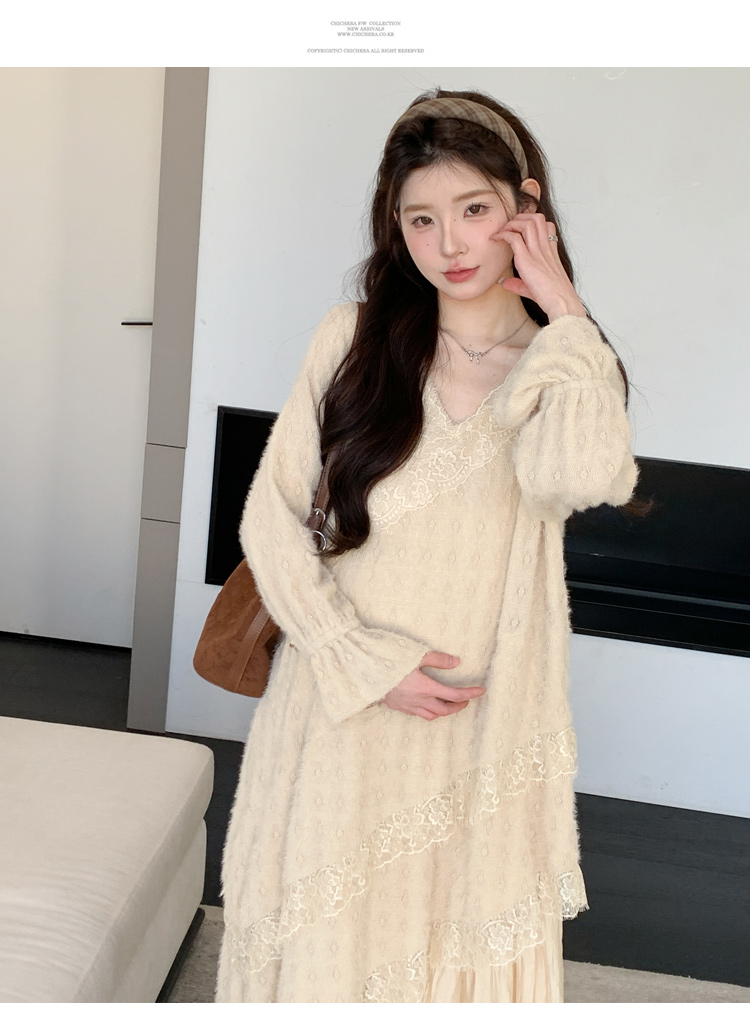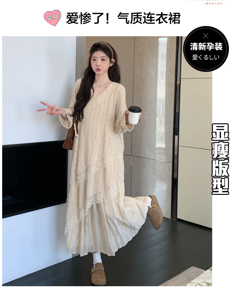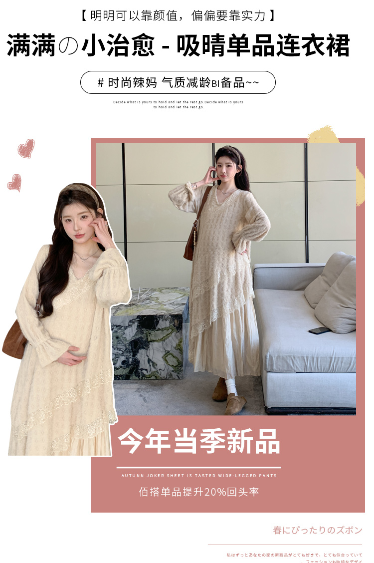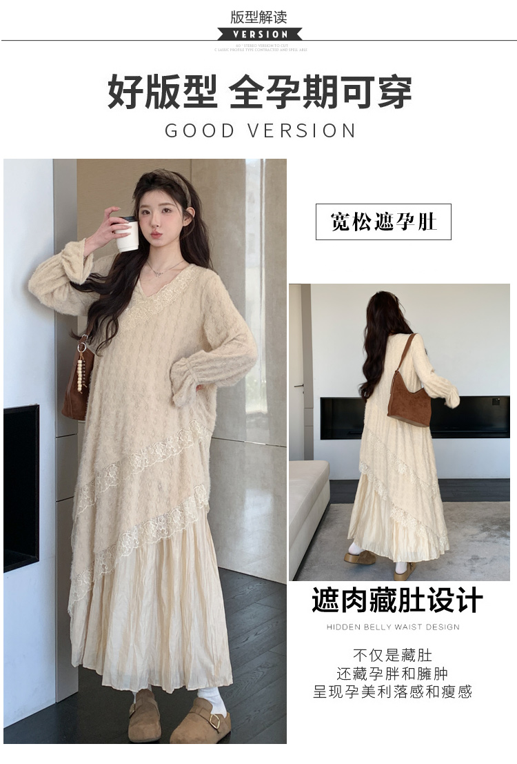 孕妇装重工提花压褶连衣裙女秋冬长袖蕾丝长裙内搭设计感
