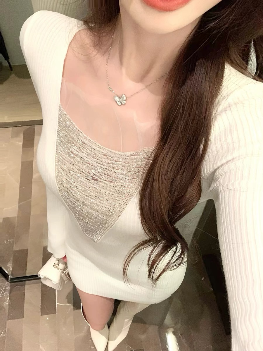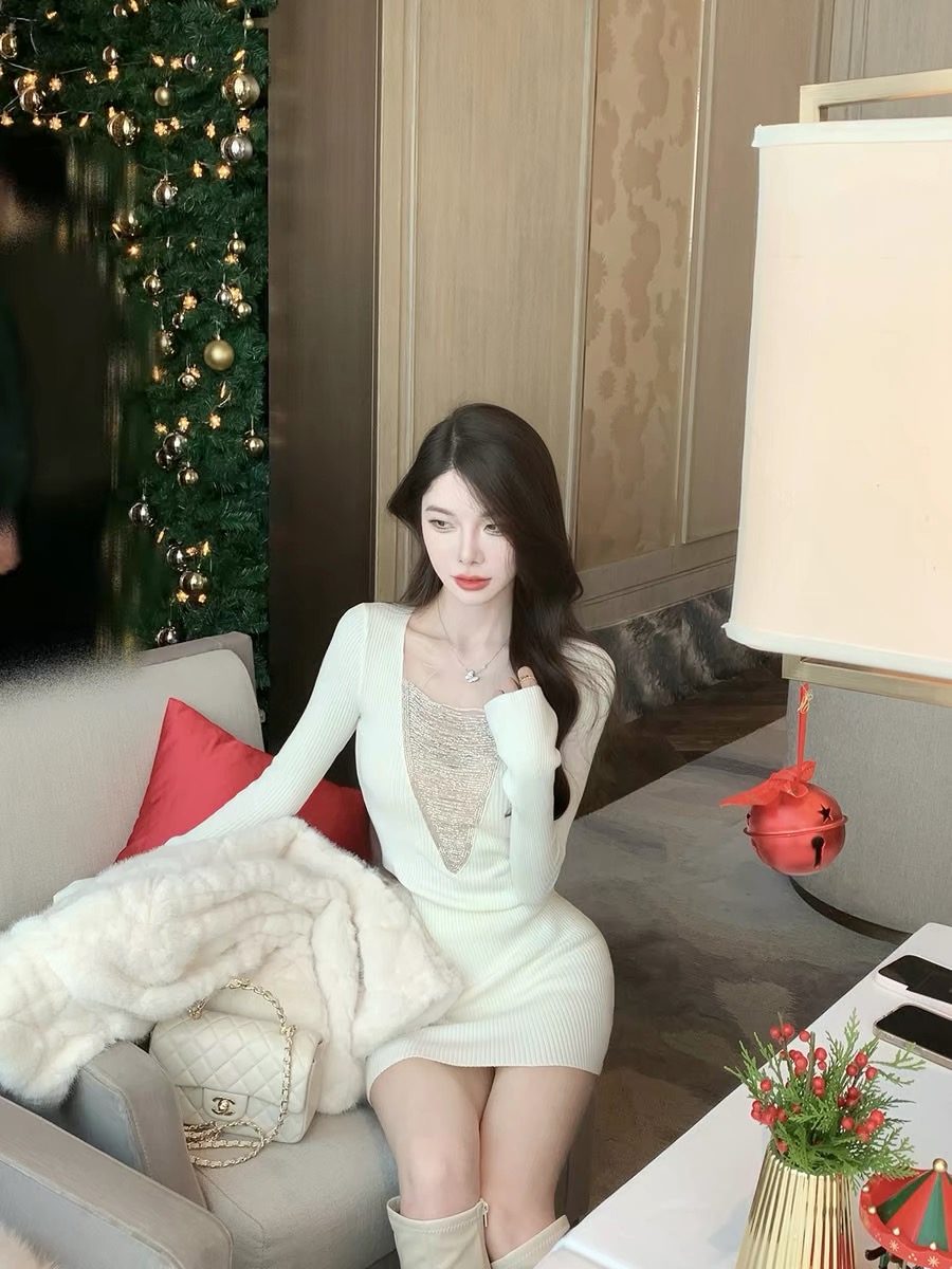 JustQin晚宴流光2025秋冬新款烫钻性感气质千金针织连衣裙女
