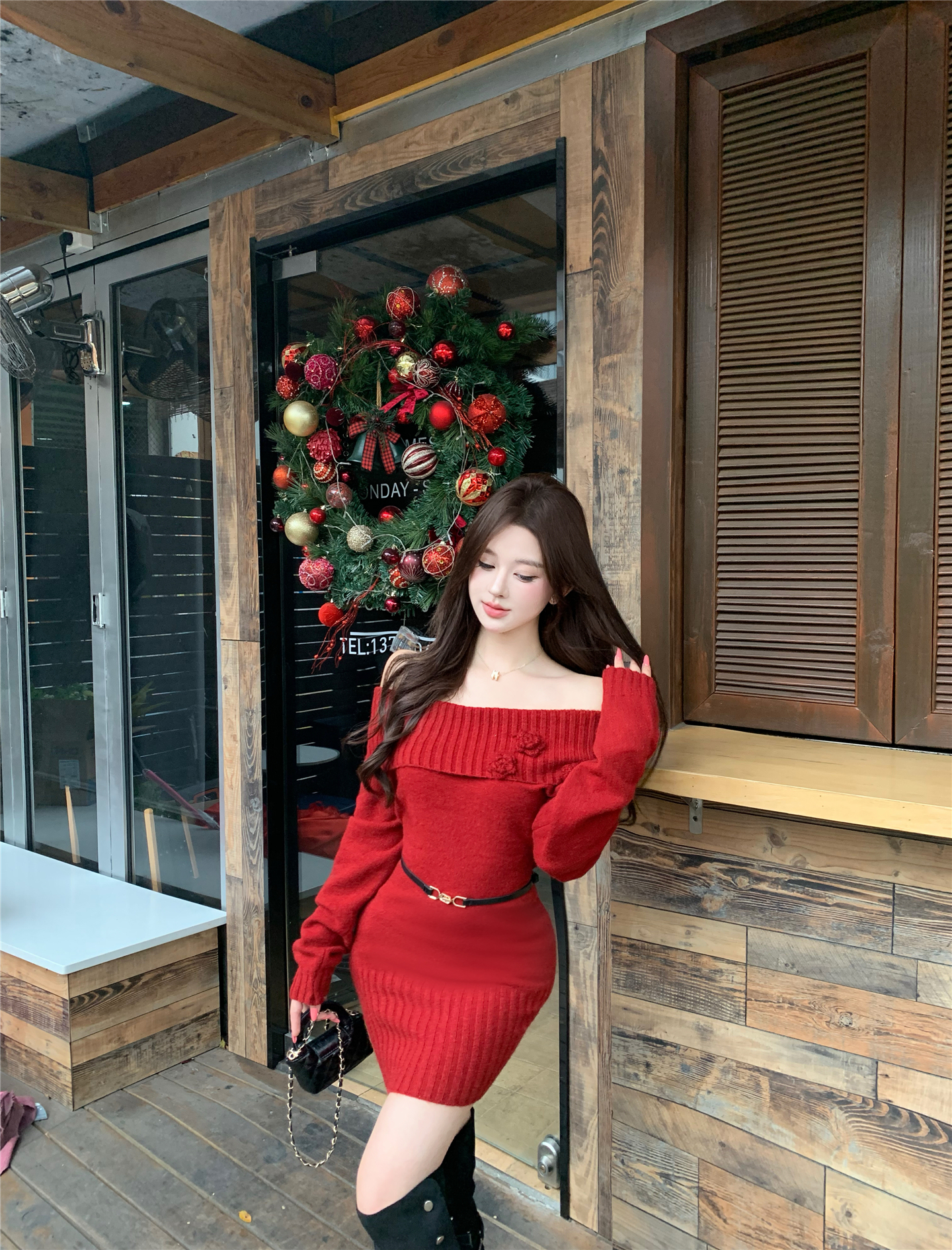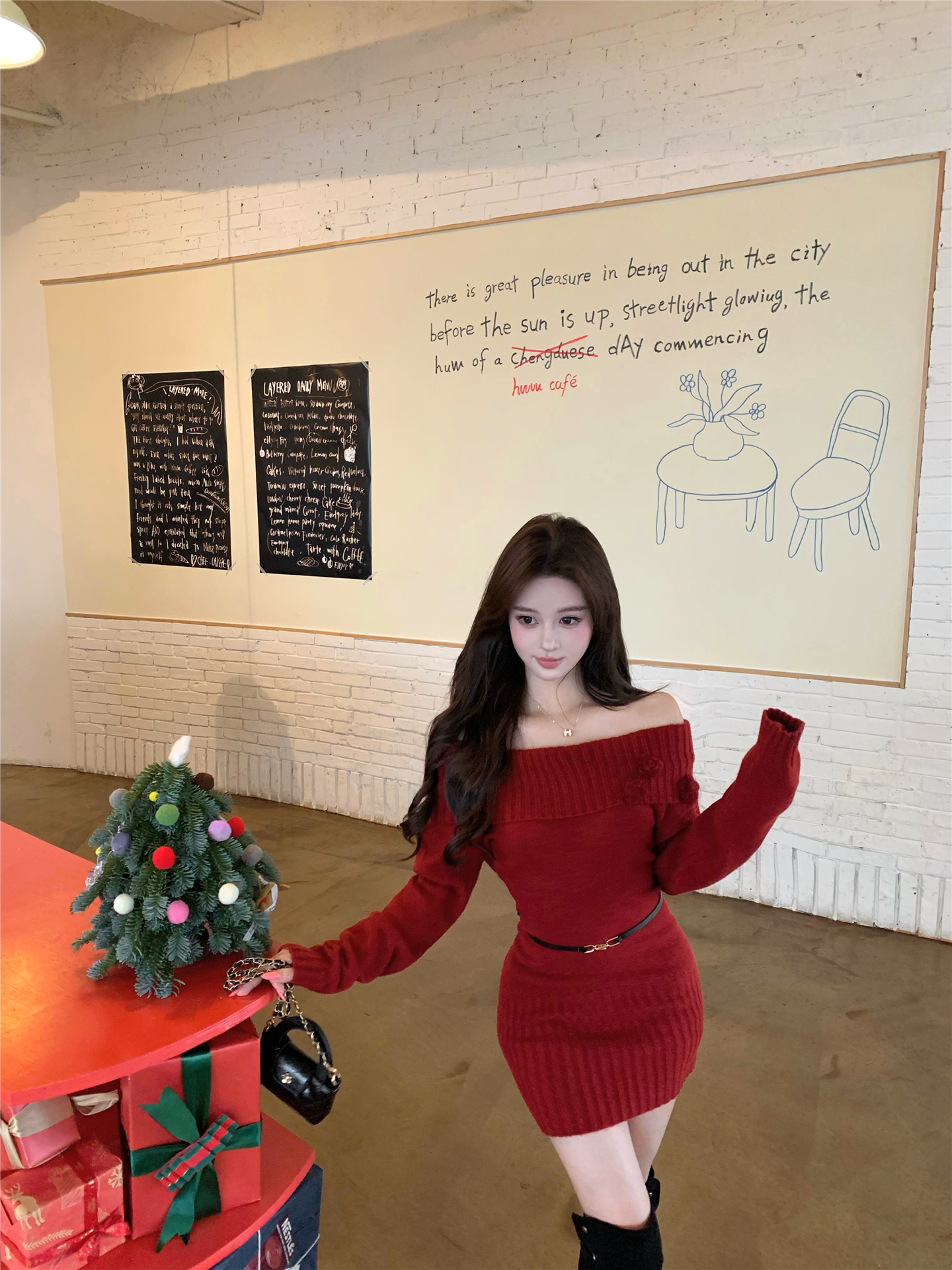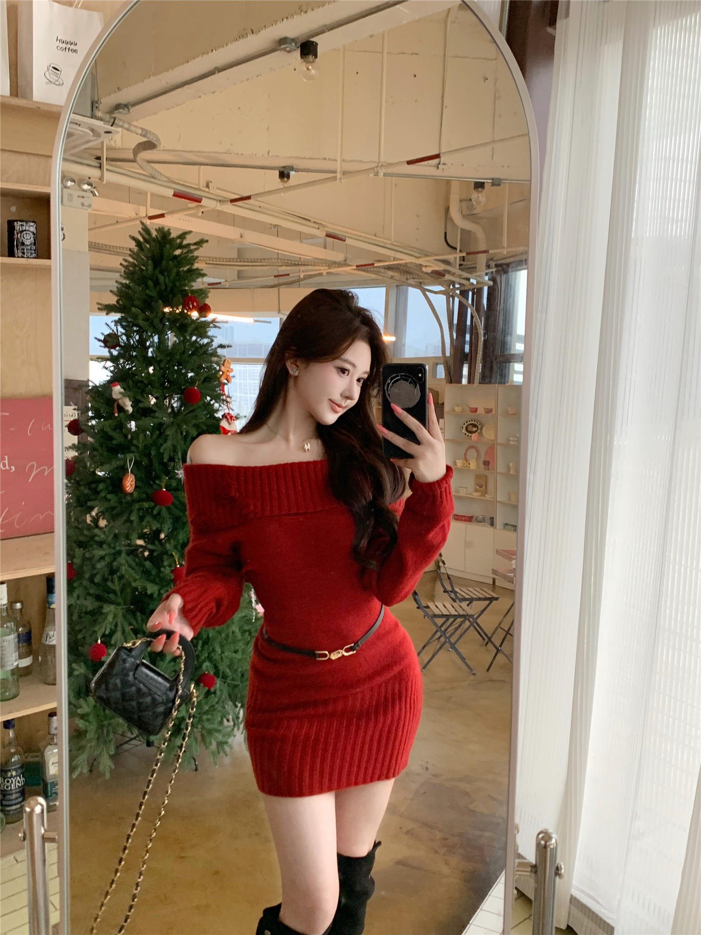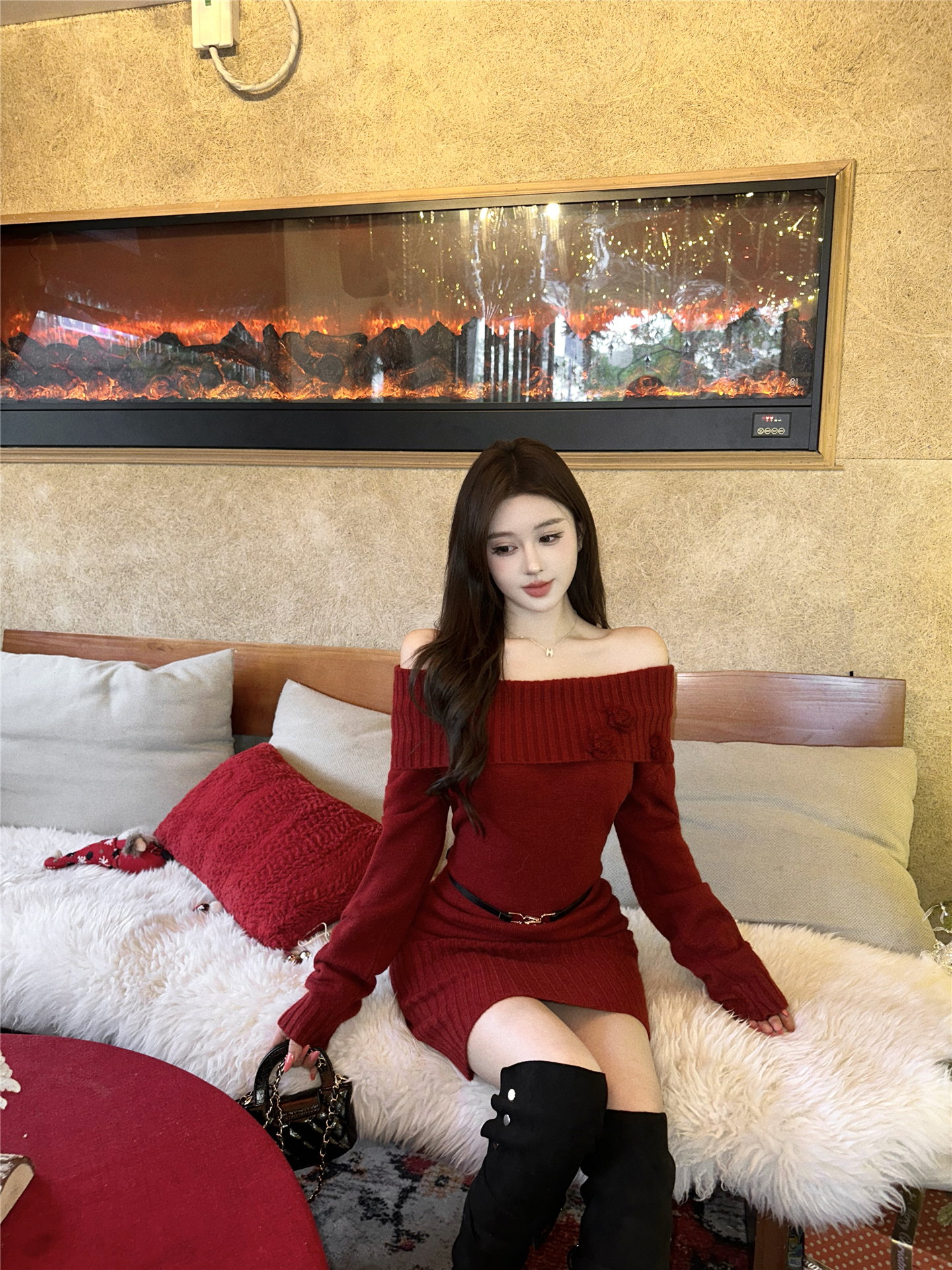 实拍 秋冬 新年穿搭红色连衣裙一字肩女修身毛衣裙生日包臀裙