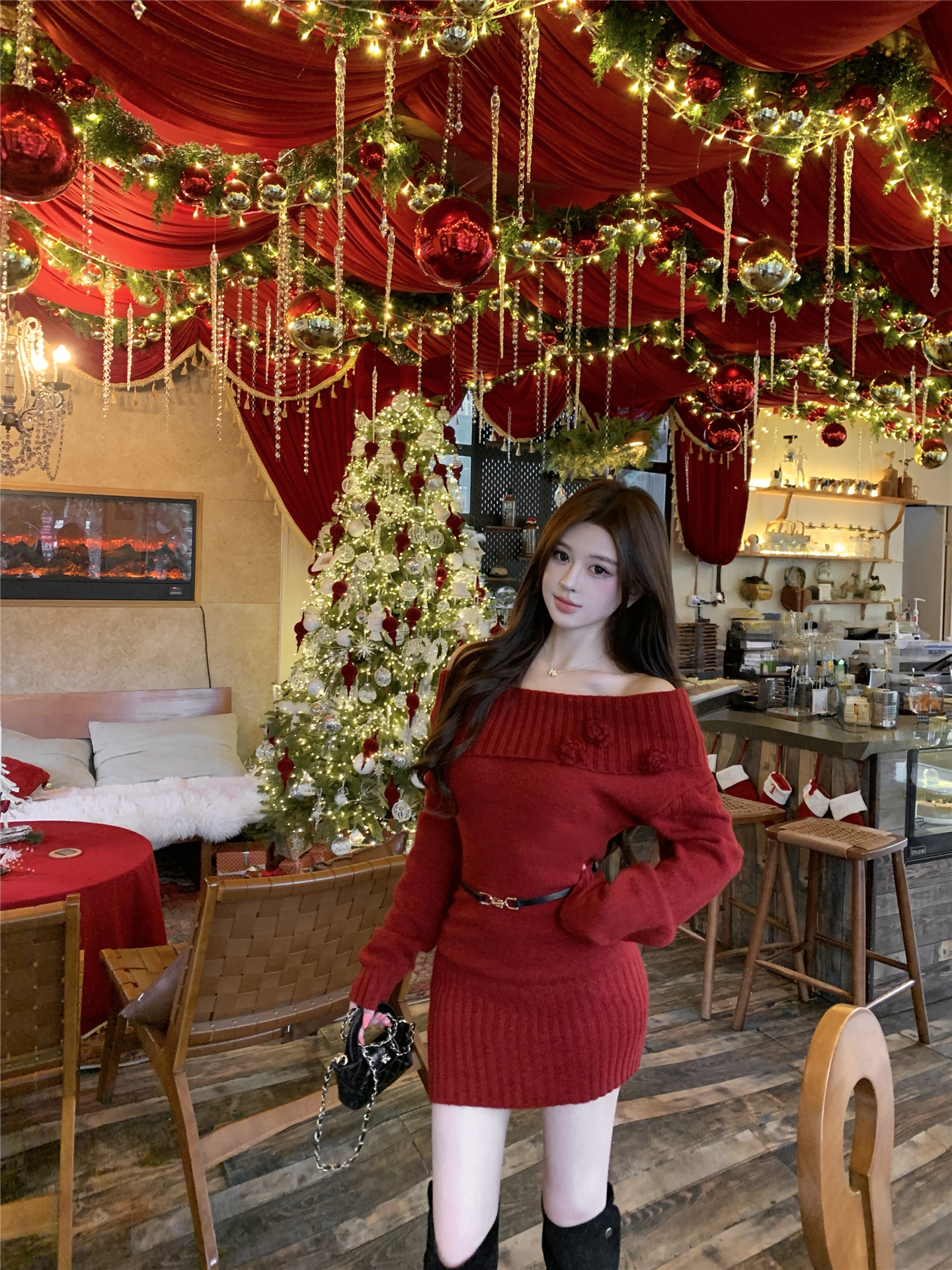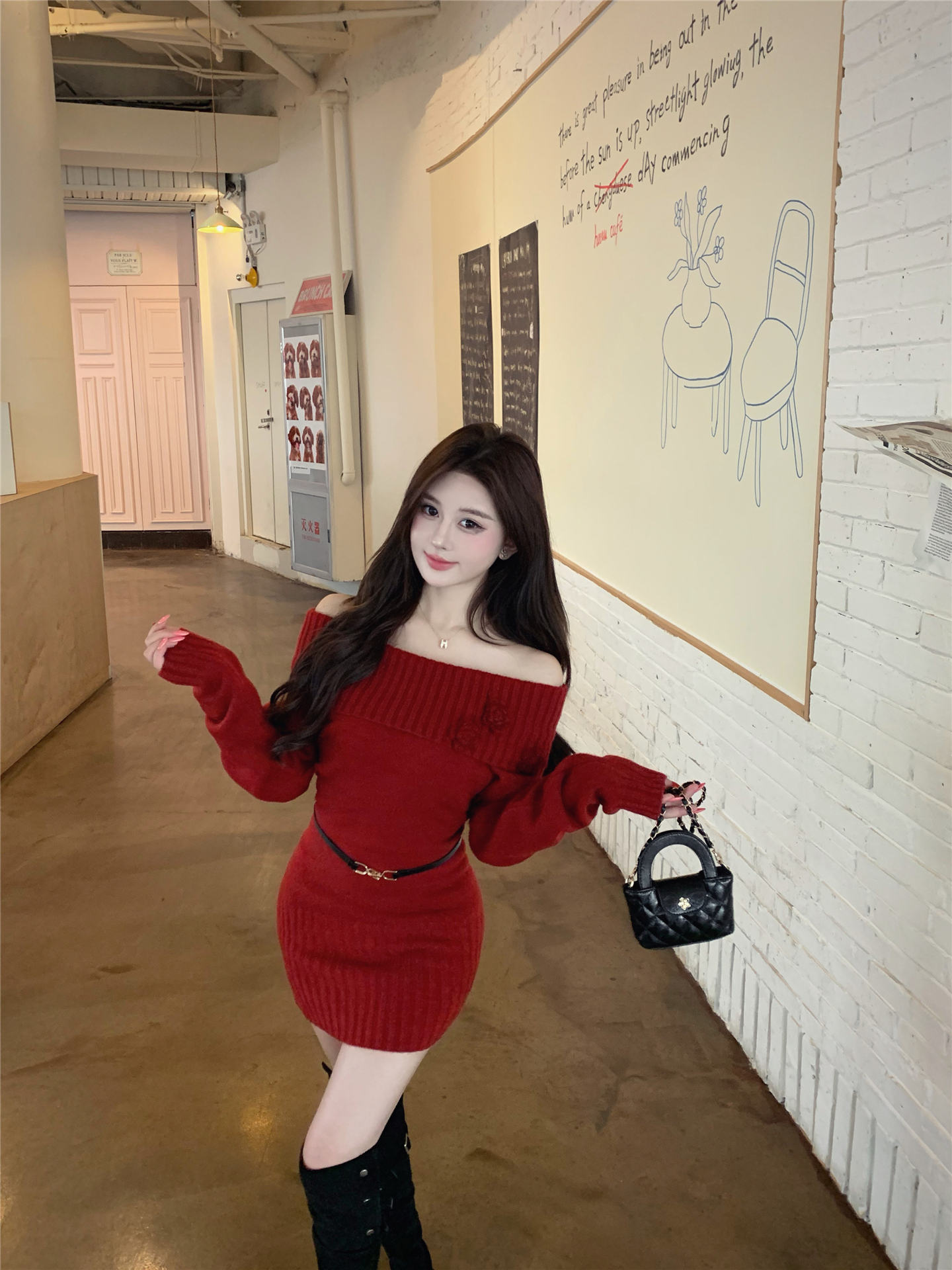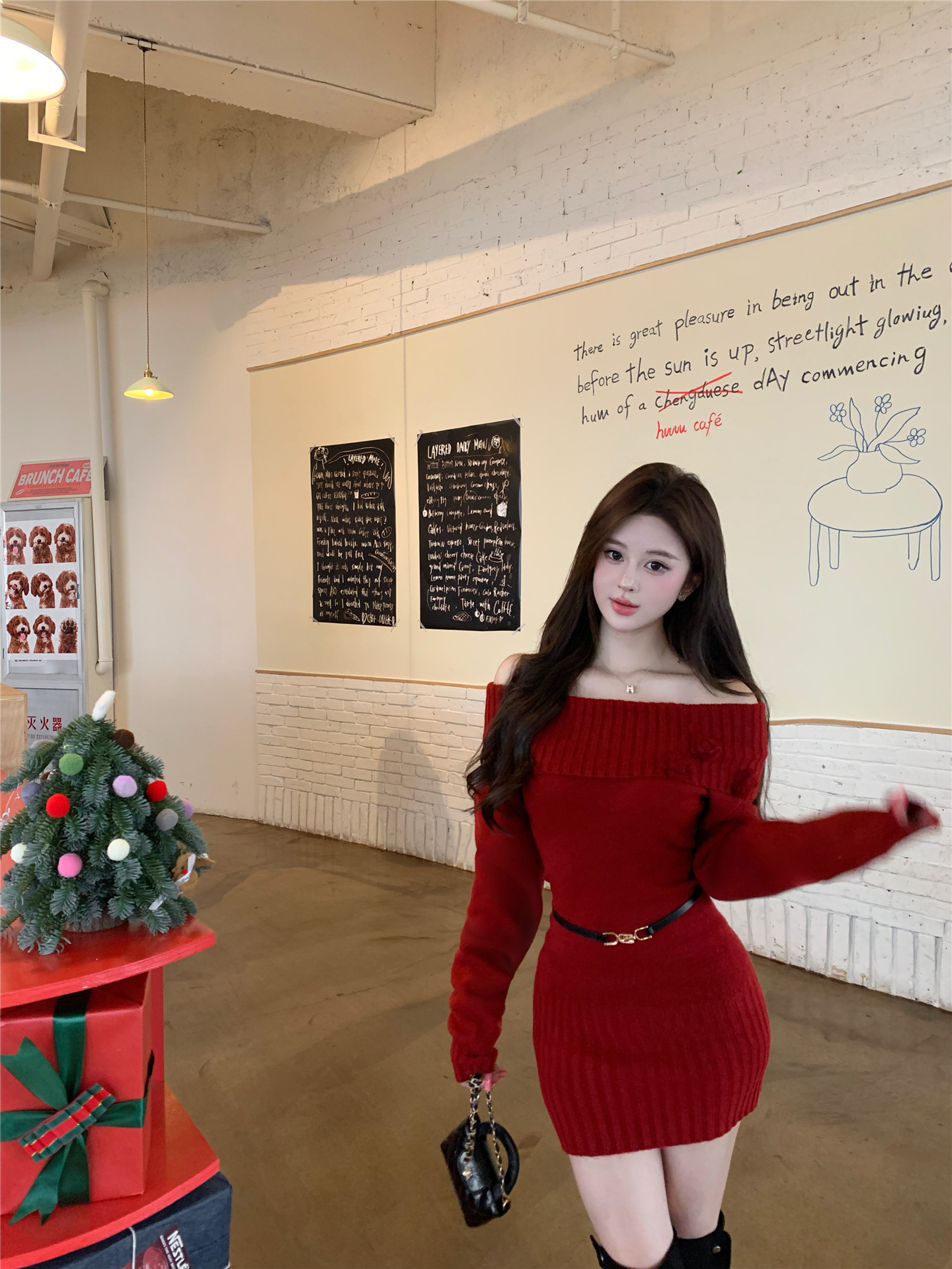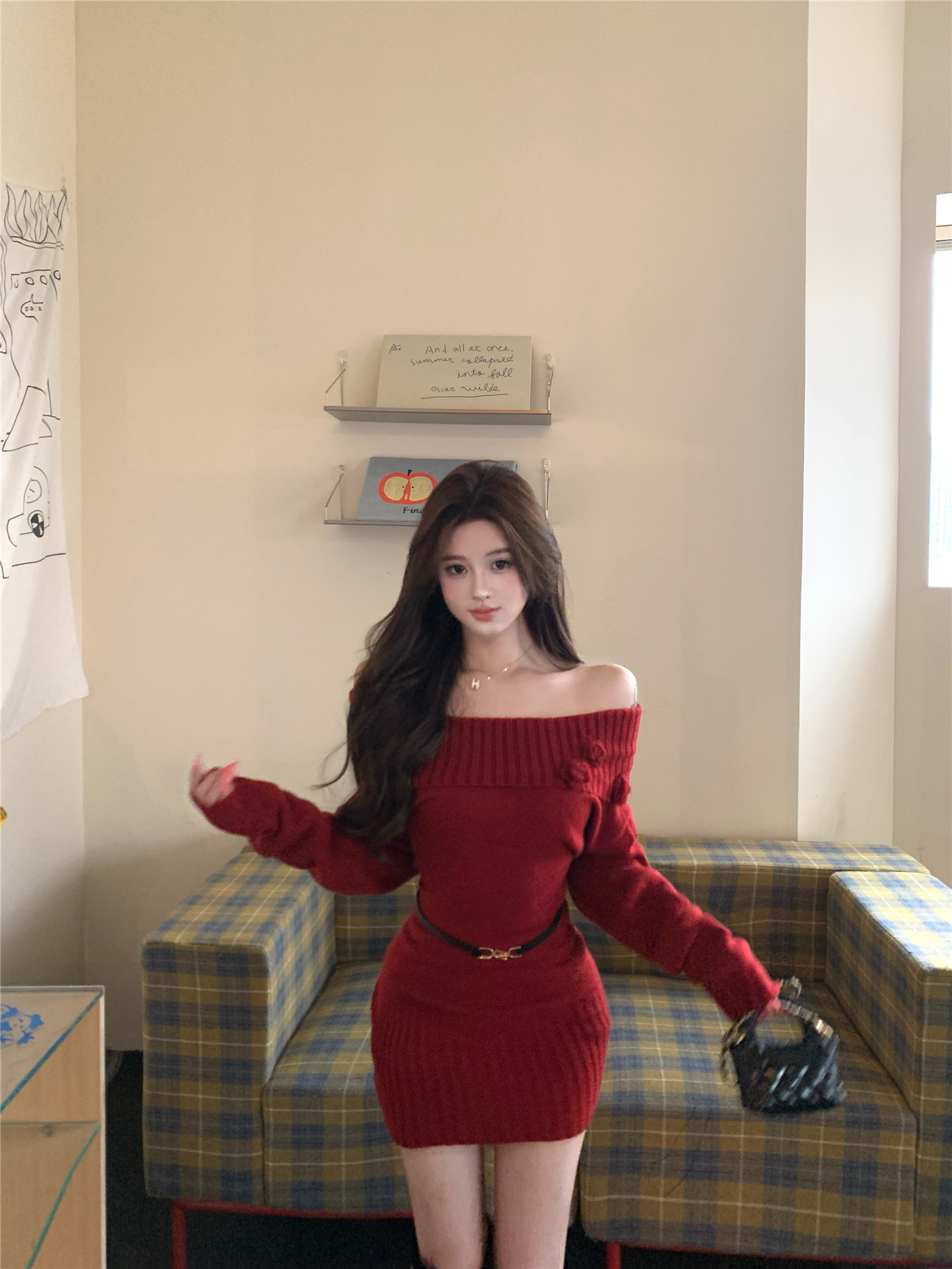 实拍 秋冬 新年穿搭红色连衣裙一字肩女修身毛衣裙生日包臀裙