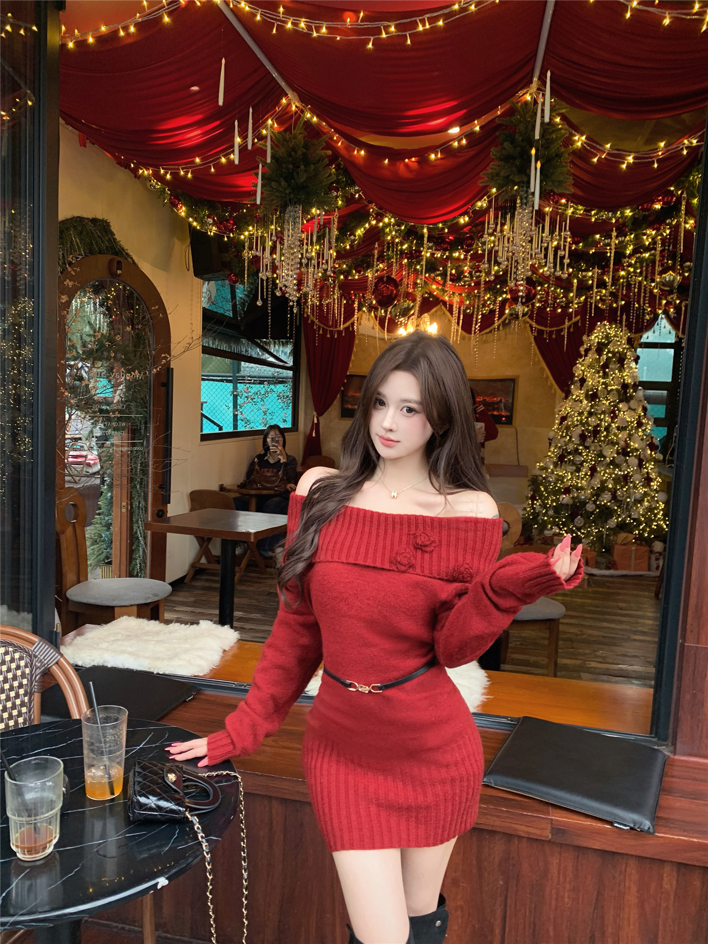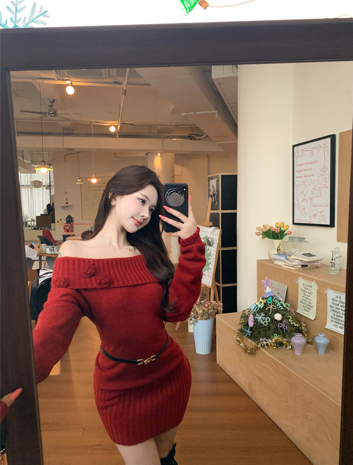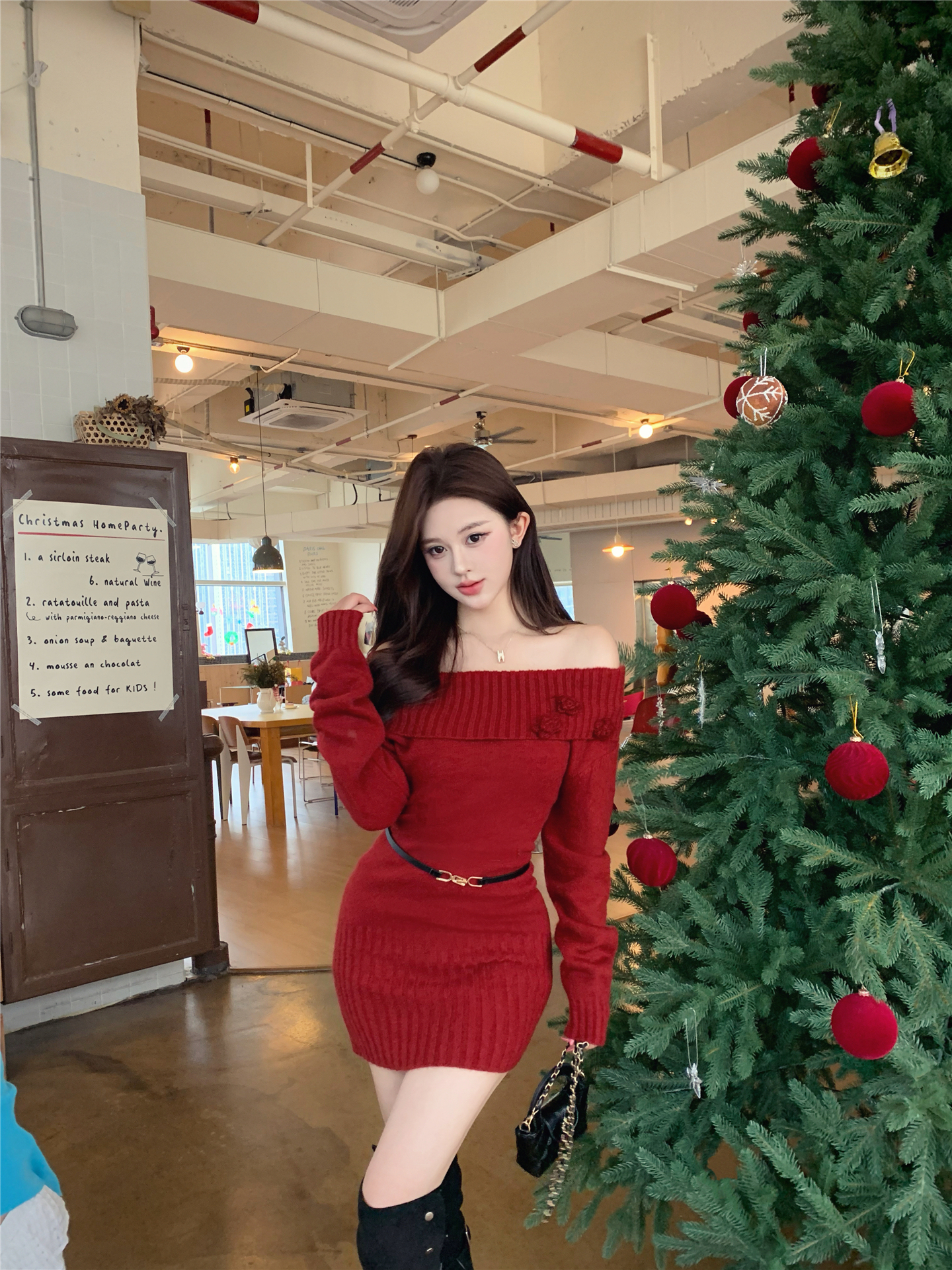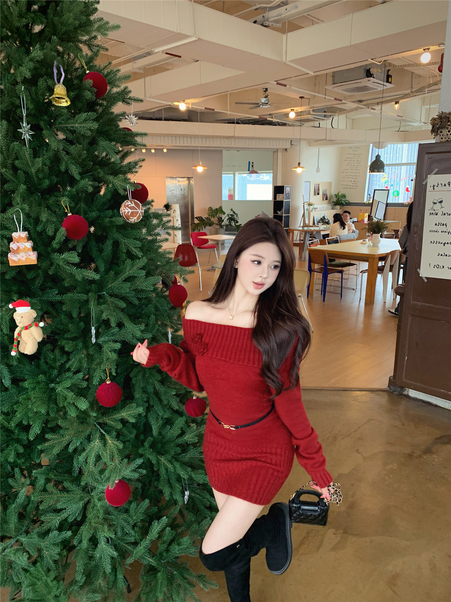 实拍 秋冬 新年穿搭红色连衣裙一字肩女修身毛衣裙生日包臀裙