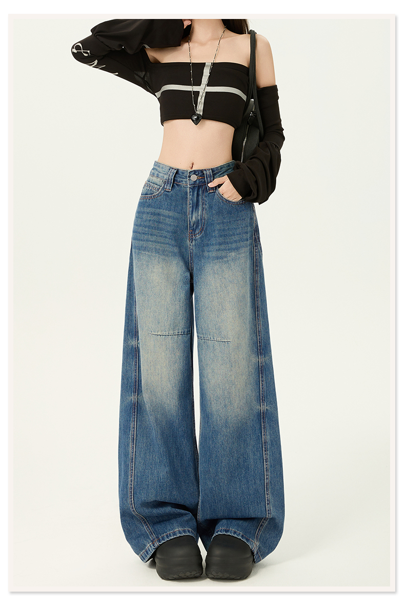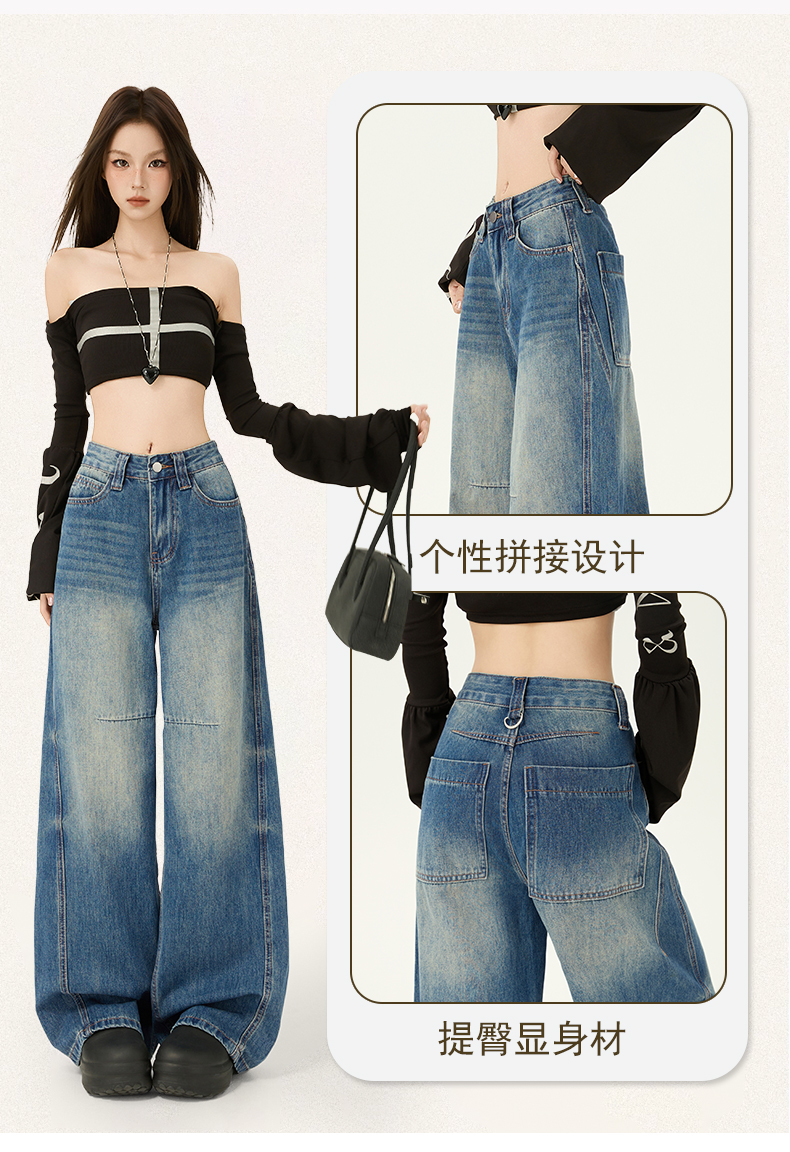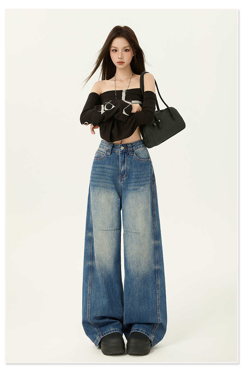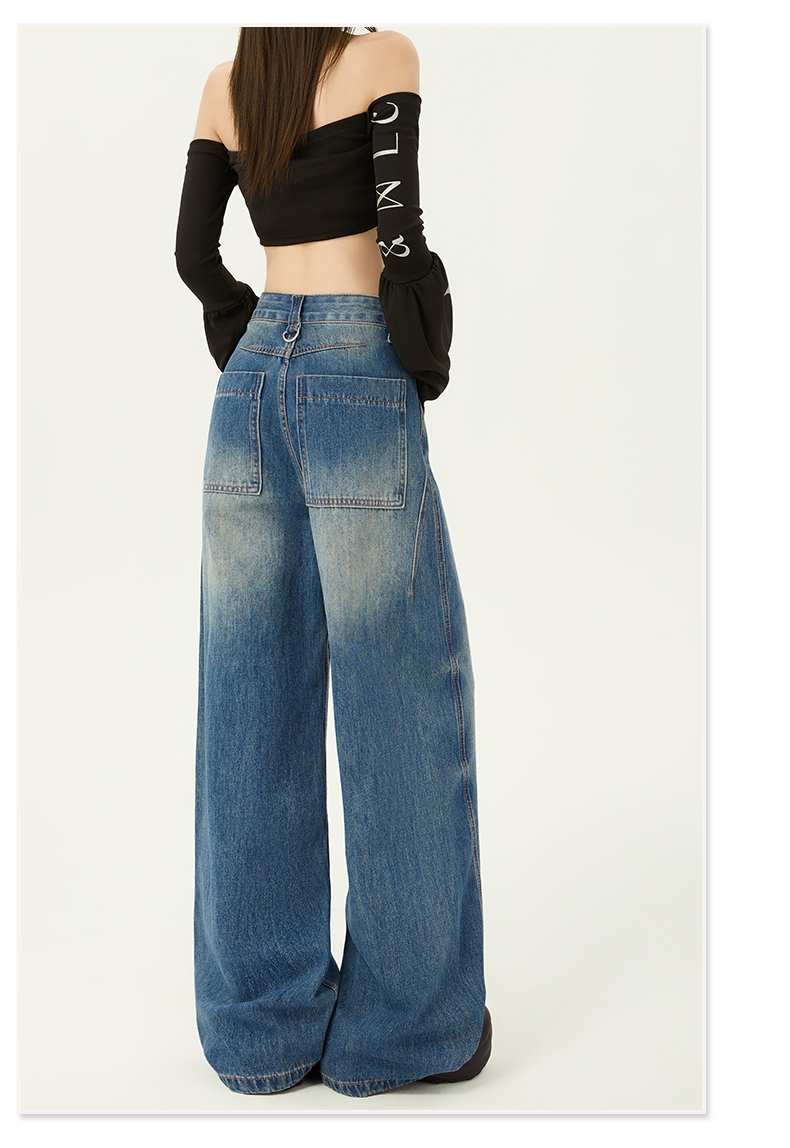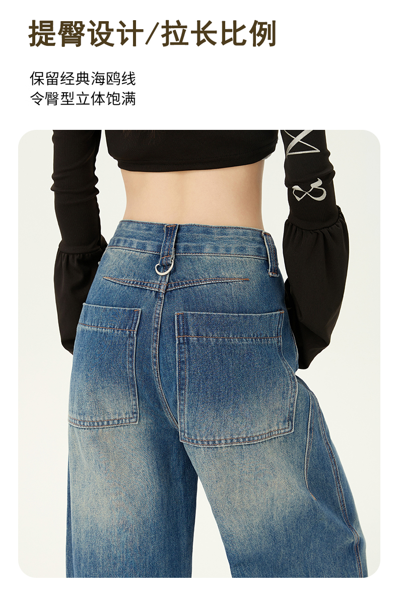 2026春季新款美式复古提臀高腰宽松牛仔裤直筒阔腿拖地牛仔裤女