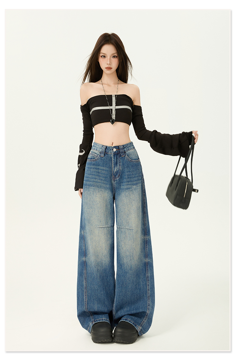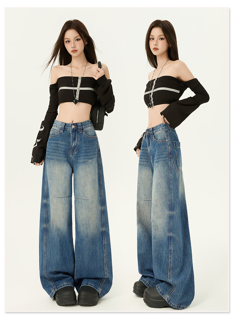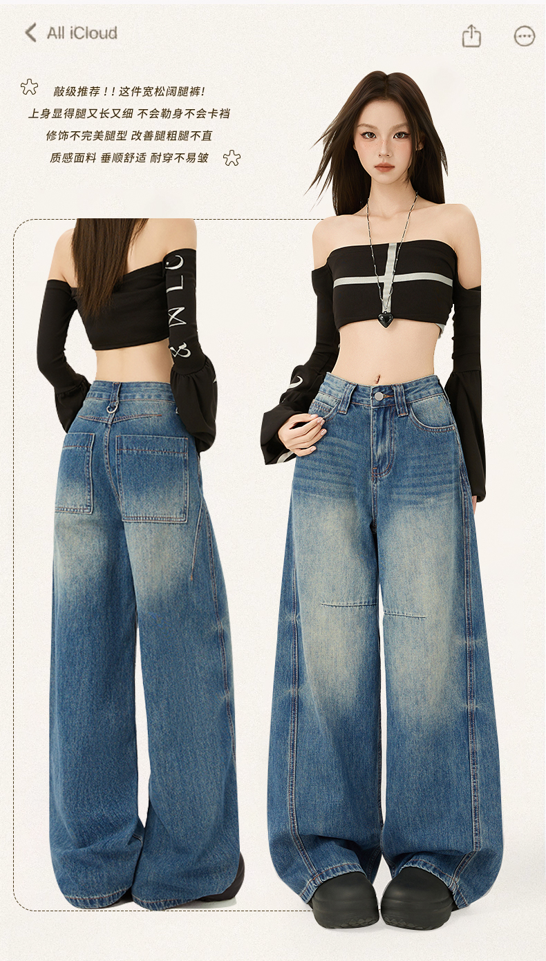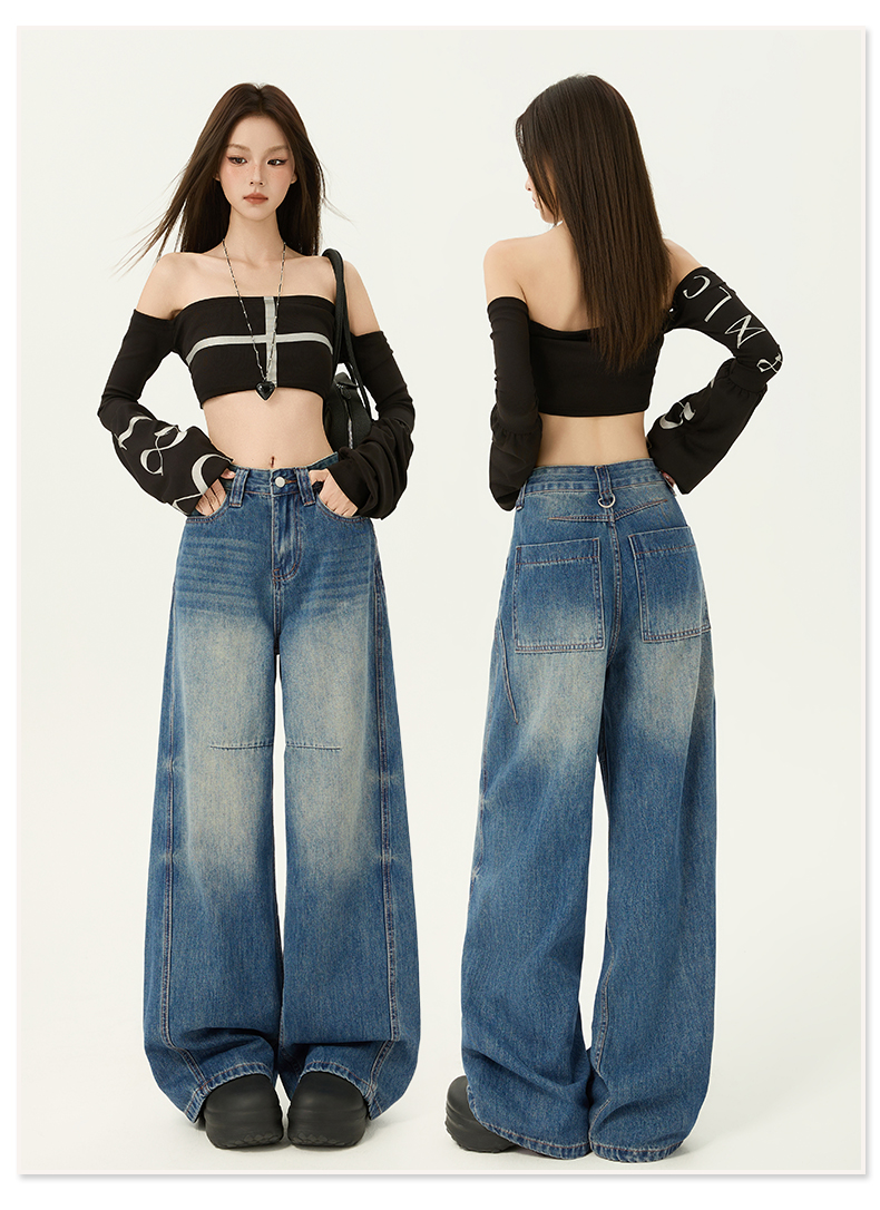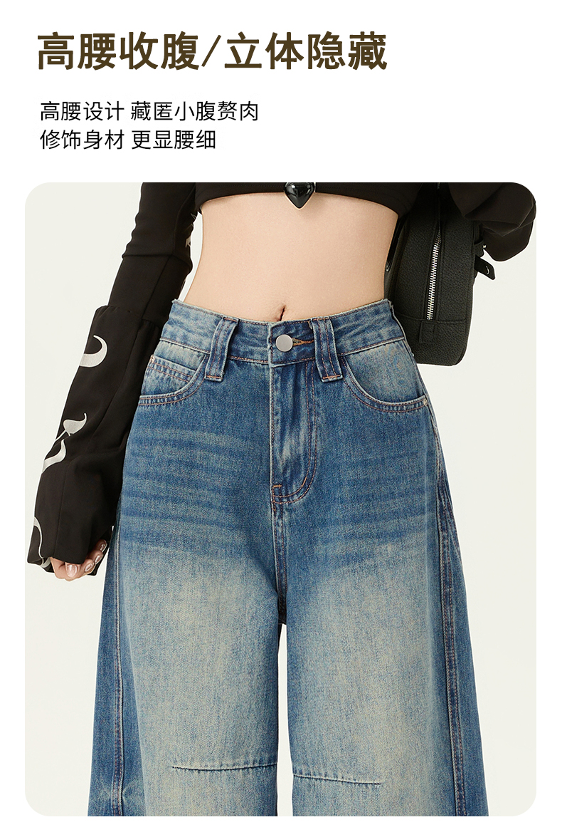 2026春季新款美式复古提臀高腰宽松牛仔裤直筒阔腿拖地牛仔裤女