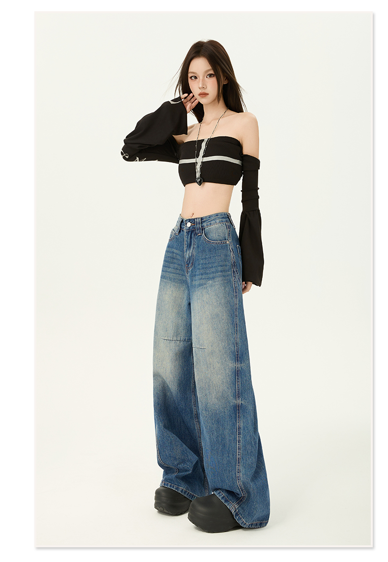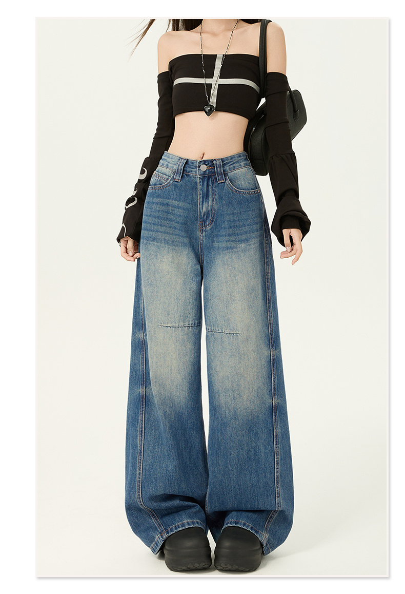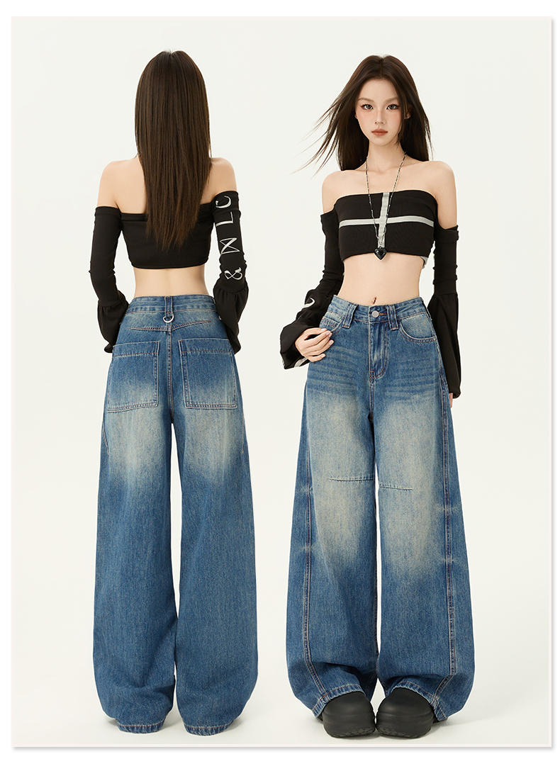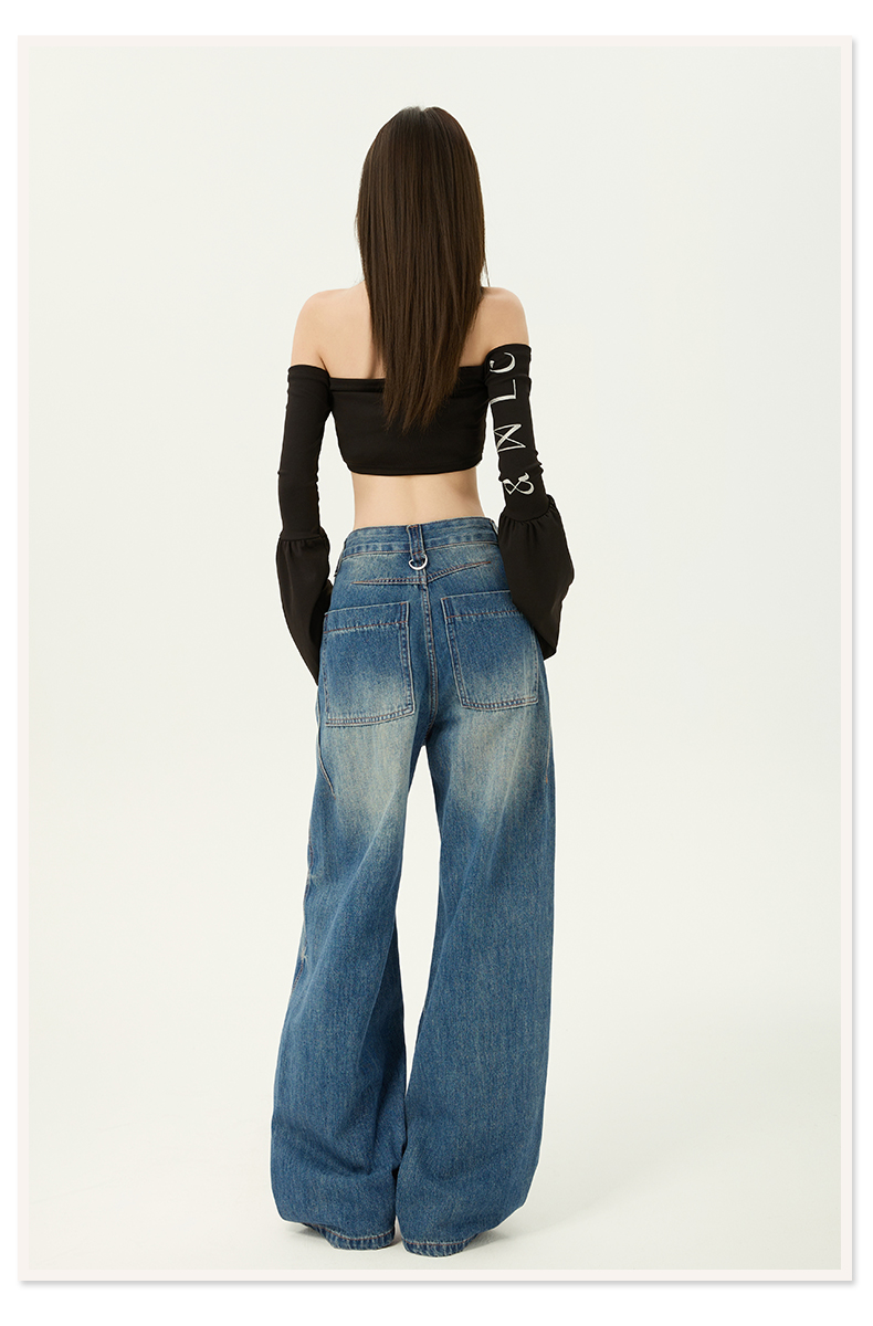 2026春季新款美式复古提臀高腰宽松牛仔裤直筒阔腿拖地牛仔裤女