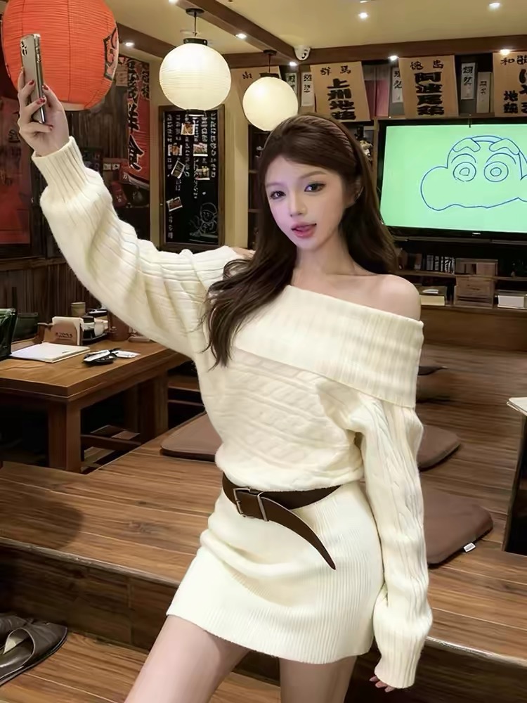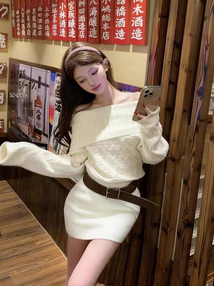白色一字肩针织连衣裙子女秋冬季2025新款法式巨好看气质包臀短裙