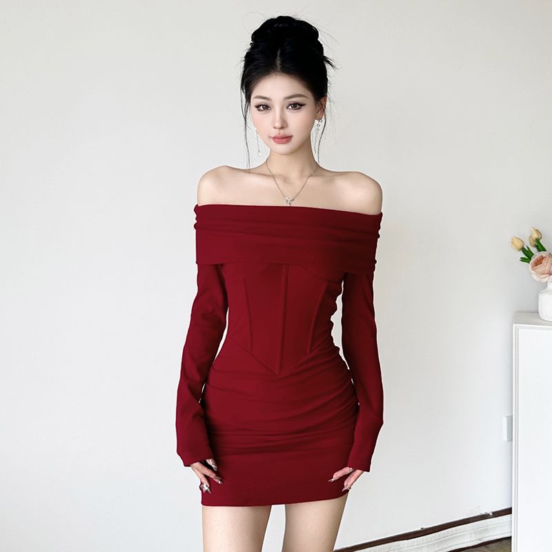 已出货 辣妹红色一字肩连衣裙女冬季修身毛衣打底裙鱼骨包臀短裙