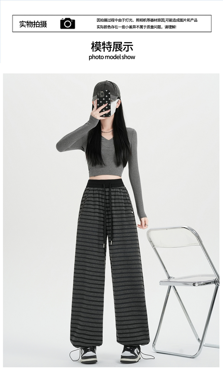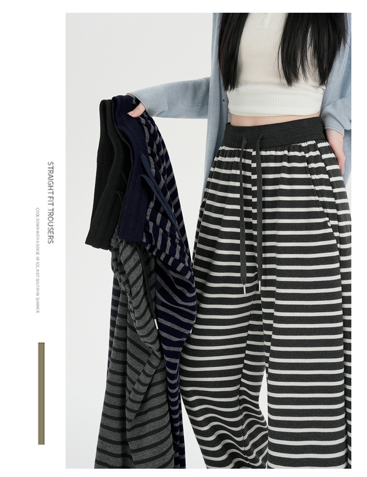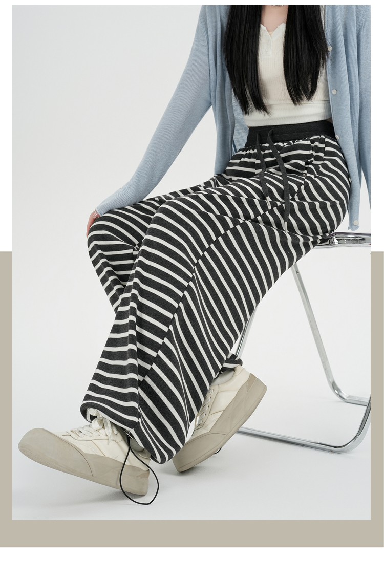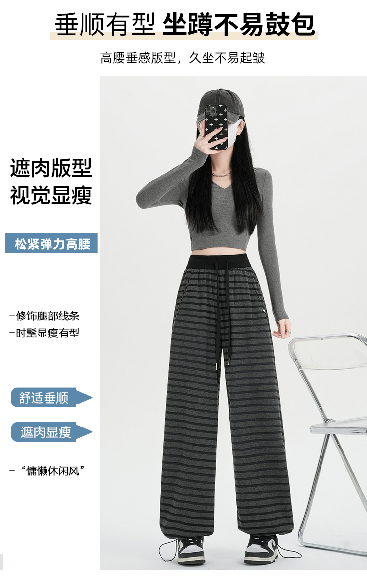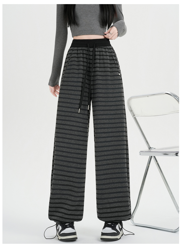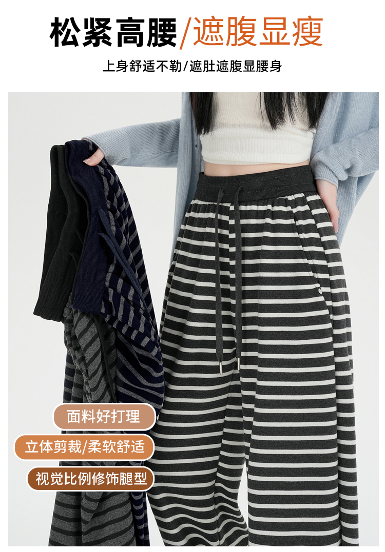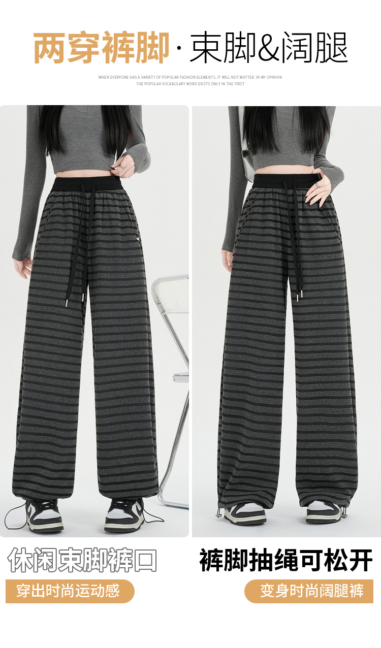 黑色条纹加绒阔腿休闲裤女春季新款高腰抽绳宽松直筒针织拖地裤子
