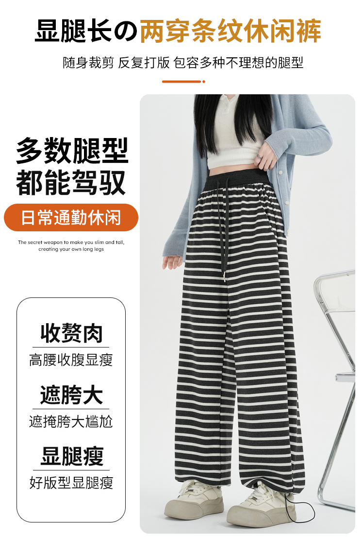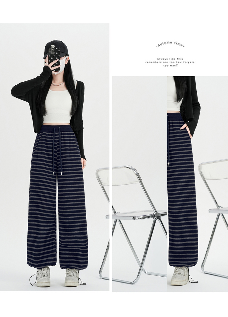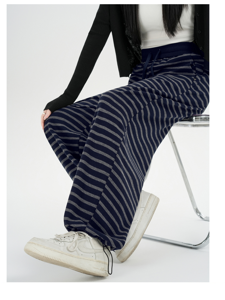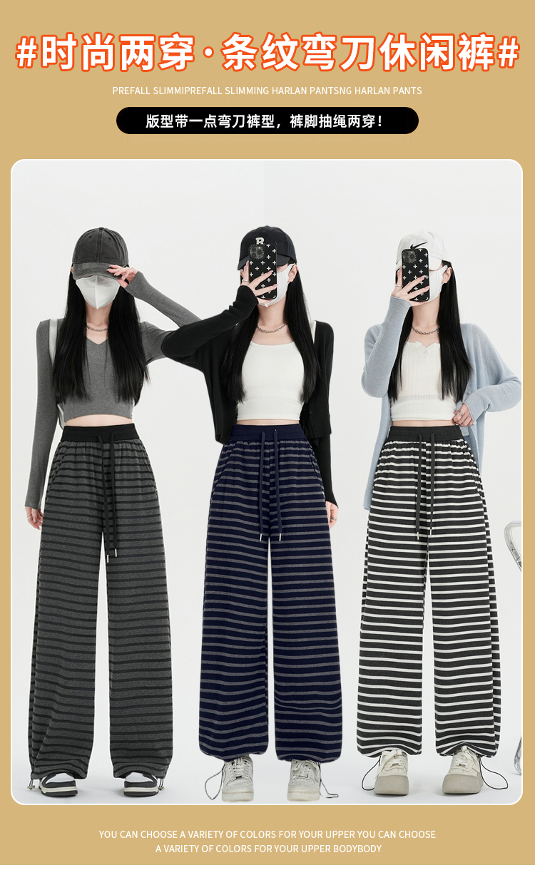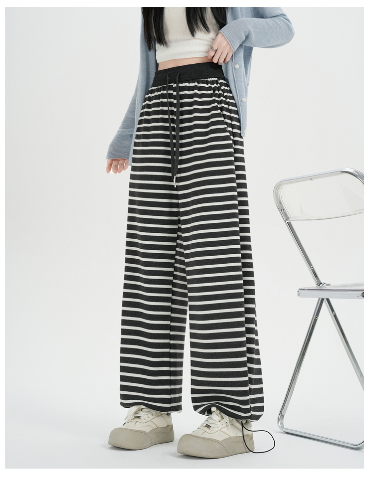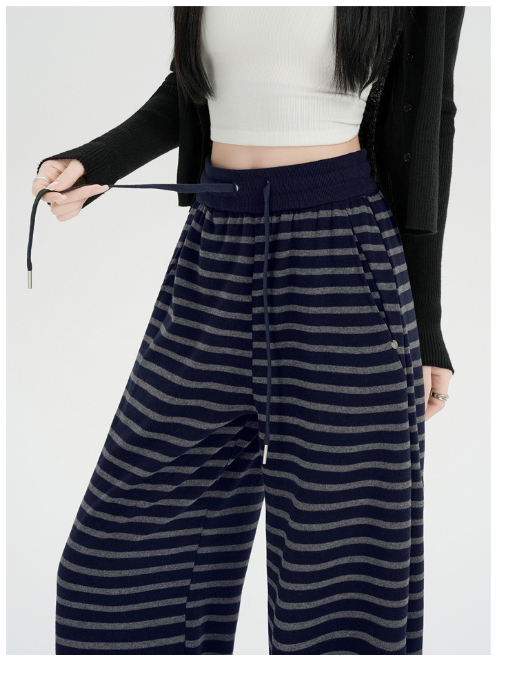 黑色条纹加绒阔腿休闲裤女春季新款高腰抽绳宽松直筒针织拖地裤子