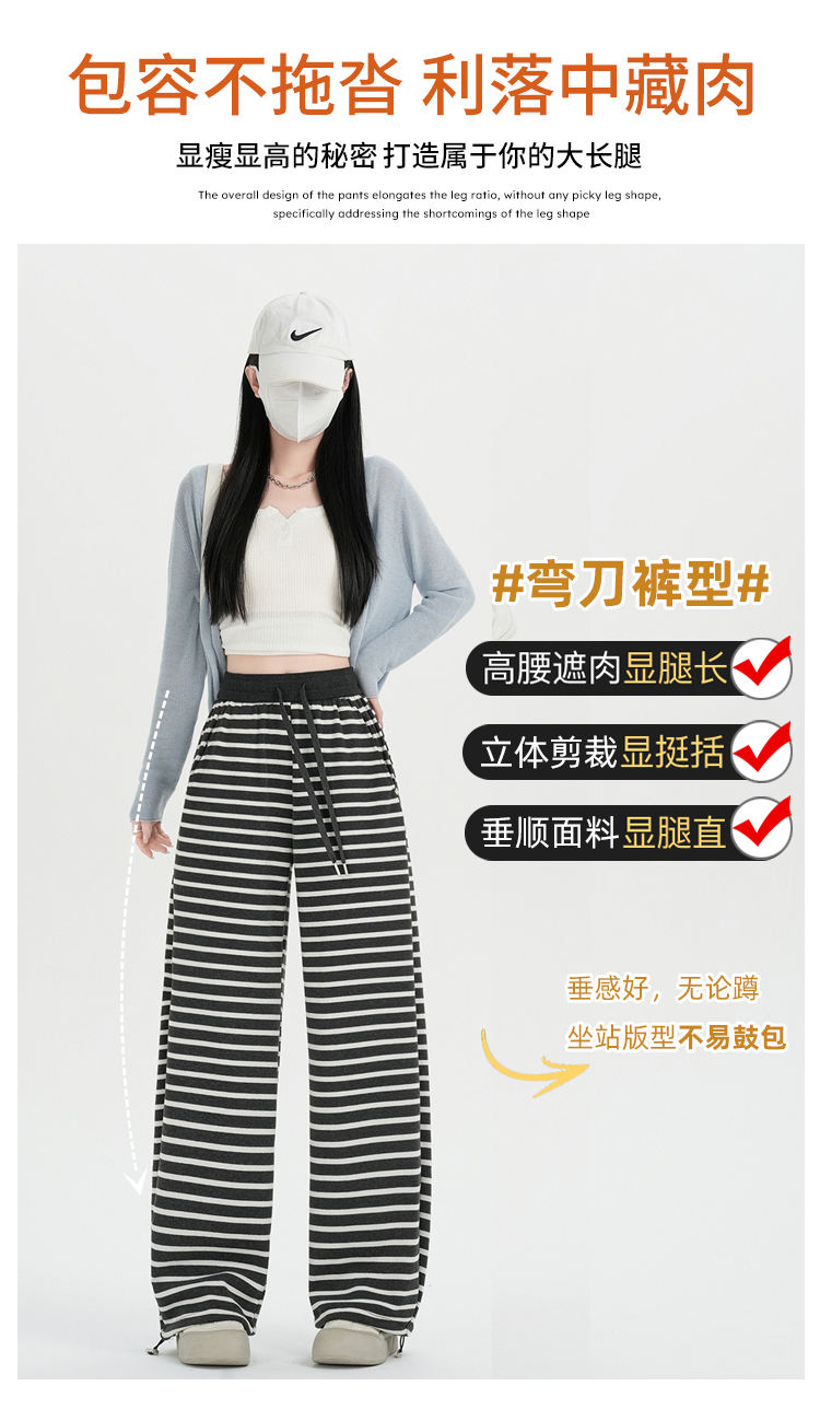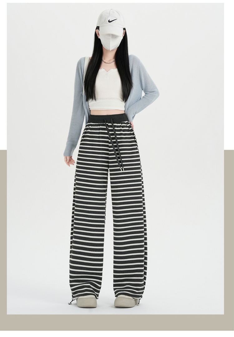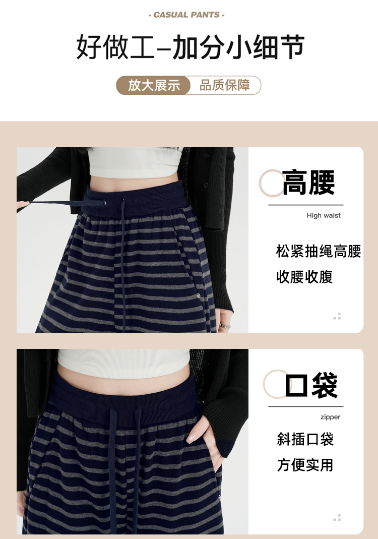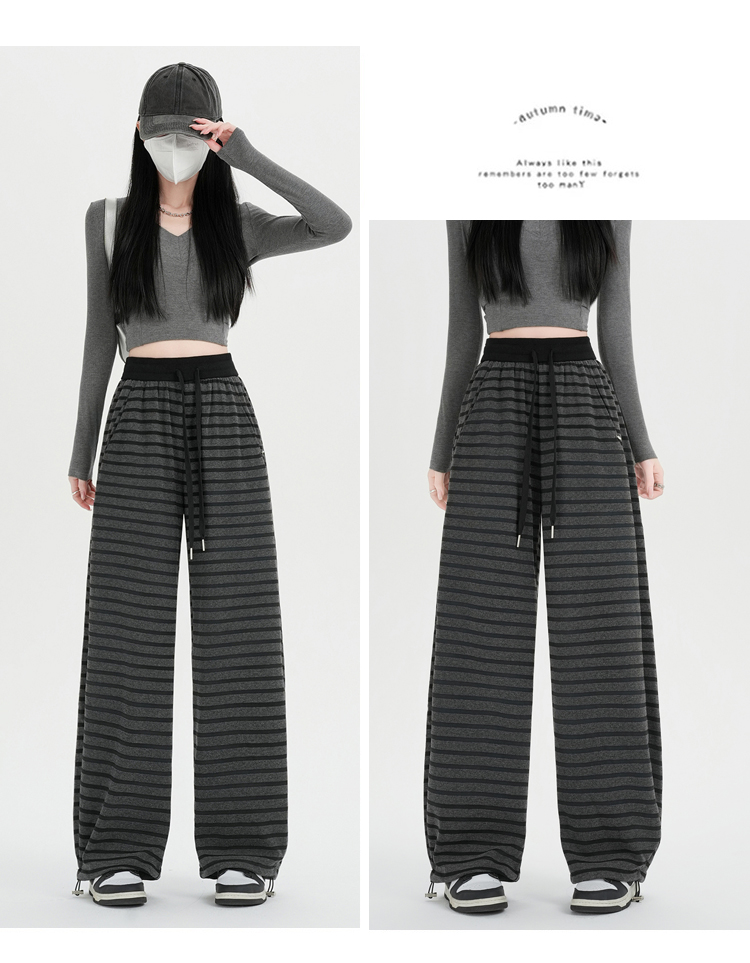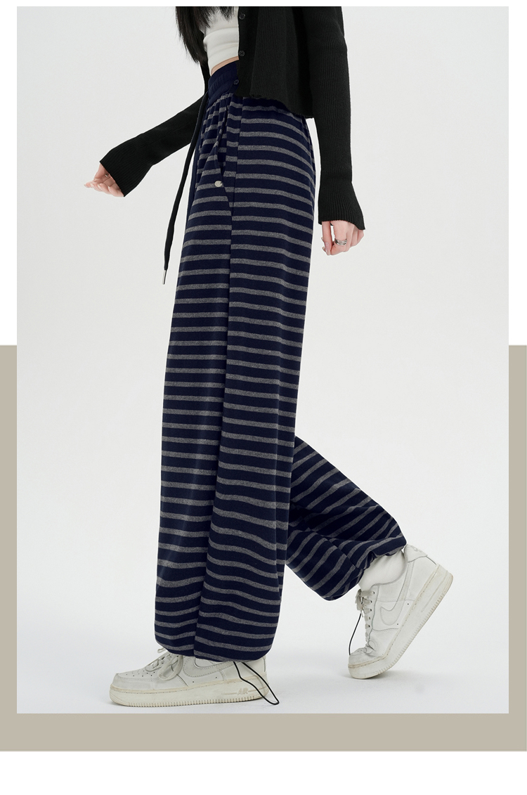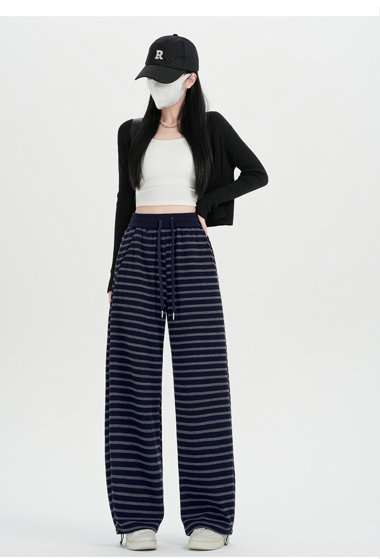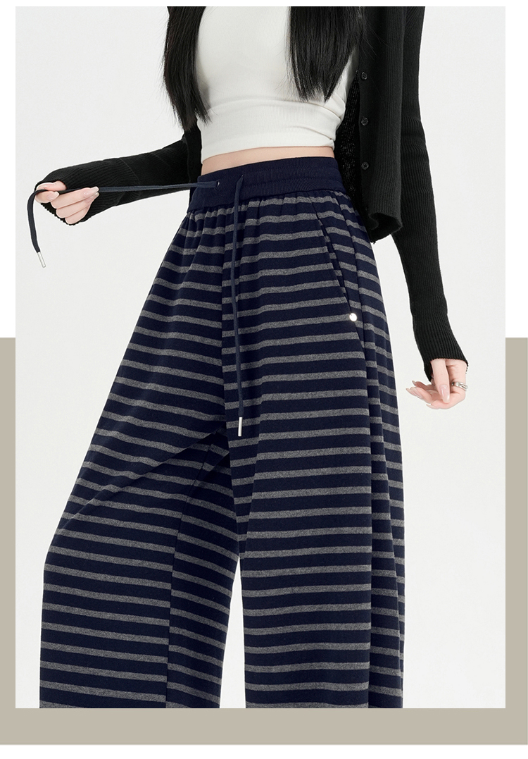 黑色条纹加绒阔腿休闲裤女春季新款高腰抽绳宽松直筒针织拖地裤子