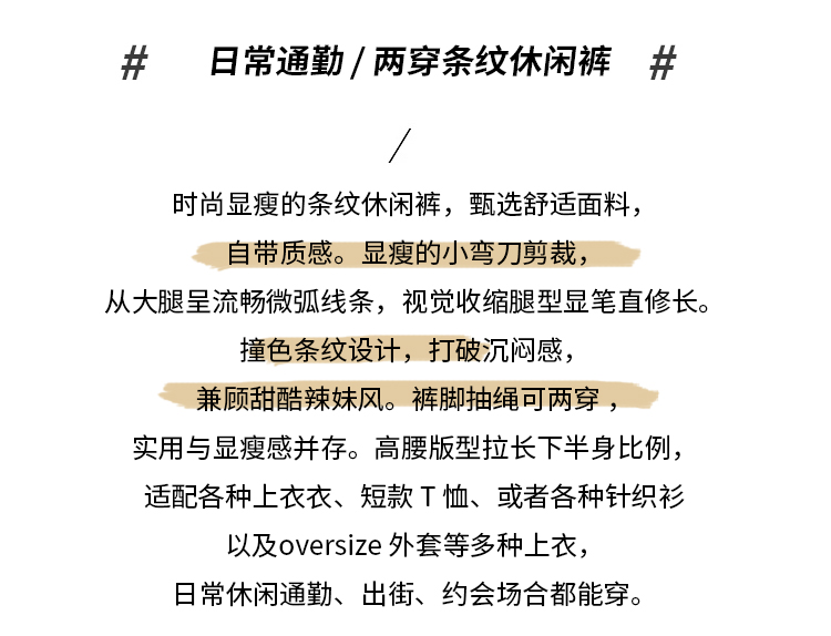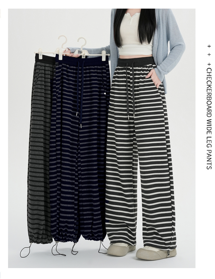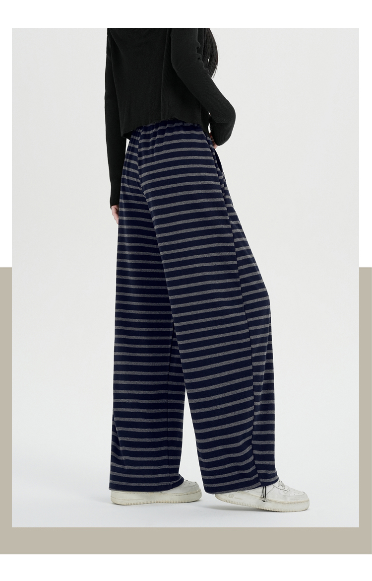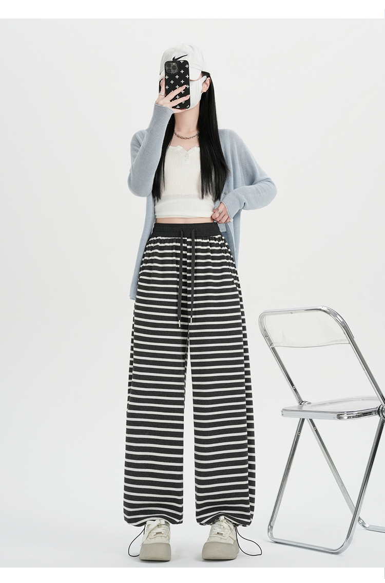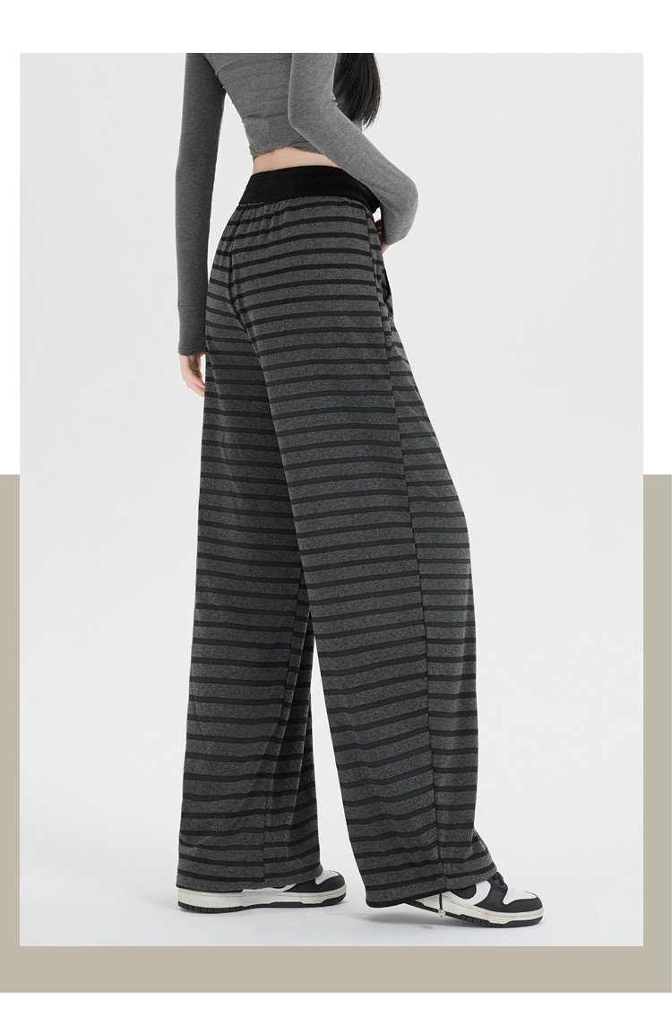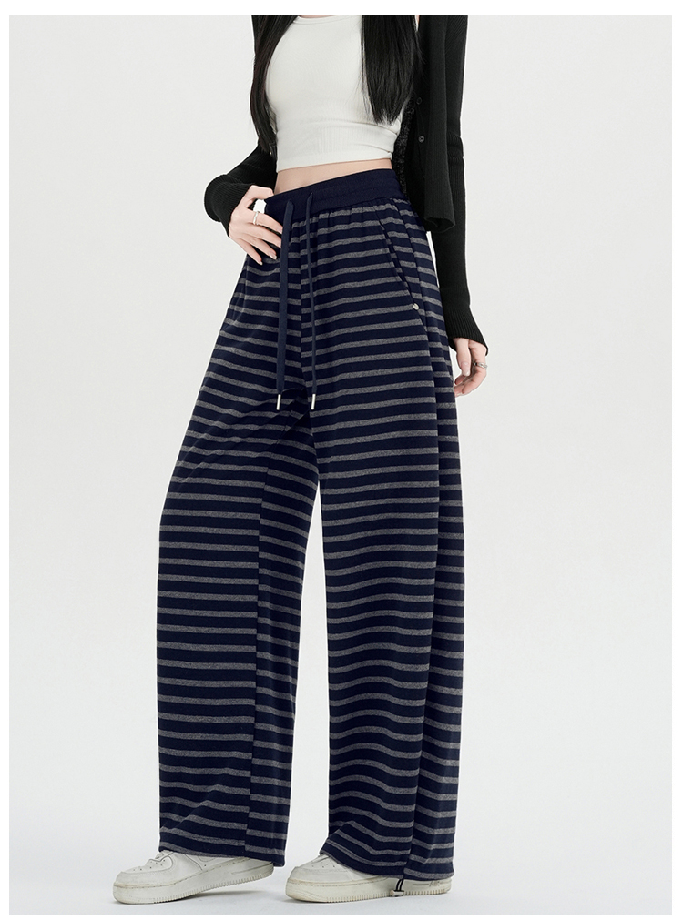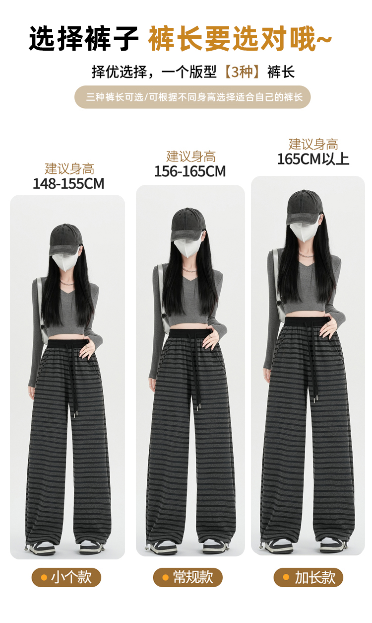 黑色条纹加绒阔腿休闲裤女春季新款高腰抽绳宽松直筒针织拖地裤子