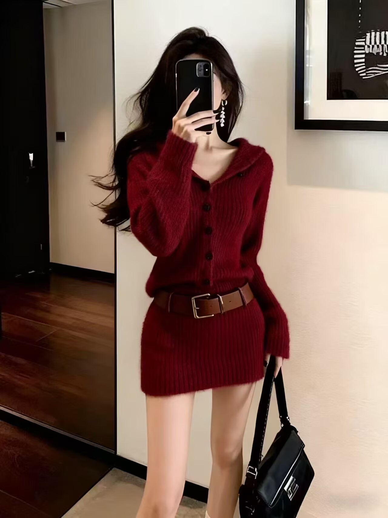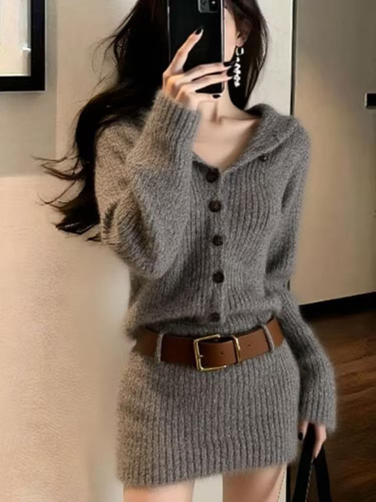 法式红色连帽针织衫连衣裙子女高级感收腰气质毛衣包臀短裙秋冬季