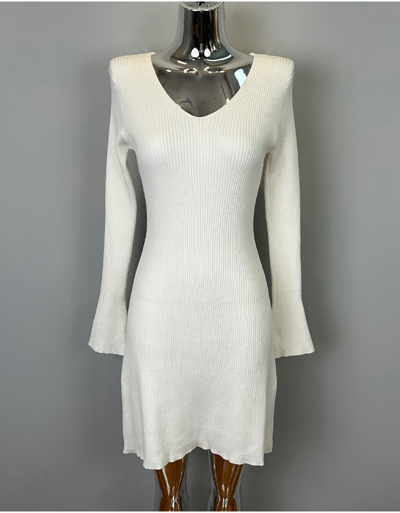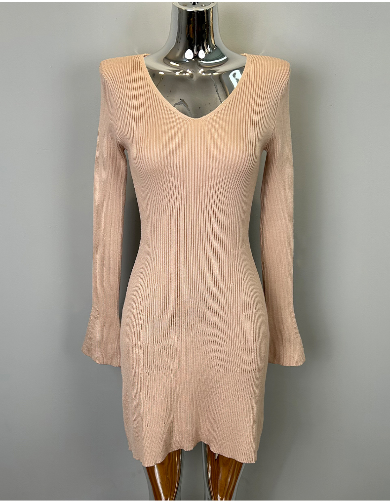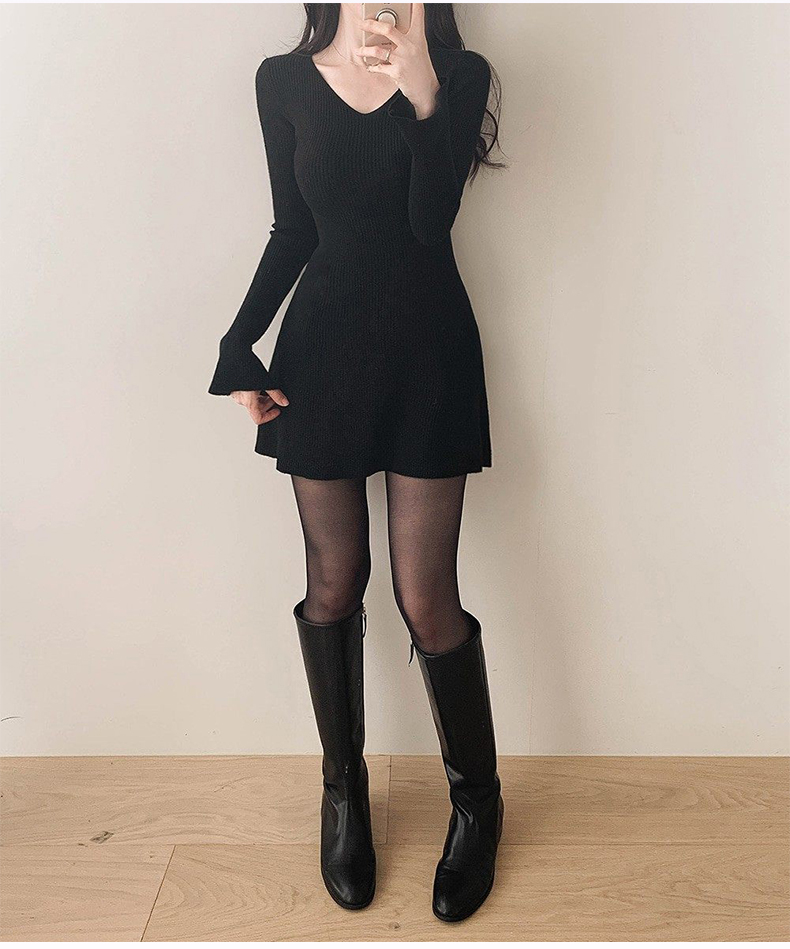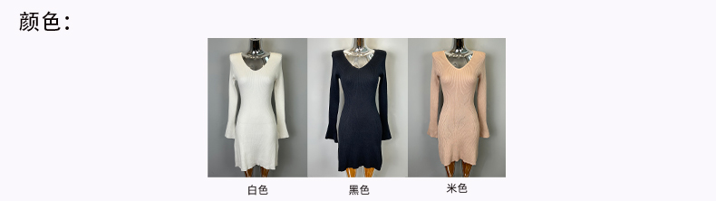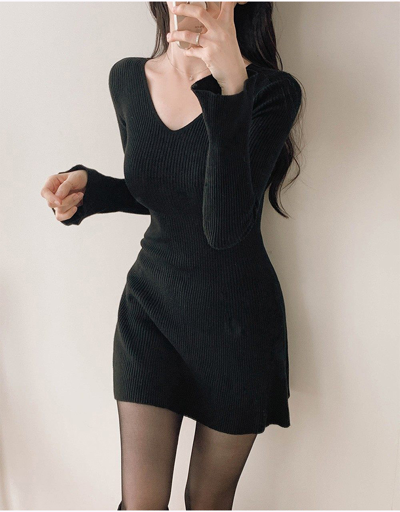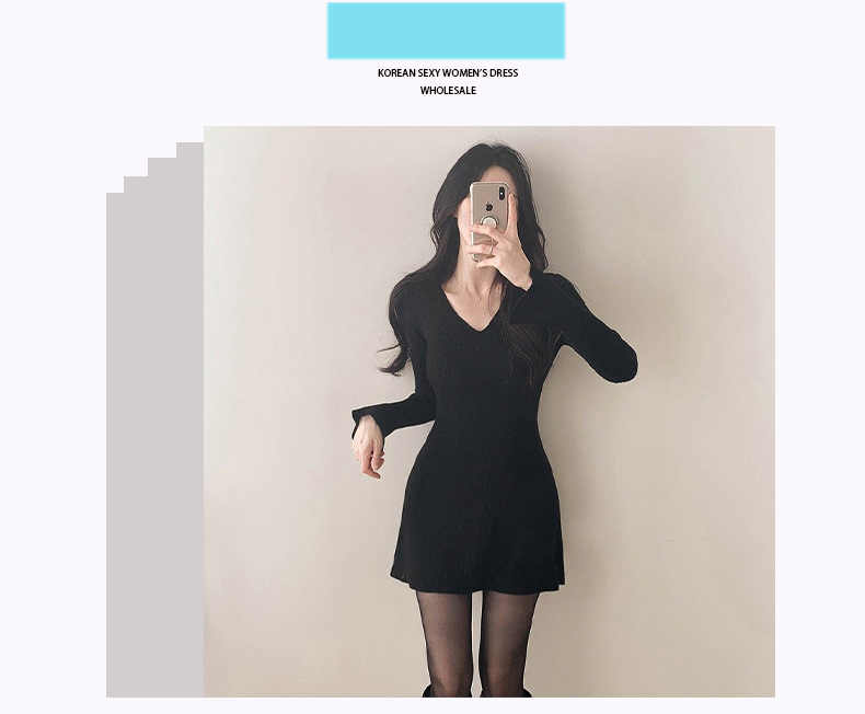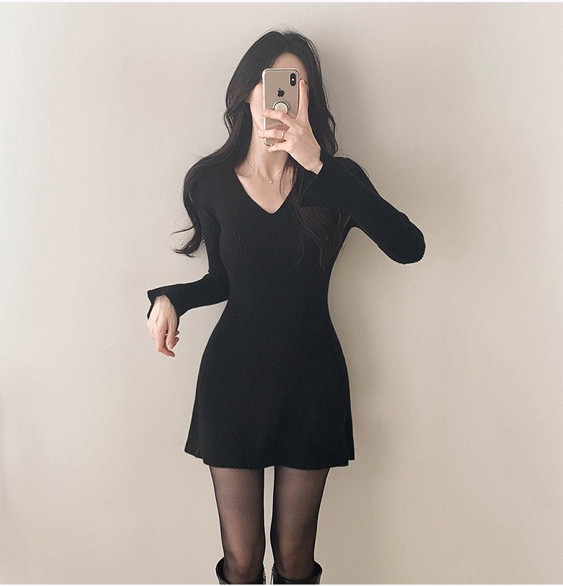 韩国东大门新品 女人味V领收腰针织纯色连衣裙