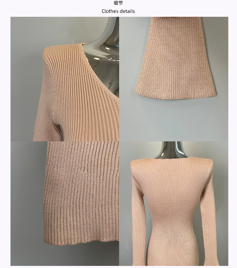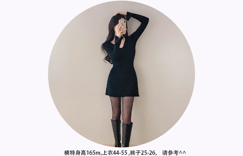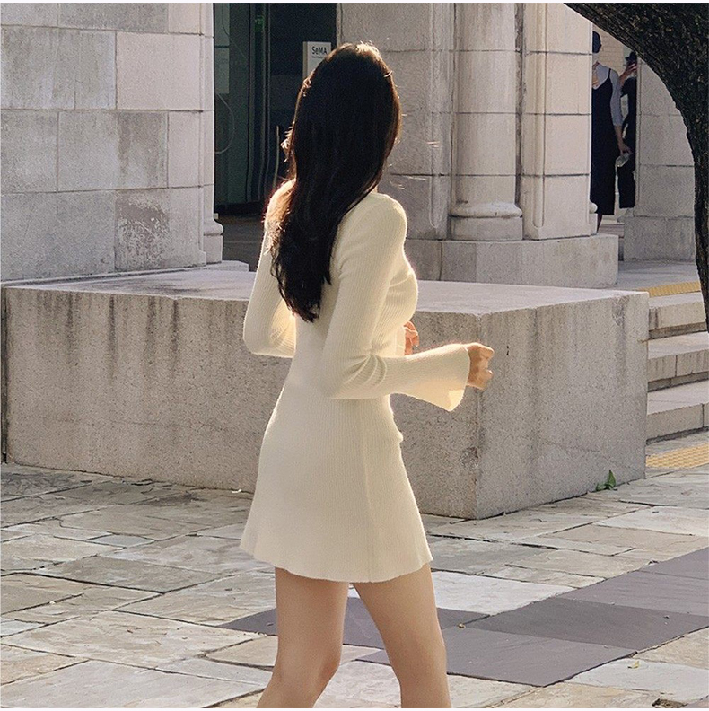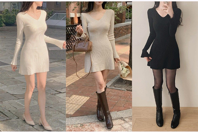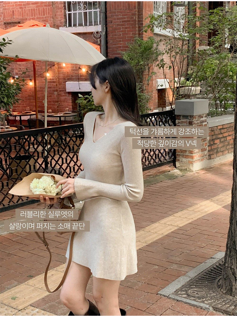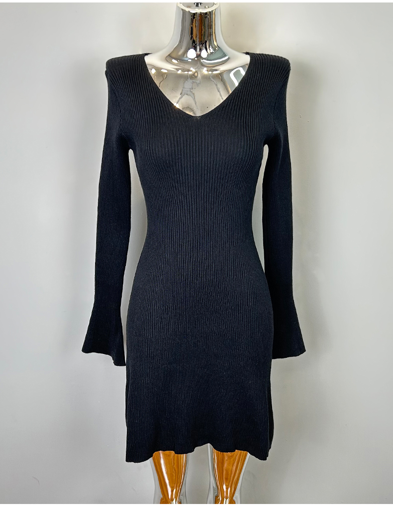 韩国东大门新品 女人味V领收腰针织纯色连衣裙
