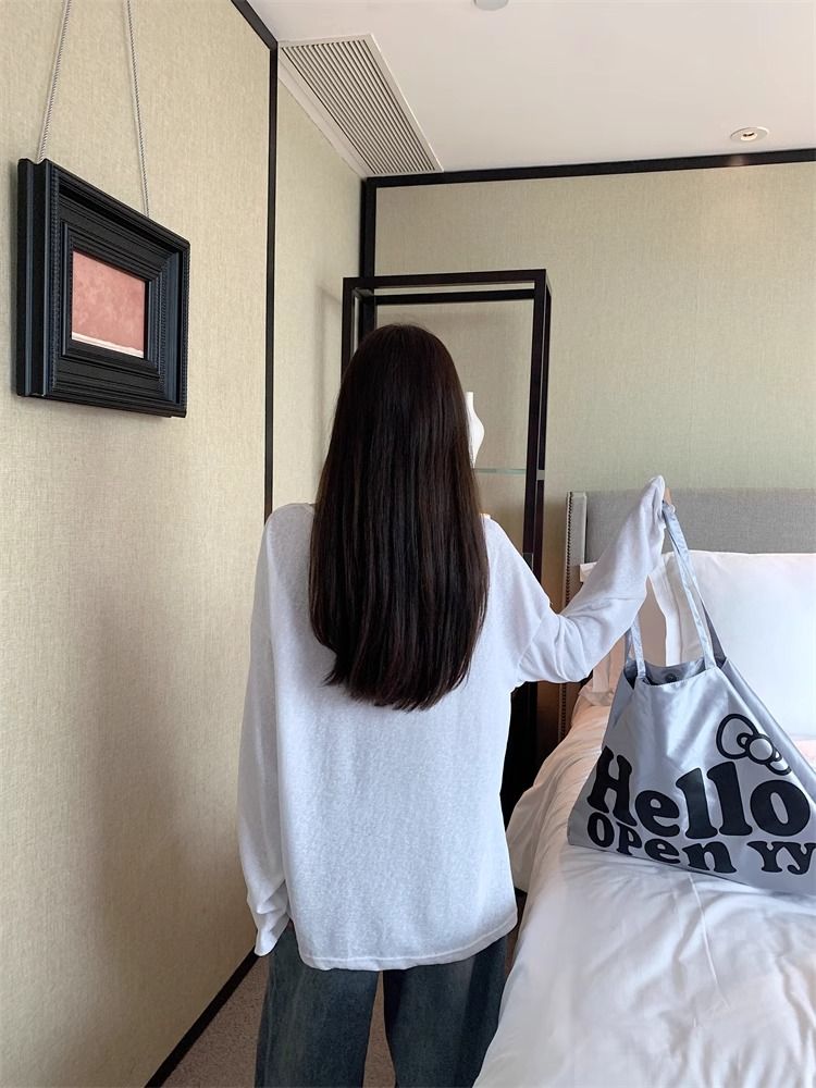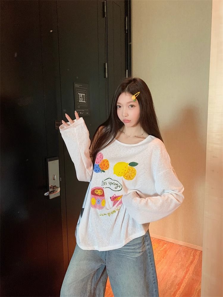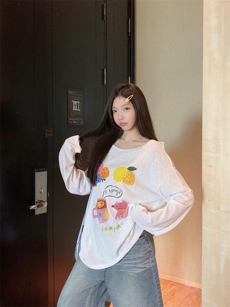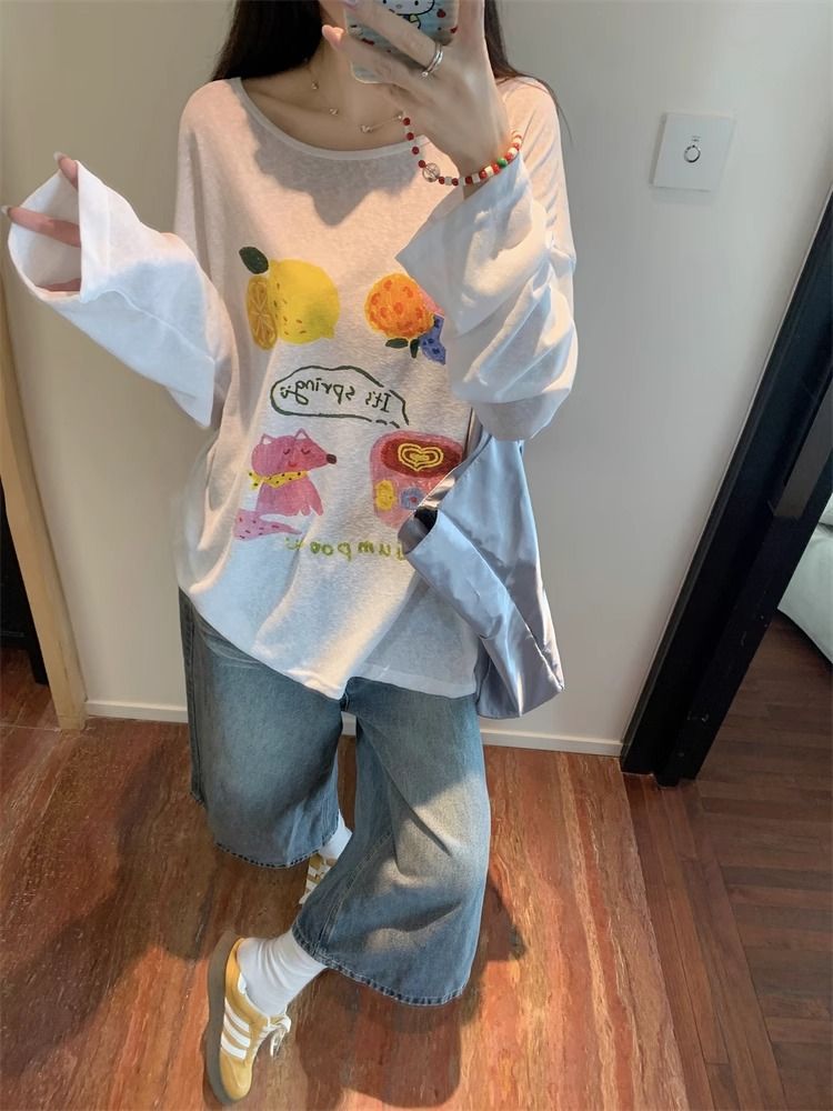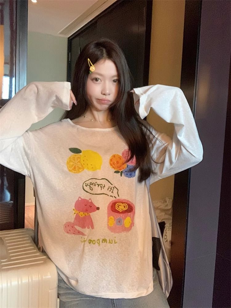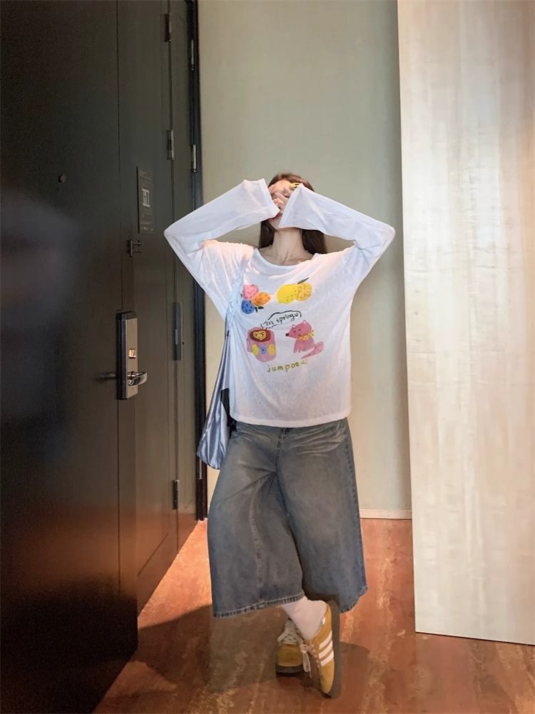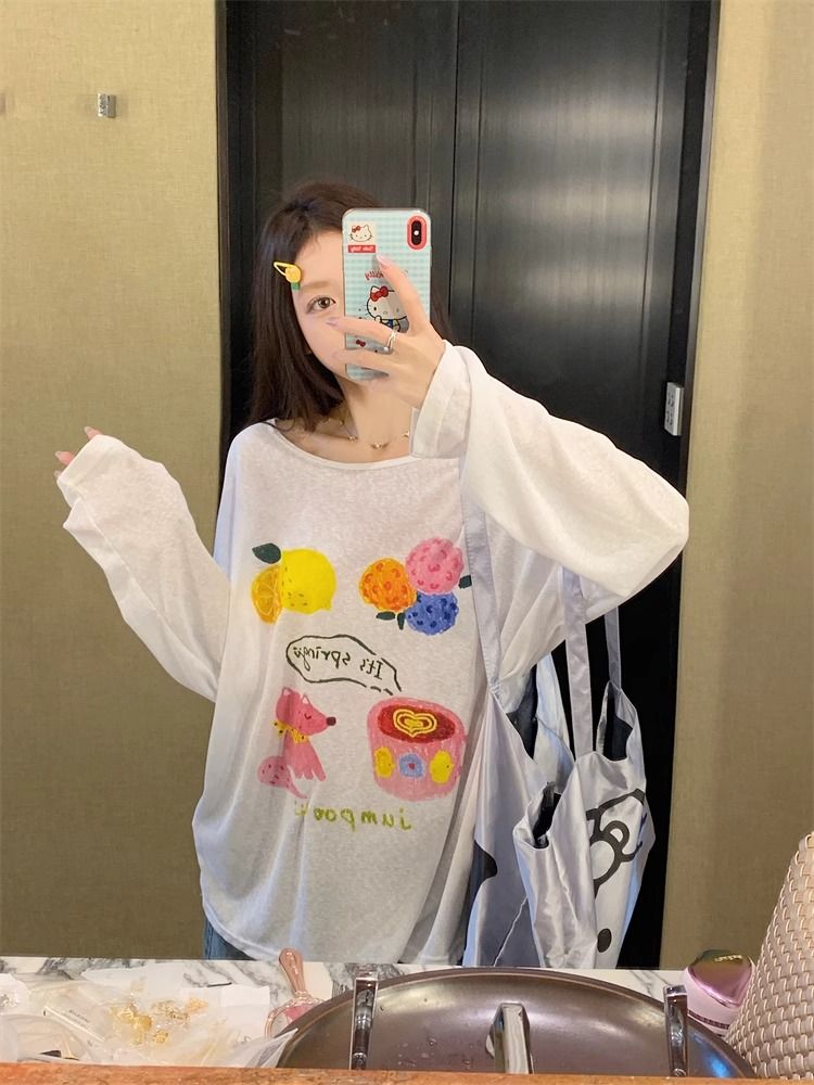 原版面料 慵懒风薄款长袖卡通印花T恤夏季轻薄透气宽松休闲上衣女