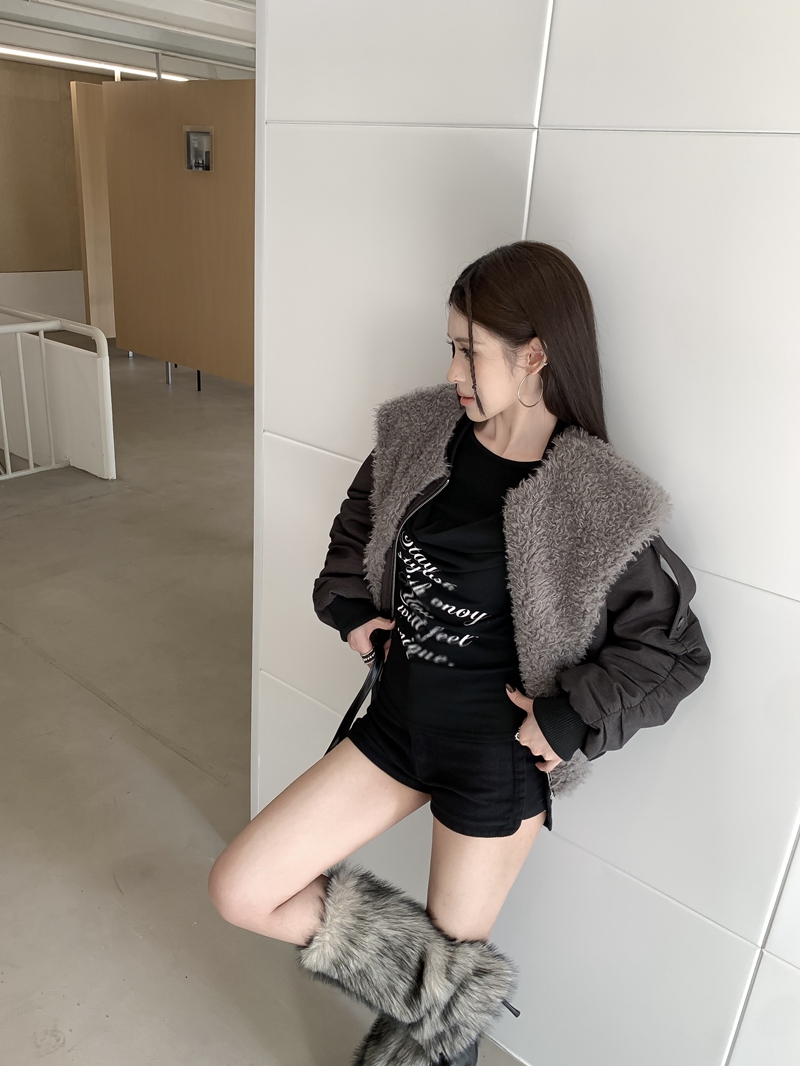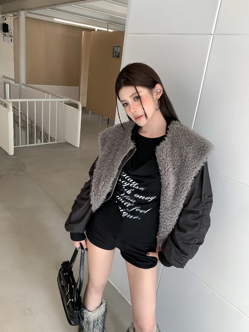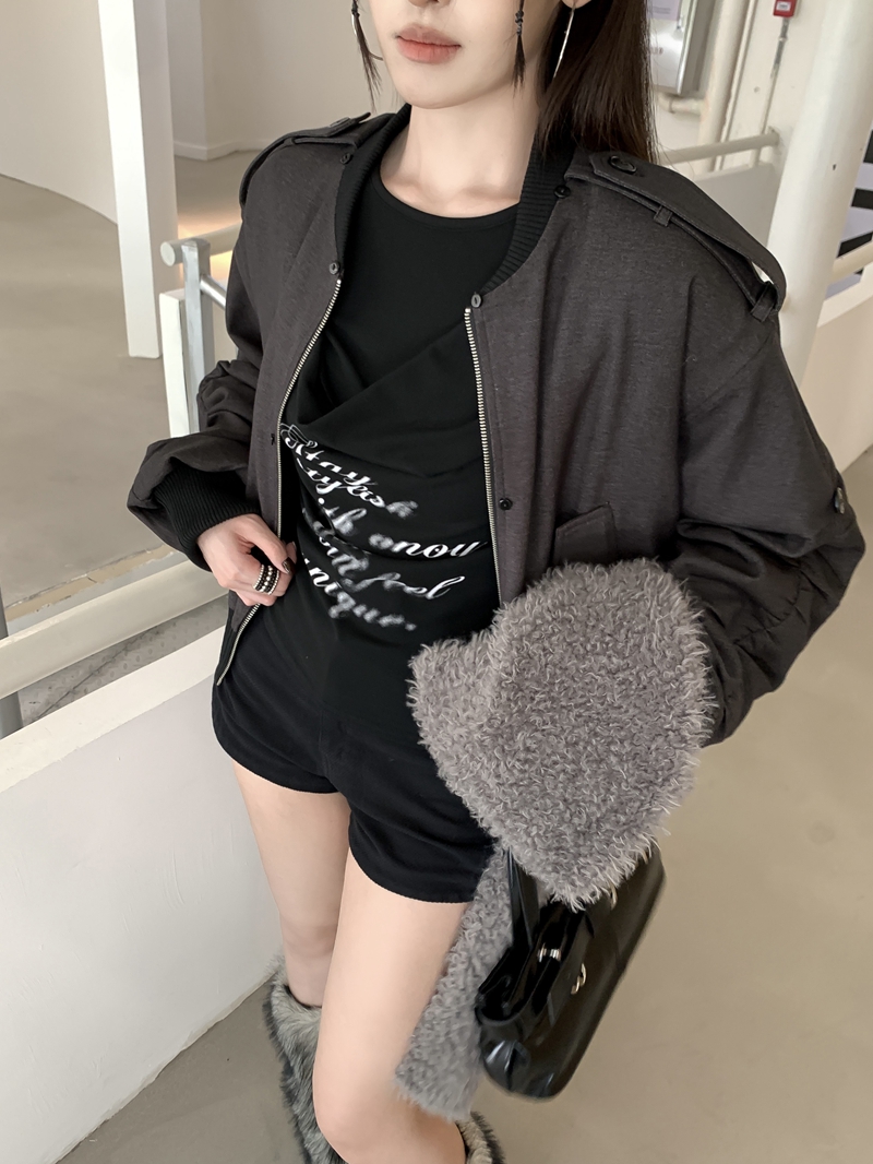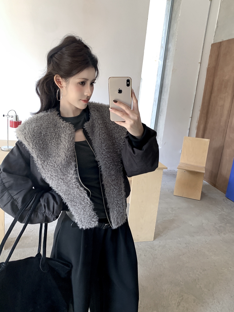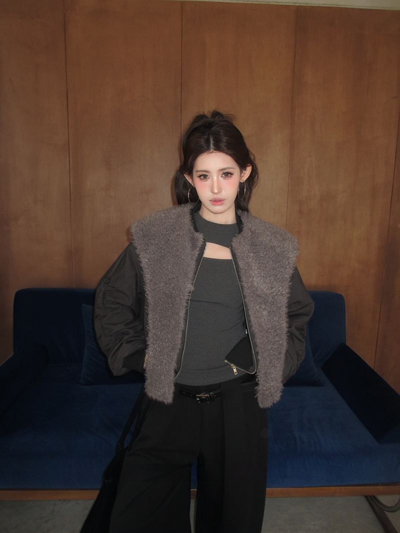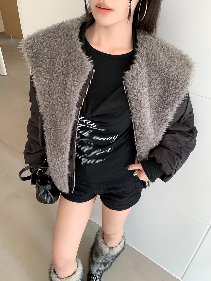 实拍实价辣妹可拆卸毛毛领拼接拉链派克服长袖宽松夹棉短款外套女