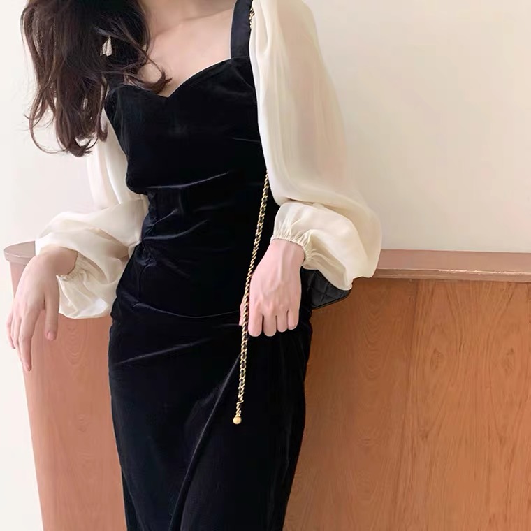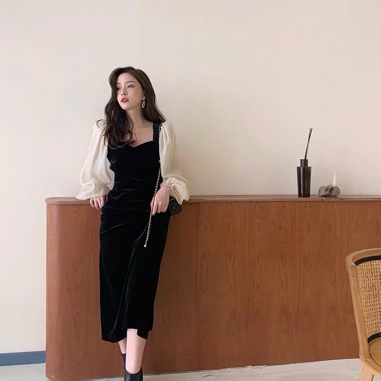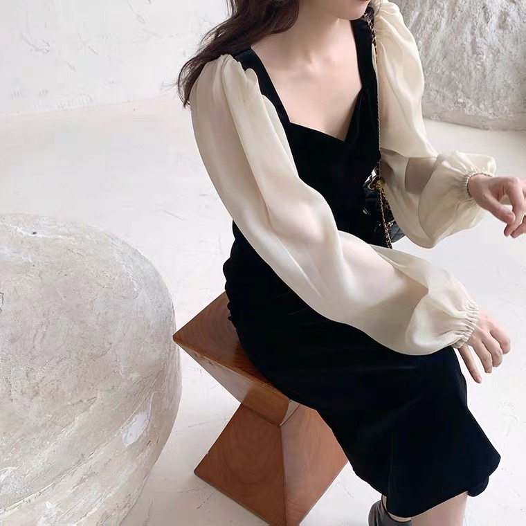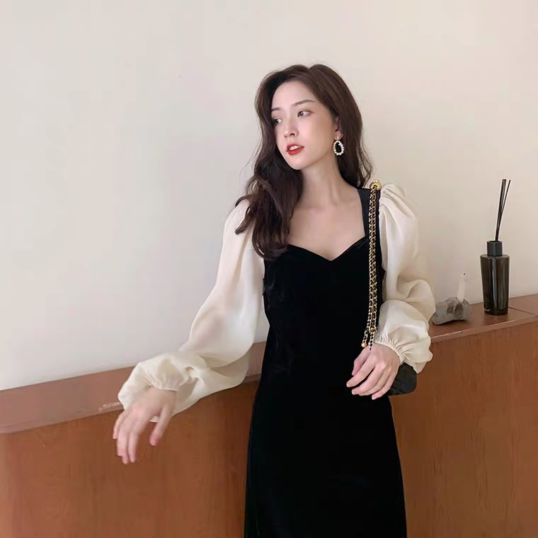 2026早春韩版金丝绒连衣裙方领泡泡袖大码显瘦连衣裙